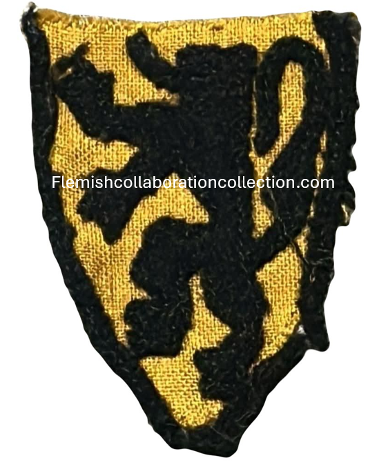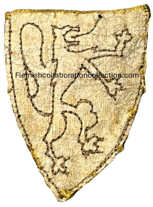 Flemish Legion lion shield of German manufacture. After the formation of the Langemarck Storm Brigade, this lion shield was sometimes still worn by veterans of the Flemish Legion on their Langemarck uniforms. This was logical, as many already had their uniforms and only needed to change their cuff title from “Legion Flandern” to “Langemarck.”