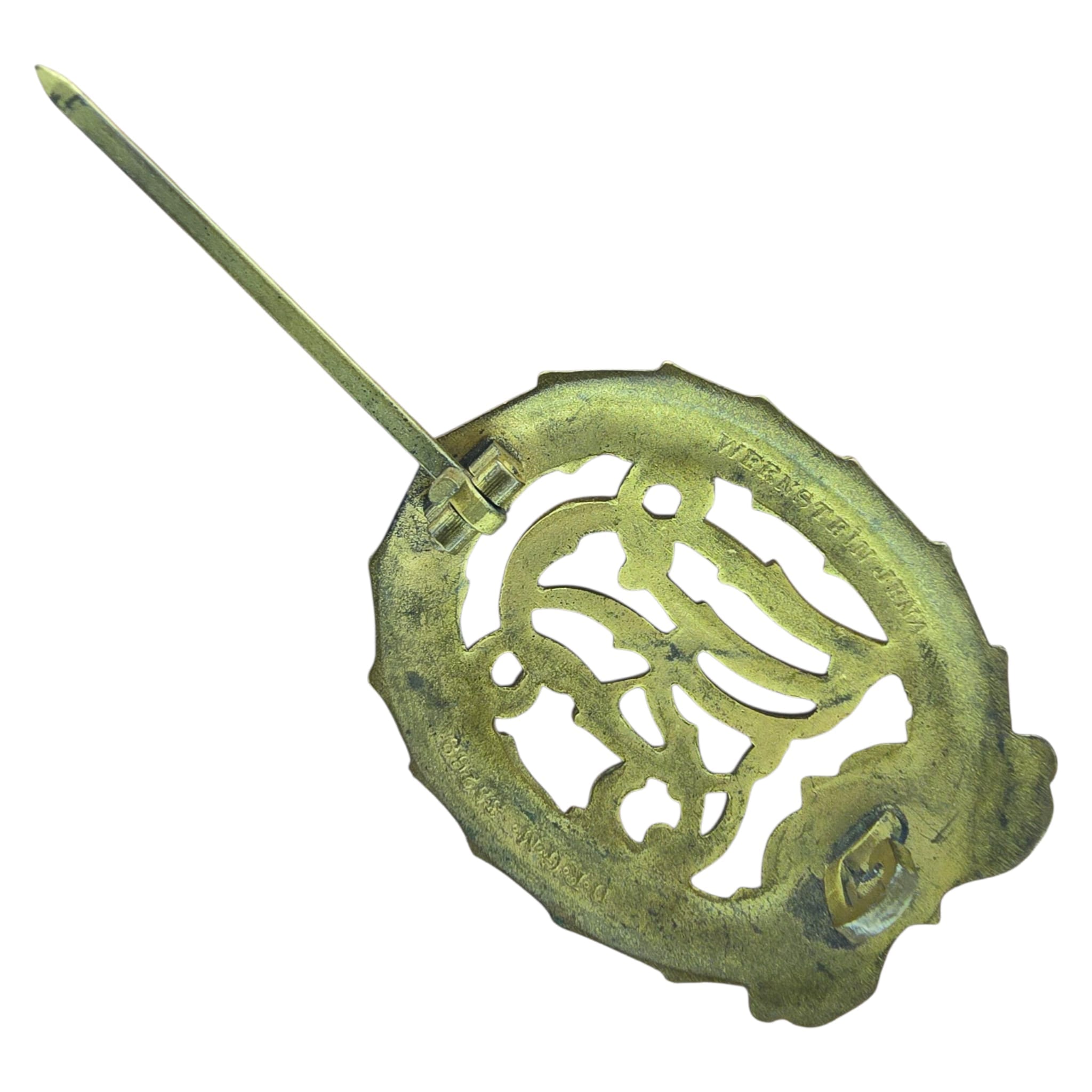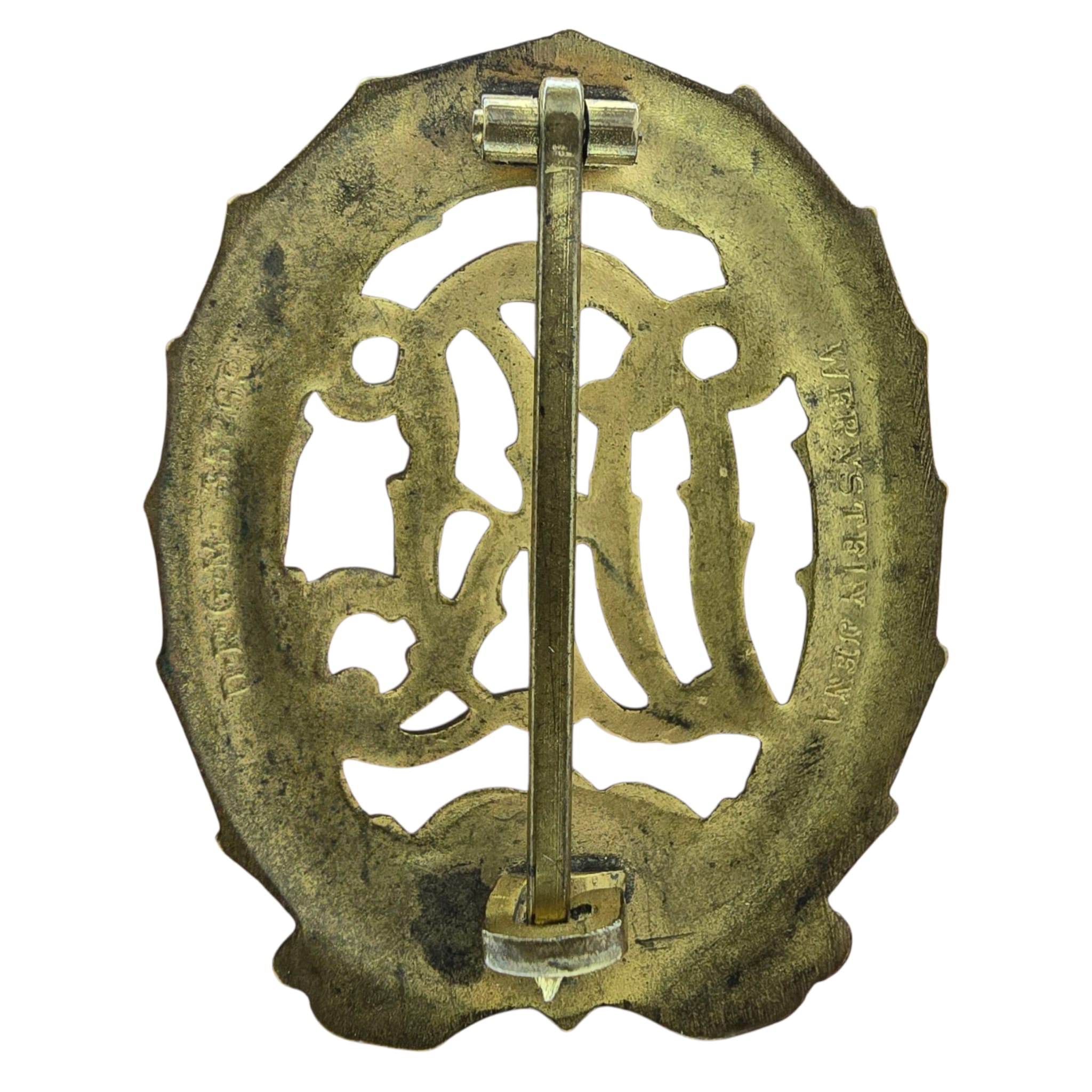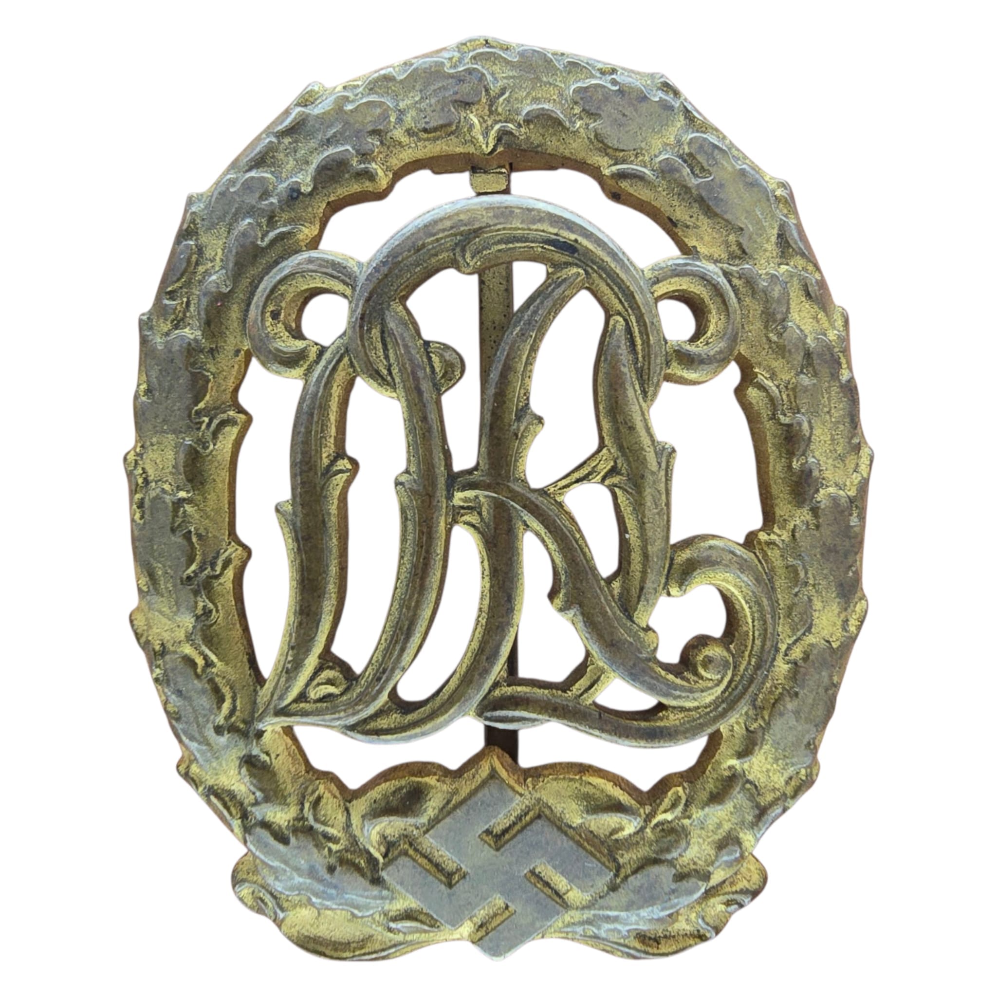 Item: The DRL Sport Badge In Gold D.R.G.M 35269 Wernstein Jena (Deutsches Reichssportabzeichen) was an award insignia issued by the Nazi regime to German citizens who had achieved outstanding performances in athletic activities. It was originally established in 1920 by the Deutsche Reichsbund für Leibesübungen (DRL), but was later adapted and became an important symbol under the Nazis. The goal was not only to recognize athletic achievements but also to promote the physical fitness of the German population, which was a key aspect of Nazi ideology.
