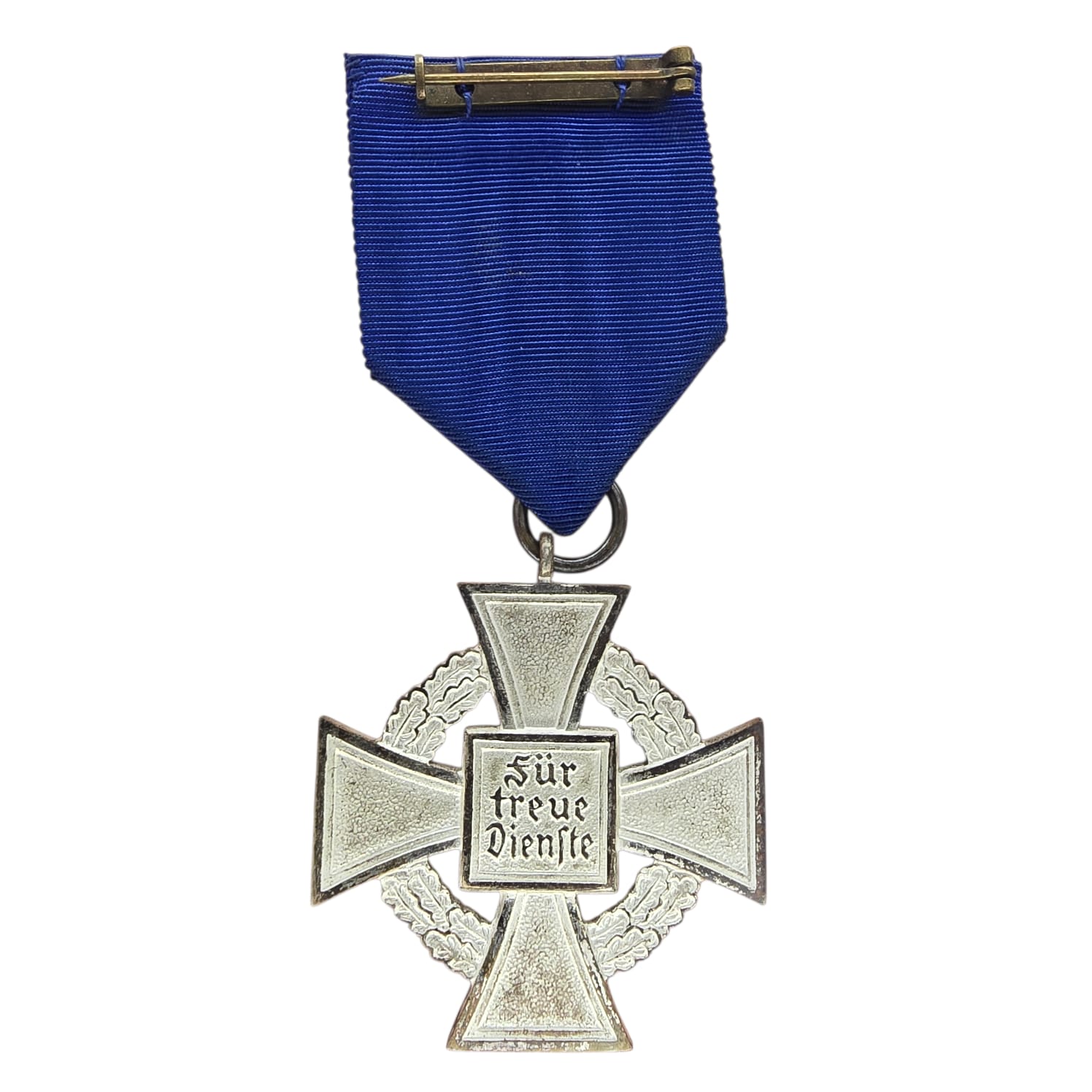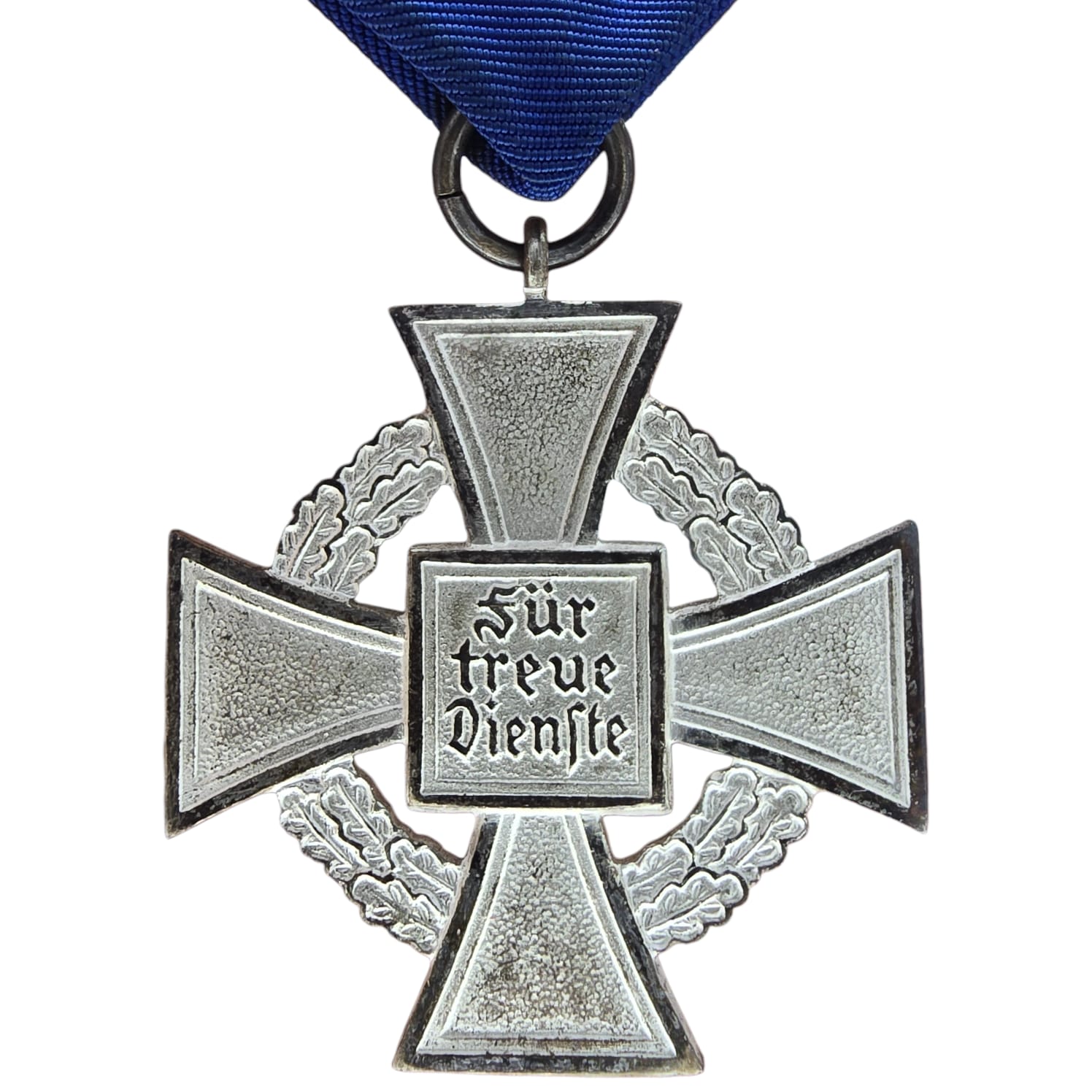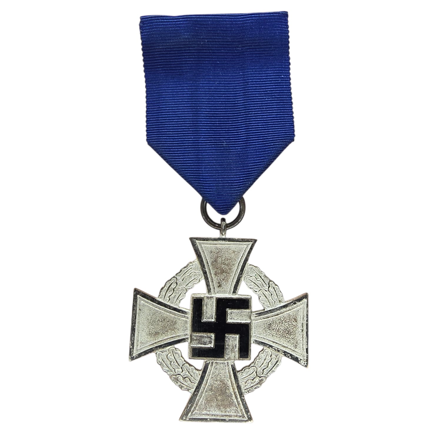 The 25-Year Faithful Service Medal was a silver cross with a black enamel swastika in the center, surrounded by a silver wreath. The reverse side had the inscription Für treue Dienste (“For Faithful Service”). It was worn on a blue ribbon.