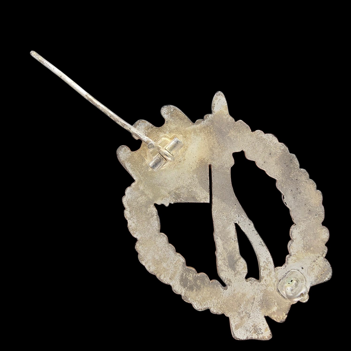 Item: The Infantry Assault Badge (German: Infanterie-Sturmabzeichen) was a German military decoration awarded to Waffen-SS and Wehrmacht Heer soldiers during World War II. This decoration was instituted on December 20, 1939 by the Commander-in-Chief (Oberbefehlshaber) of the German Army, Generalfeldmarschall Walther von Brauchitsch. The award could be recognized to members of infantry and Gebirgsjäger (mountain infantry) units who had demonstrated with light infantry weapons in infantry attacks on ten at least three days of battle in the front line after January 1, 1940. It could also apply . The award of the Infantry Assault Badge was authorized at the regimental command level, and mechanized or motorized infantry were not eligible for the original badge. In June 1940, a bronze variant of the Infantry Assault Badge was created, approved for motorized and mechanized infantry units, with any requirements for award being applied as the original silver variant. Non-infantry personnel were not eligible for either grade of the Infantry Assault Badge, but were eligible for other combat recognition badges (depending on their military occupation, branch of service and recognized unit), most commonly the General Assault Badge, Close Combat Clasp , from the trouser badge. The Luftwaffe would develop its own ground combat badge in 1942, the Ground Assault Badge.