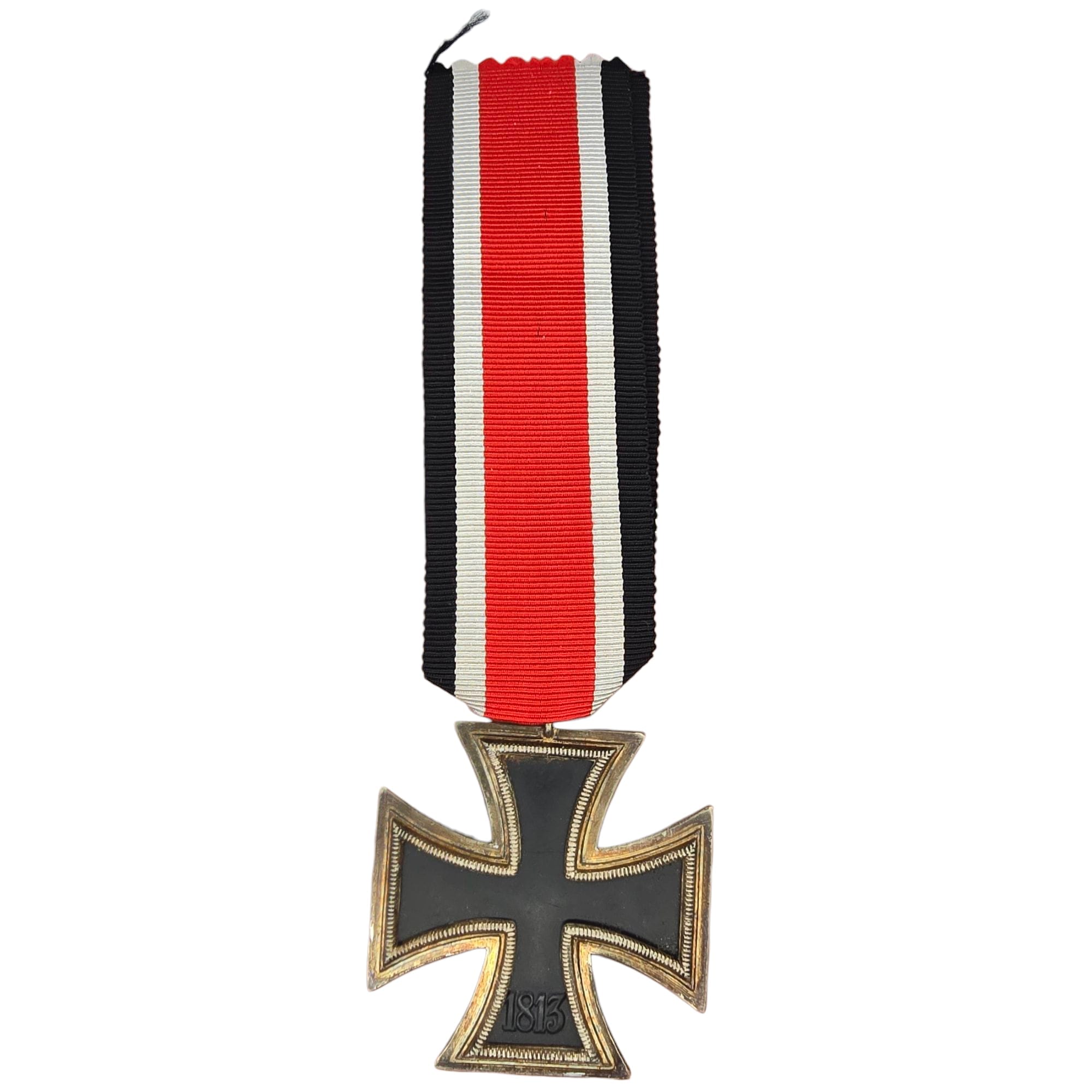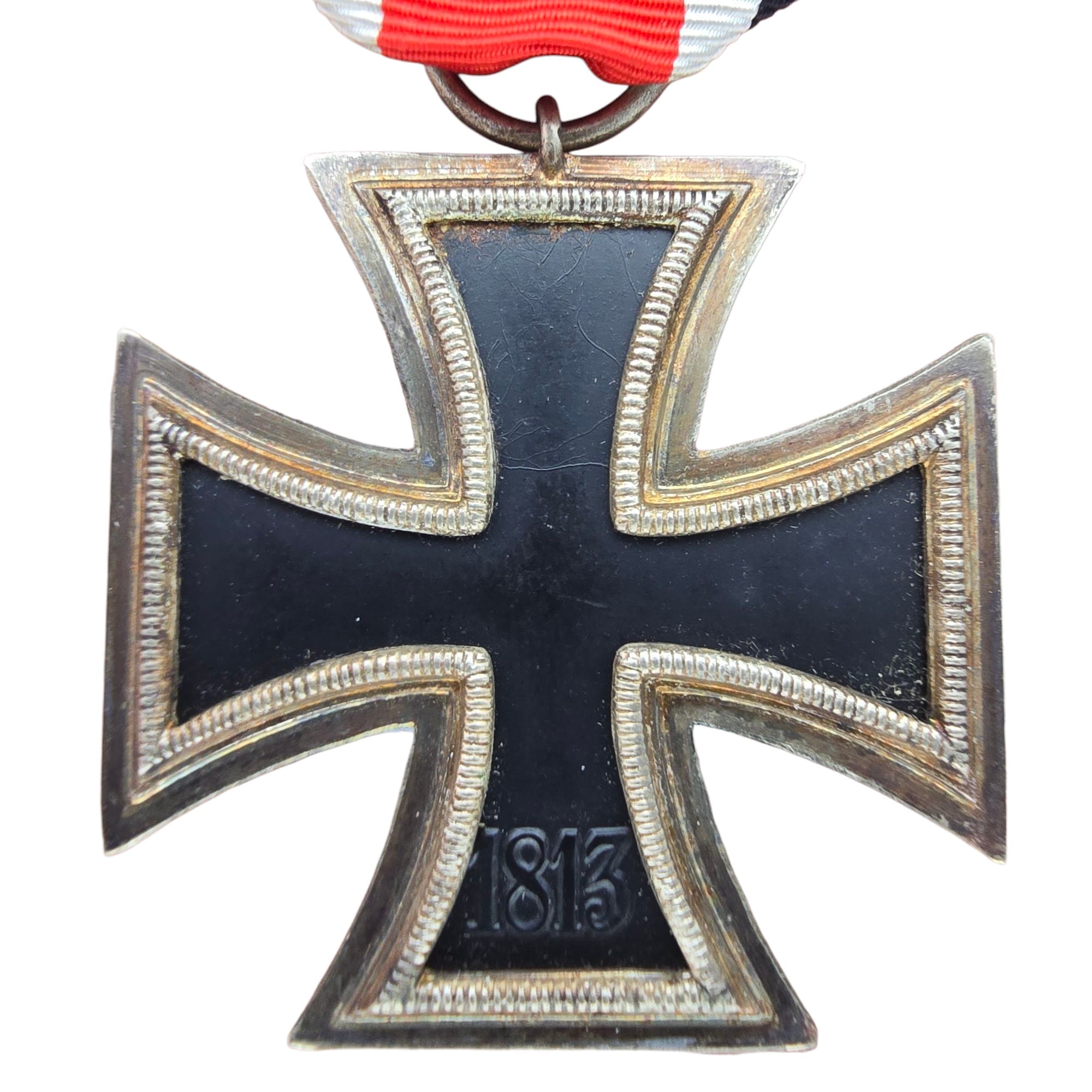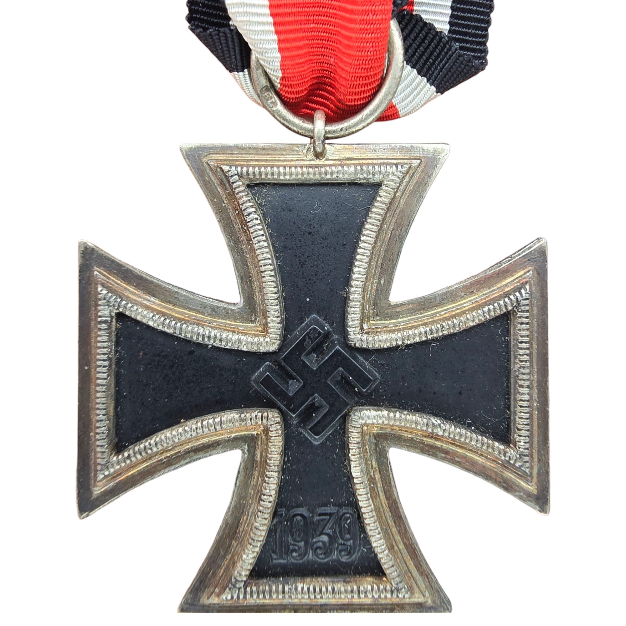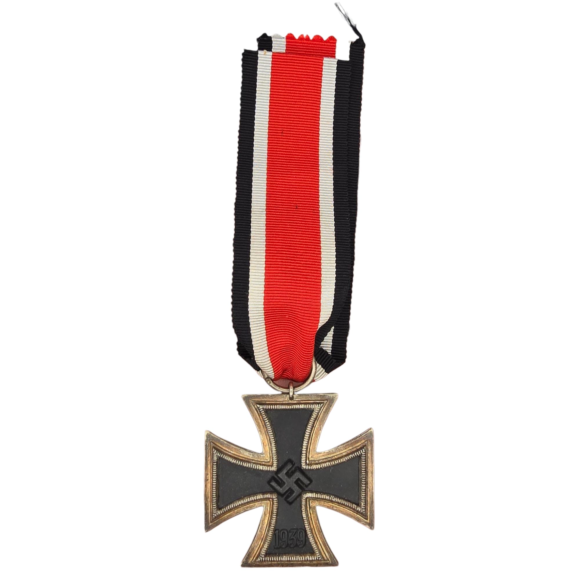 Item: IJzeren Kruis tweede klasse – Maker gemarkeerd met "24" Arbeitsgemeinschaft der Hanauer Plaketten-Hersteller met lint. Op 1 september 1939 voerde Hitler het IJzeren Kruis opnieuw in (voor de eerste keer in 1813). Het 2e klasse kruis was bedoeld voor personeel dat tijdens een gevecht ook maar één daad van moed had verricht.