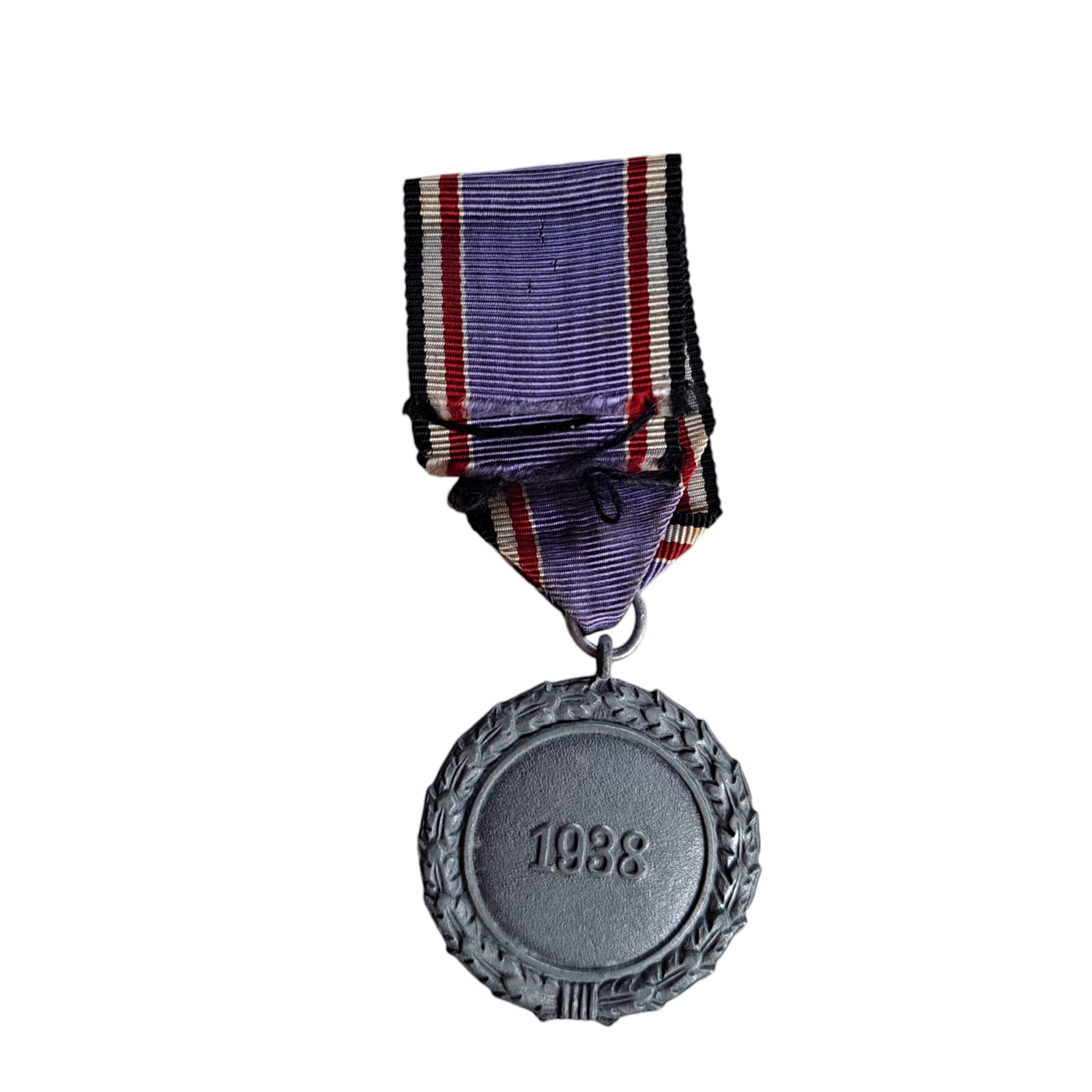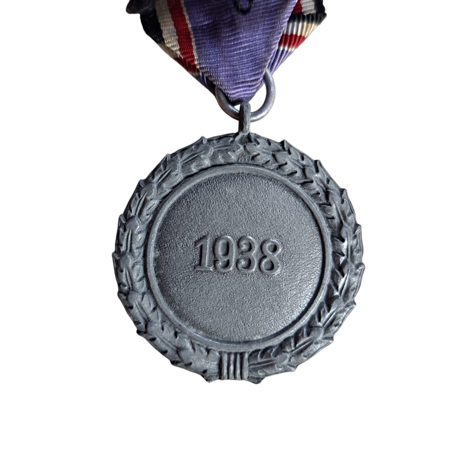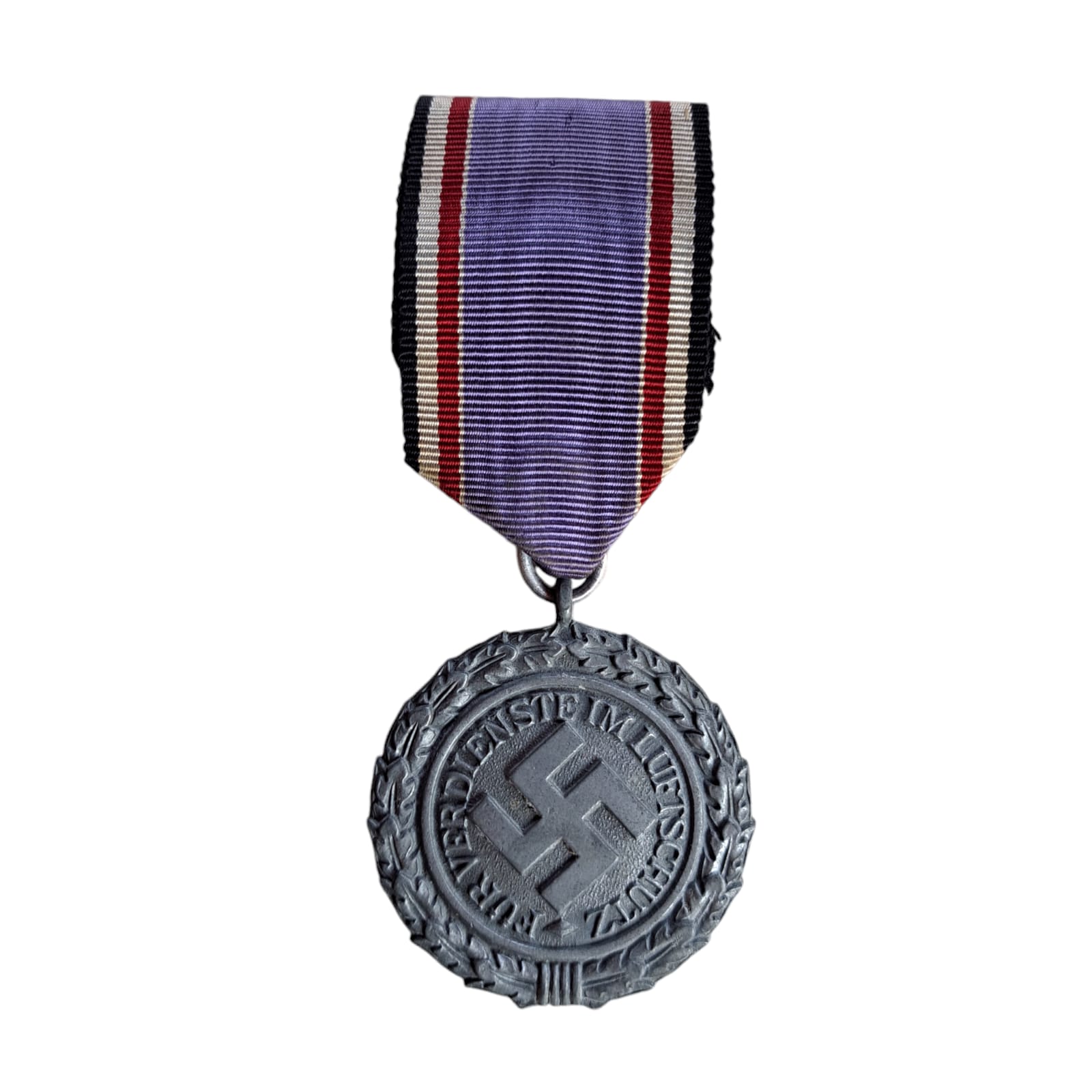 Item: Air Defence Luftschutz Medal 2nd Class, constructed in silvered zinc alloy complete with a red, white, and black ribbon and clasp on the reverse. The obverse of the medal consists of a round oak wreath with a canted swastika in the centre of the medal inscribed with “Für Dienste im Luftschutz” (For Services in Air Raid Protection) around the outer edge. The reverse of the medal is inscribed with “1938” in the centre surrounded by an oak wreath