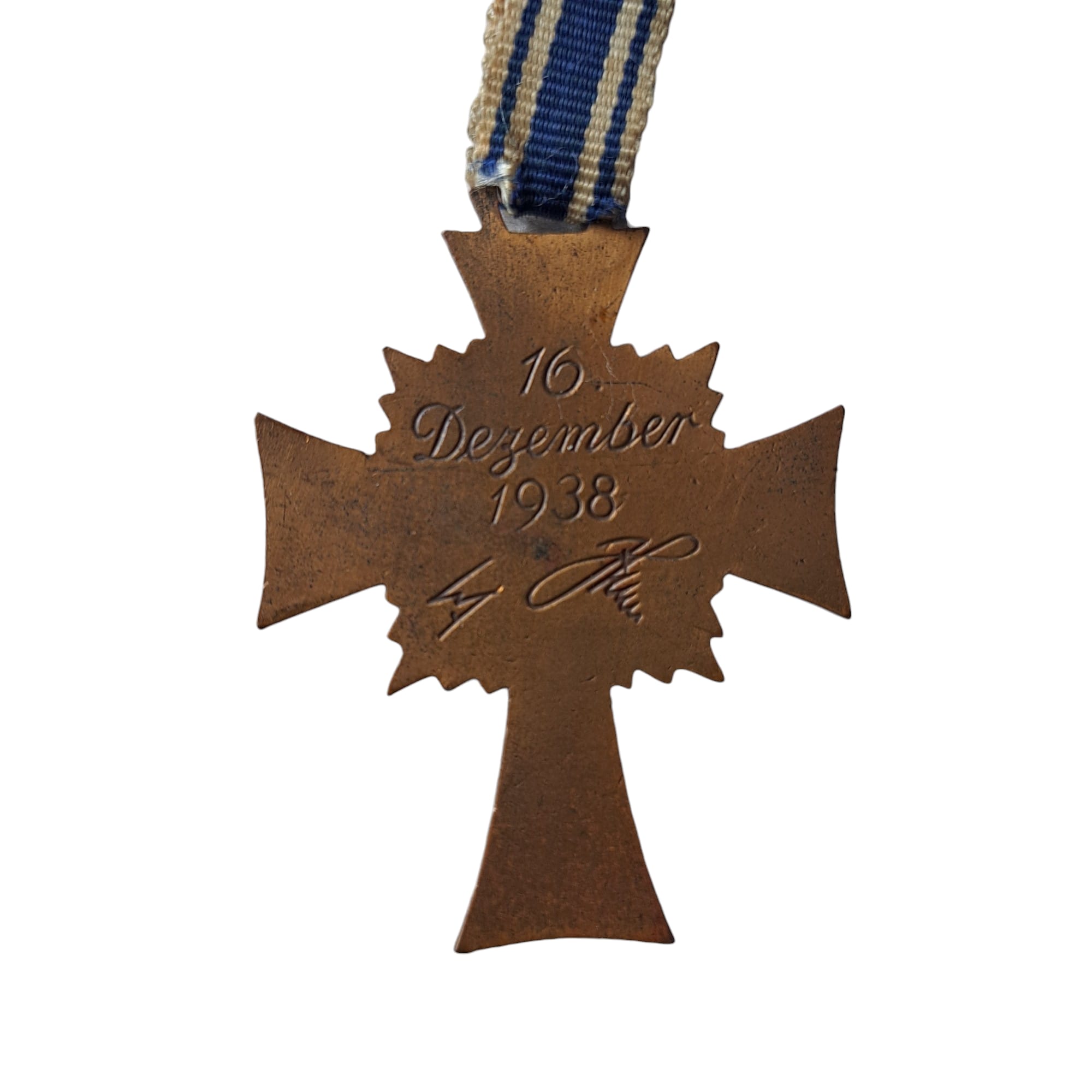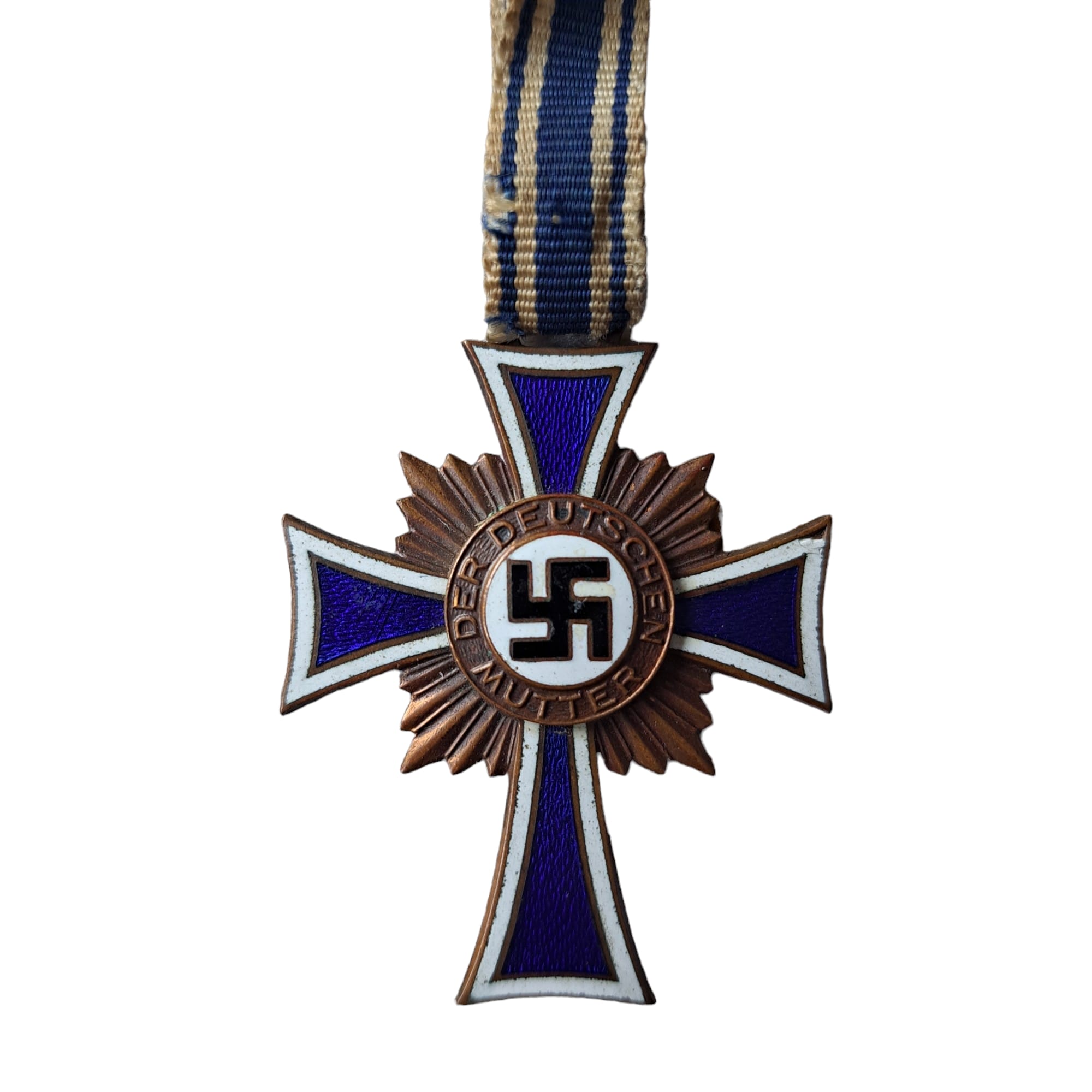 Item: The Cross of Honour of the German Mother (German: Ehrenkreuz der Deutschen Mutter), referred to colloquially as the Mutterehrenkreuz (Mother’s Cross of Honour) or simply Mutterkreuz (Mother’s Cross), was a state decoration conferred by the government of the German Reich to honour a Reichsdeutsche German mother for exceptional merit to the German nation. Eligibility later extended to include Volksdeutsche (ethnic German) mothers from, for example, Austria and Sudetenland, that had earlier been incorporated into the German Reich.