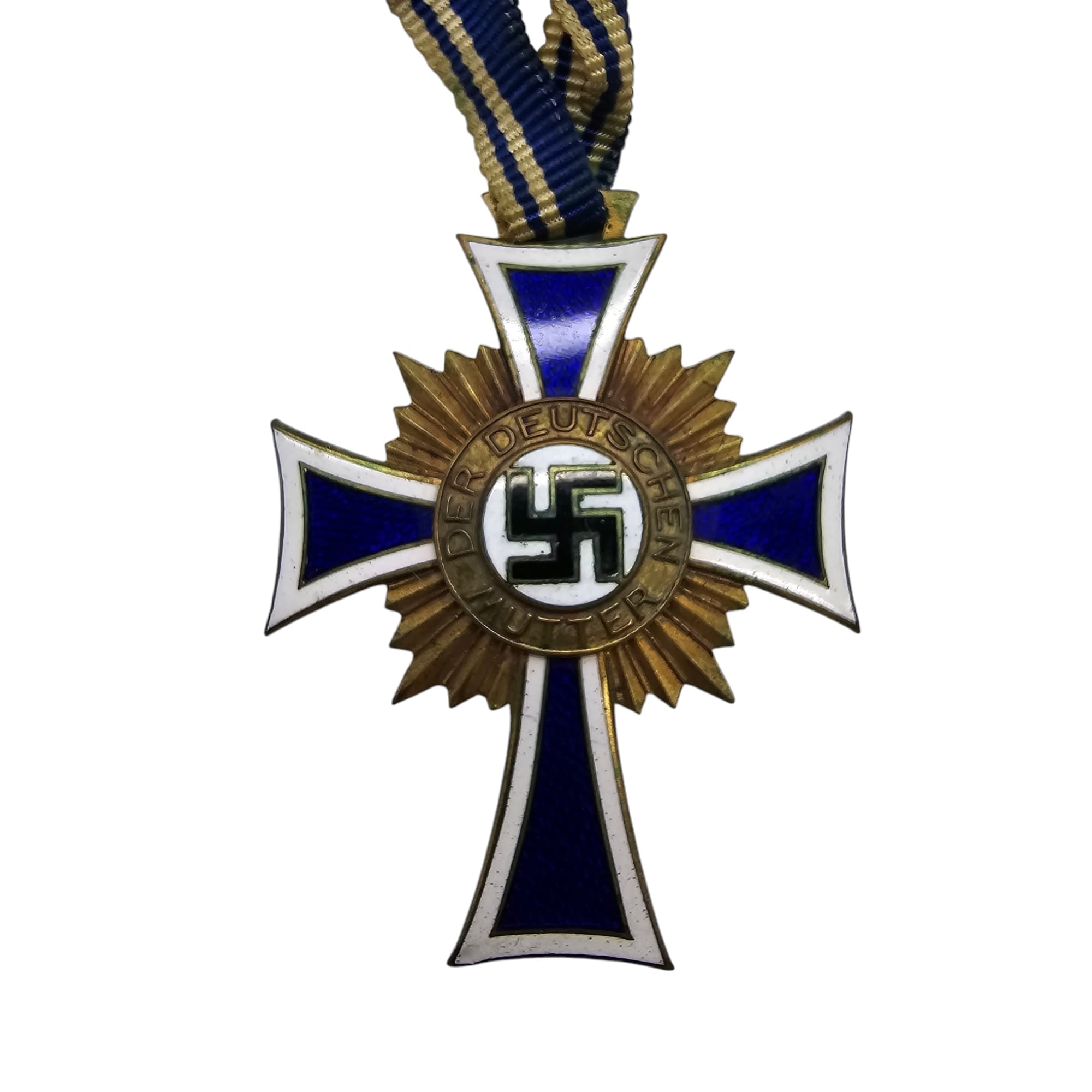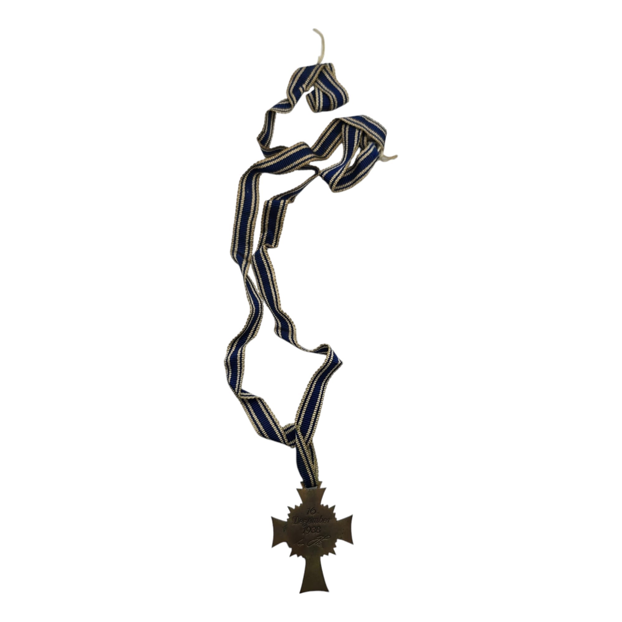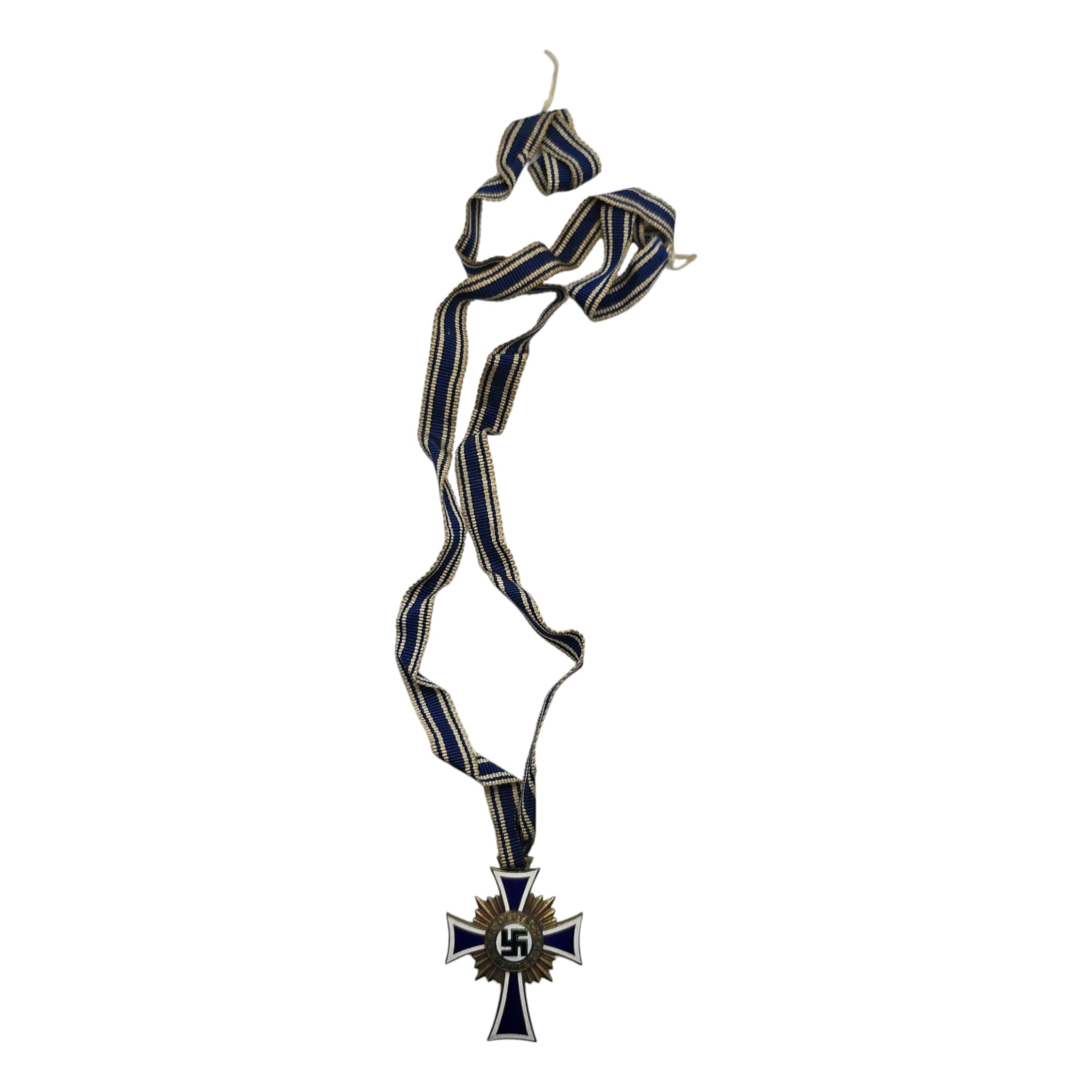 Item: The Cross of Honour of the German Mother (German: Ehrenkreuz der Deutschen Mutter), referred to colloquially as the Mutterehrenkreuz (Mother’s Cross of Honour) or simply Mutterkreuz (Mother’s Cross), was a state decoration conferred by the government of the German Reich to honour a Reichsdeutsche German mother for exceptional merit to the German nation. Eligibility later extended to include Volksdeutsche (ethnic German) mothers from, for example, Austria and Sudetenland, that had earlier been incorporated into the German Reich.