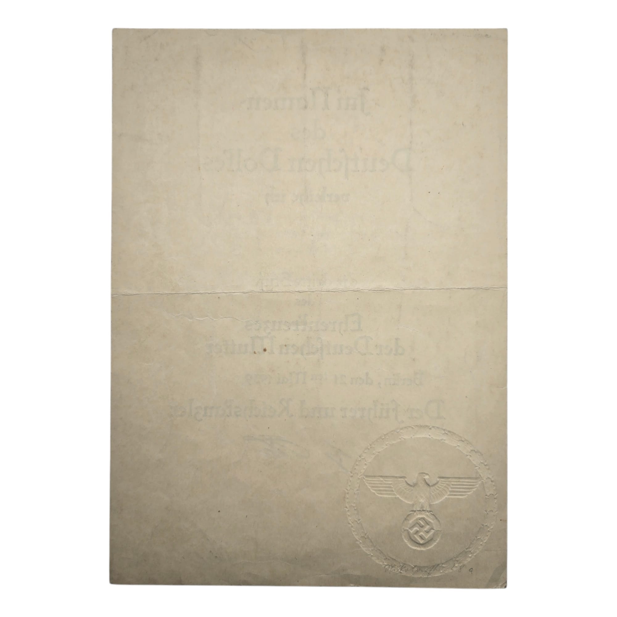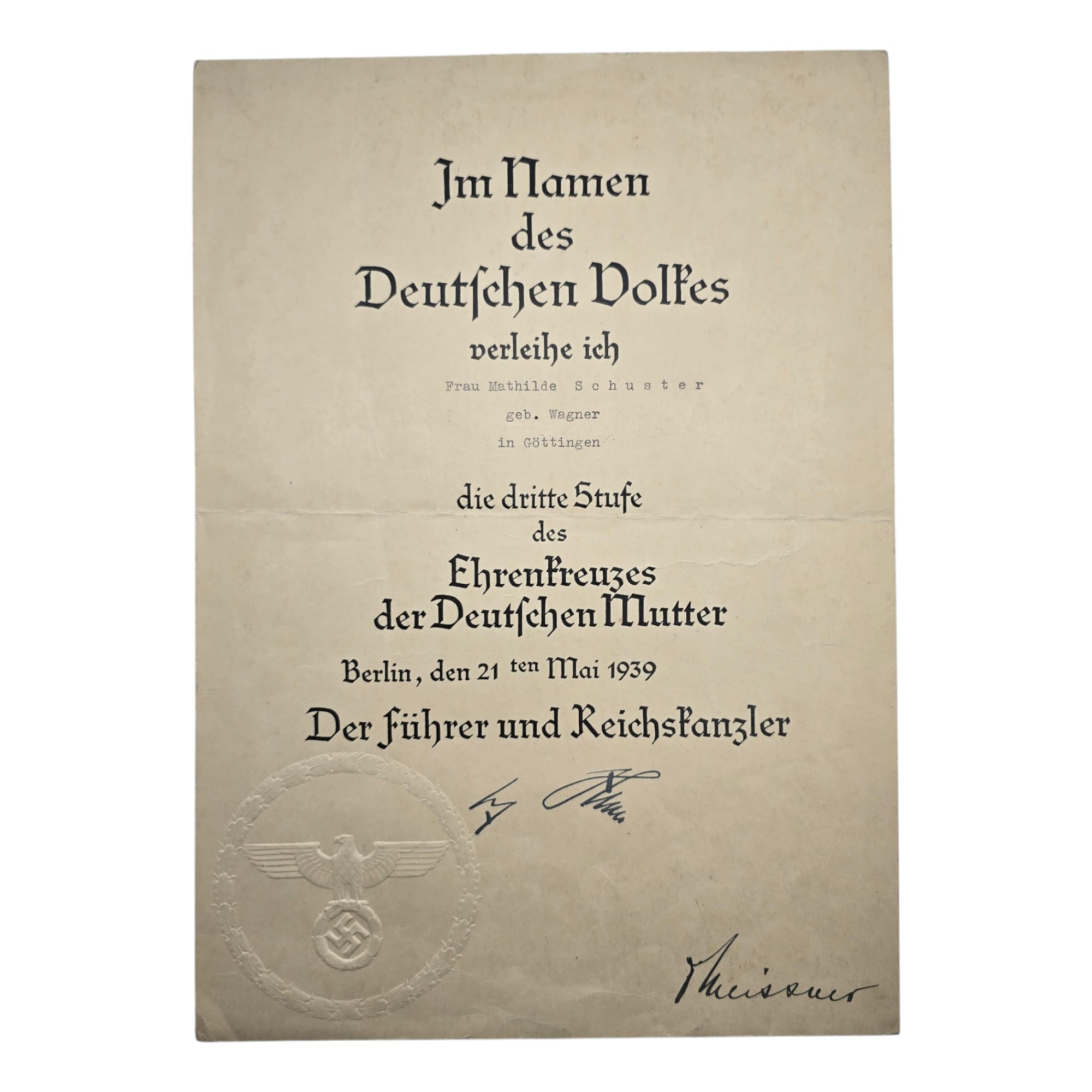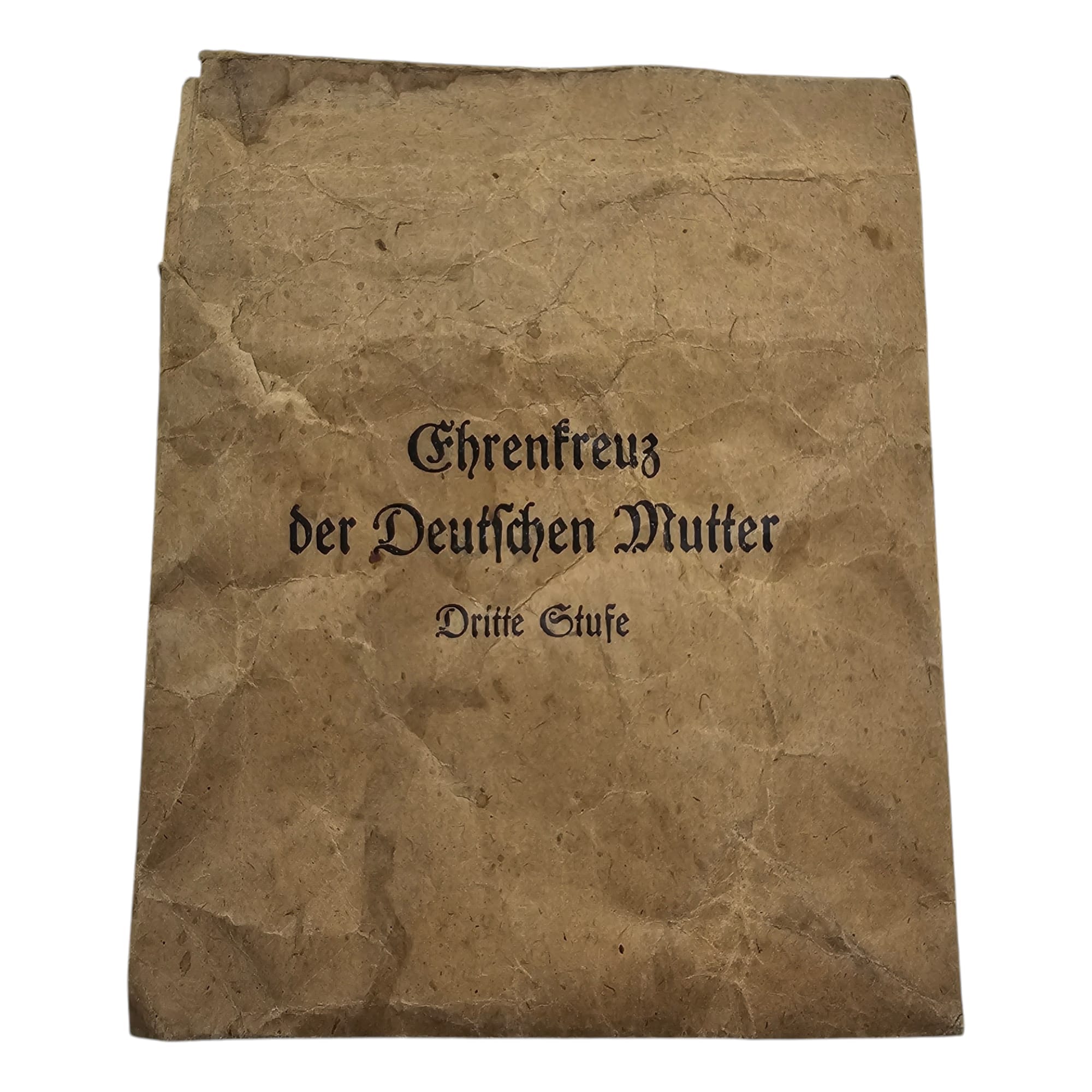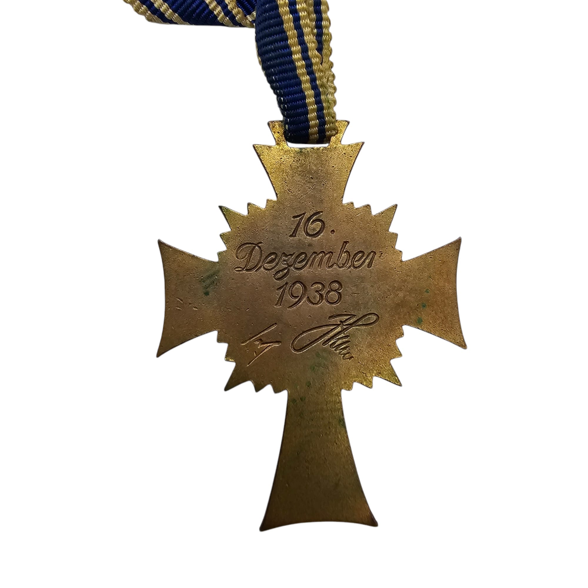 Item: The Cross of Honour of the German Mother (German: Ehrenkreuz der Deutschen Mutter), referred to colloquially as the Mutterehrenkreuz (Mother’s Cross of Honour) or simply Mutterkreuz (Mother’s Cross), was a state decoration conferred by the government of the German Reich to honour a Reichsdeutsche German mother for exceptional merit to the German nation. Eligibility later extended to include Volksdeutsche (ethnic German) mothers from, for example, Austria and Sudetenland, that had earlier been incorporated into the German Reich.
