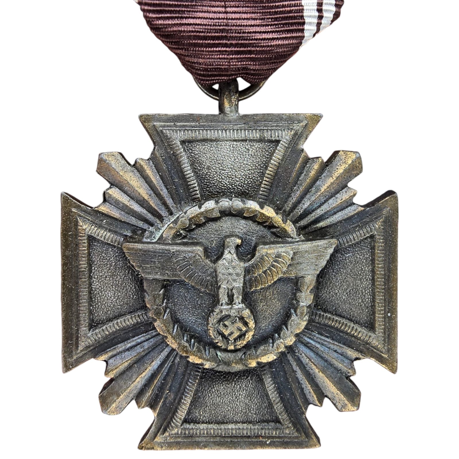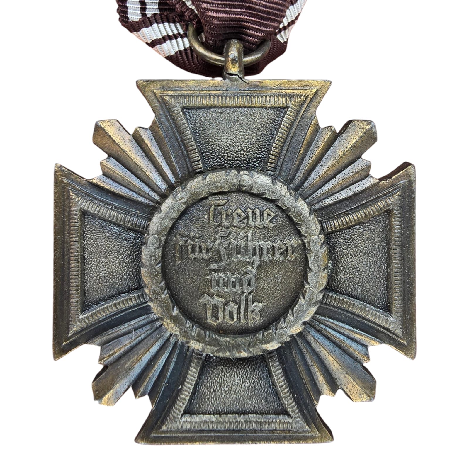 Item: NSDAP 10 years long service medal in Bronze in box (NSDAP – Dienstauszeichnung in Bronze – 3. Stufe für 10 Jahre Treue Dienst). The NSDAP loyal service medals were instituted in three classes on April 2, 1939, to distinguish members for long continuous membership. Membership of the NSDAP between February 1925 and January 1933, the so-called ‘Kampfzeit’, counted double. The three classes were as follows: 1st Class for 25 years of loyalty membership, 2nd Class for 15 years of membership and the 3rd Class for 10 years of membership.