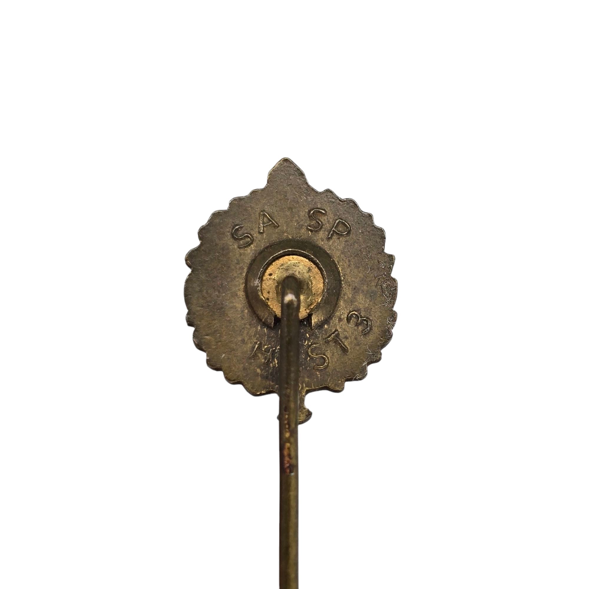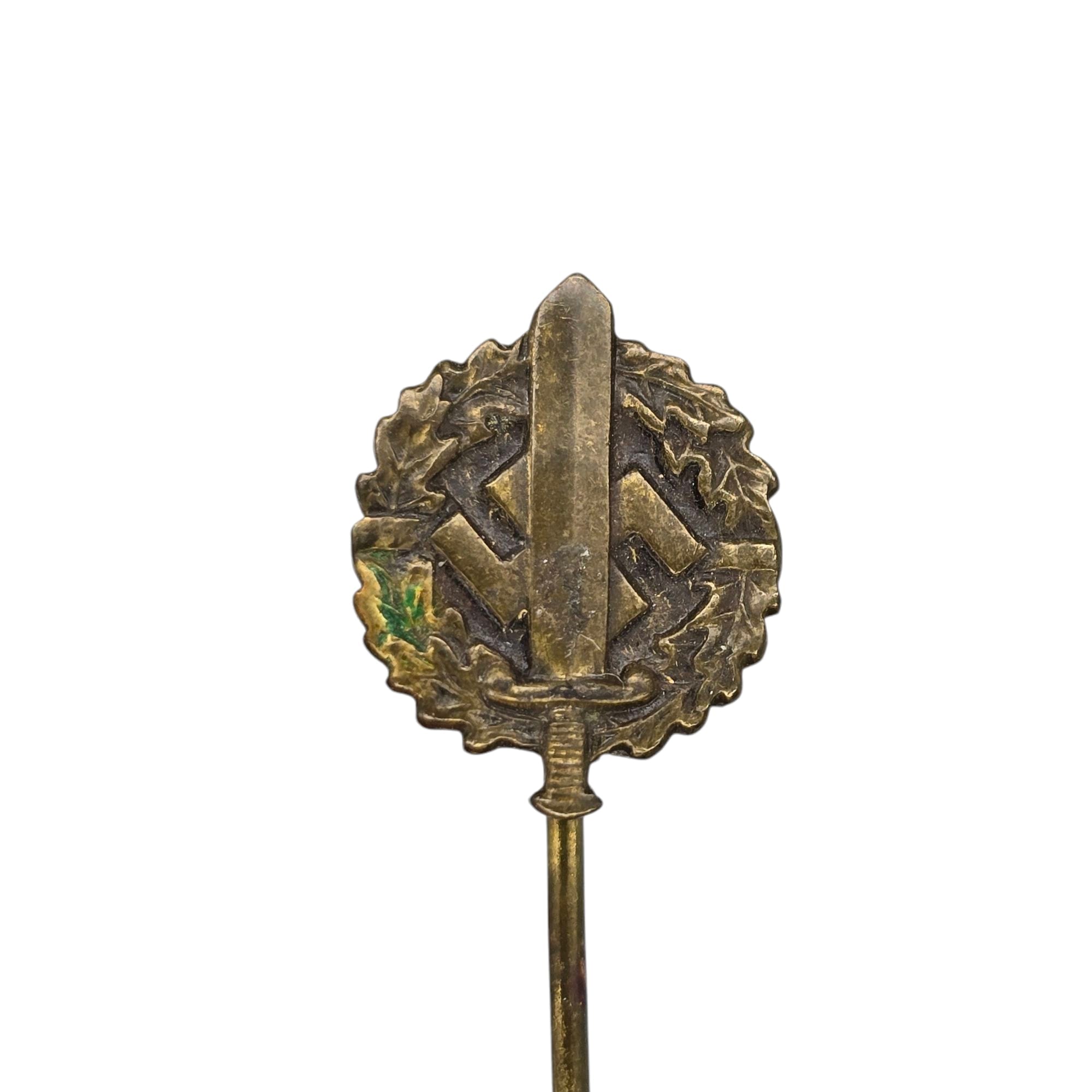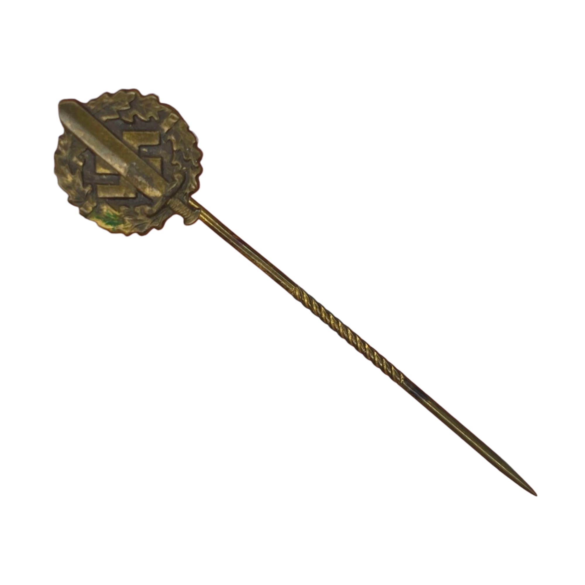 SA Sports Medal in Bronze (SA-Sportabzeichen). The SA (Sturmabteilung) was founded in August 1921 as a protection unit of the political leaders of the NSDAP. The SA sports medal in bronze was instituted by SA Chief of Staff ‘Ernst Röhm’ on November 28, 1933, to distinguish SA and SS personnel who had achieved the set criteria (fitness, military defense, field exercises, etc.). this is a miniature stickpin for clothing