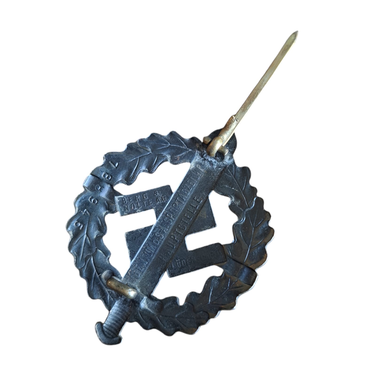 Item: SA Sportmedaille in Bronze (SA-Sportabzeichen). De SA (Sturmabteilung) werd opgericht in augustus 1921 als een beschermingseenheid van de politieke leiders van de NSDAP. De SA sportmedaille in bronze werd ingesteld door SA-Stabschef 'Ernst Röhm' op 28 November 1933, om SA en SS personeel welke de gestelde criteria (fitness, militaire verdediging, veldoefeningen etc) gehaald hadden mee te onderscheiden.