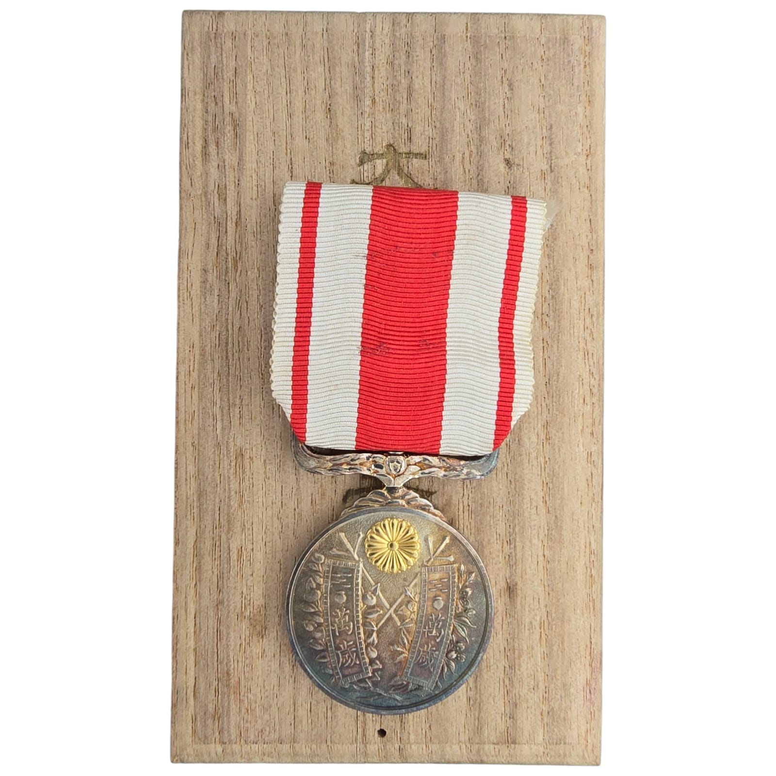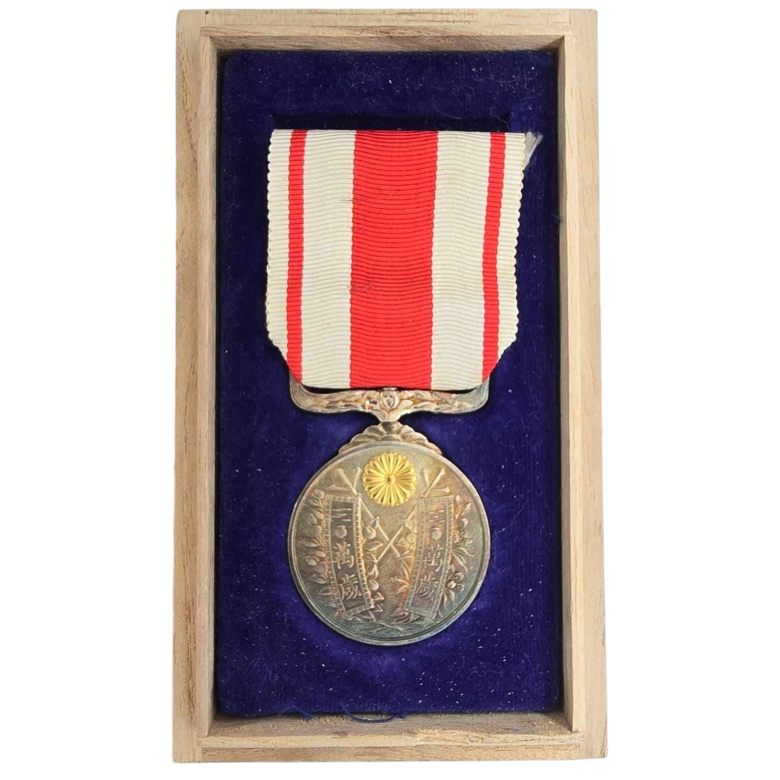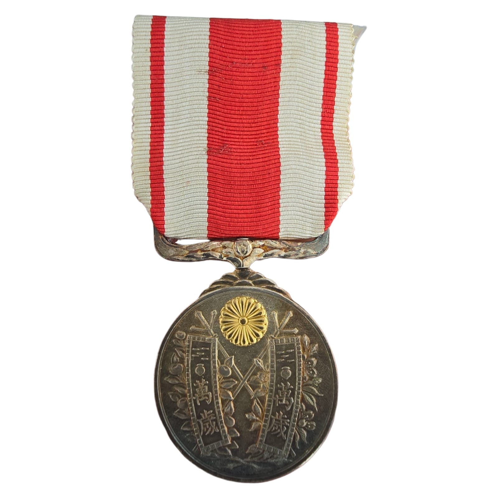 Item: The obverse of the medal shows imperial banners with ‘Banzai’ written within each. Branches of cherry and orange