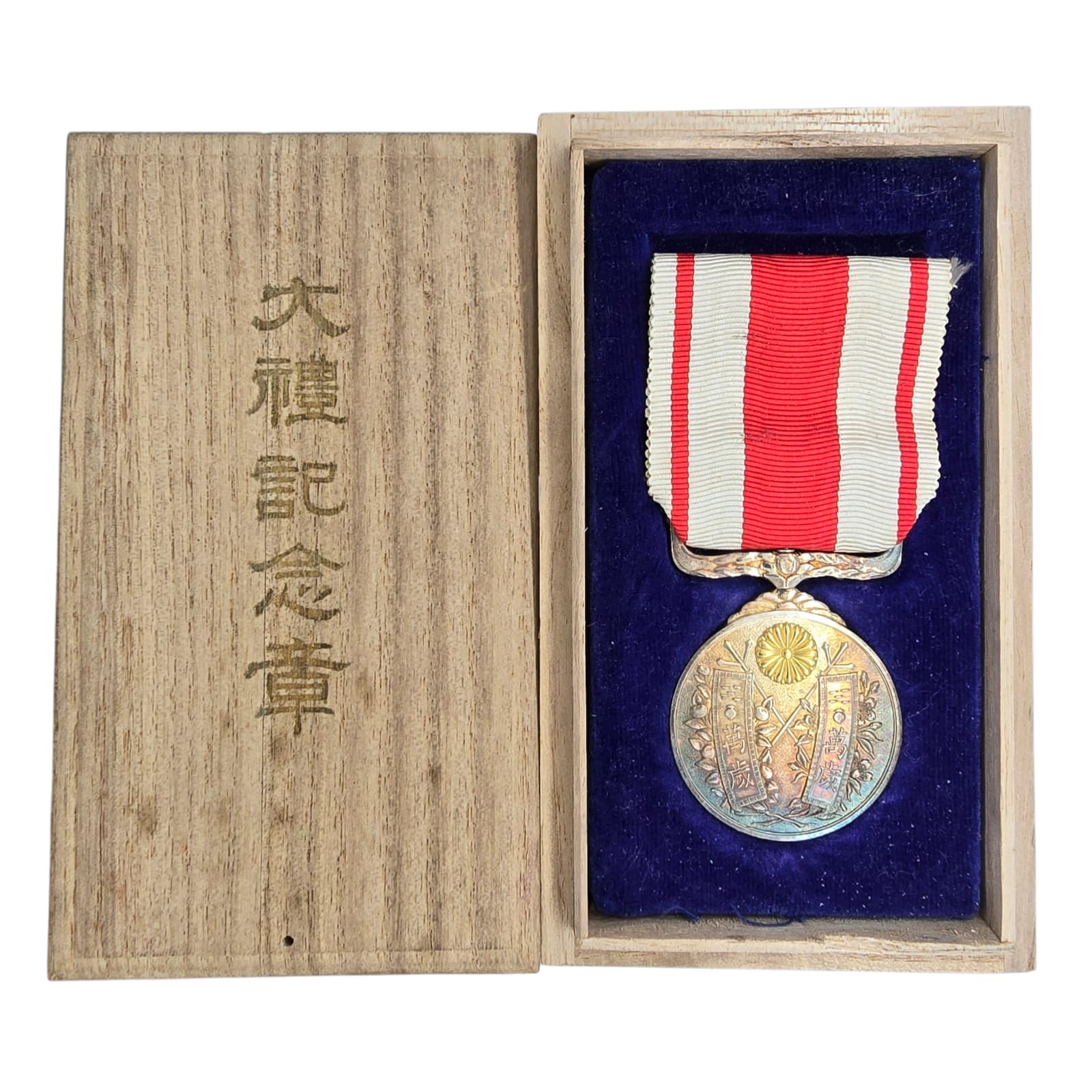 Item: Op de voorzijde van de medaille staan keizerlijke spandoeken met daarin ‘Banzai’ geschreven. Takken van kers en sinaasappel bloeit. Op de achterkant staat de inscriptie 'Taisho 4 [1915] November, Enthronement Commemorative Medal.' Er wordt gezegd dat het lint is ontworpen uit de gordijnen van het buitenpaviljoen dat bij de ceremonies werd gebruikt.