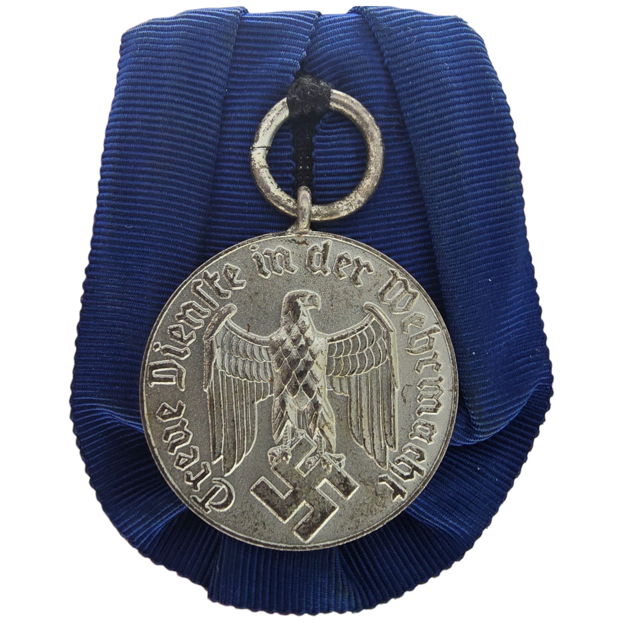 Item: The “Treue Dienste in der Wehrmacht – 4 Years Service” was a German military award, introduced in 1936, for four years of loyal service in the Wehrmacht. It was the lowest grade in a series of long service awards and was worn on the left chest with a blue ribbon.