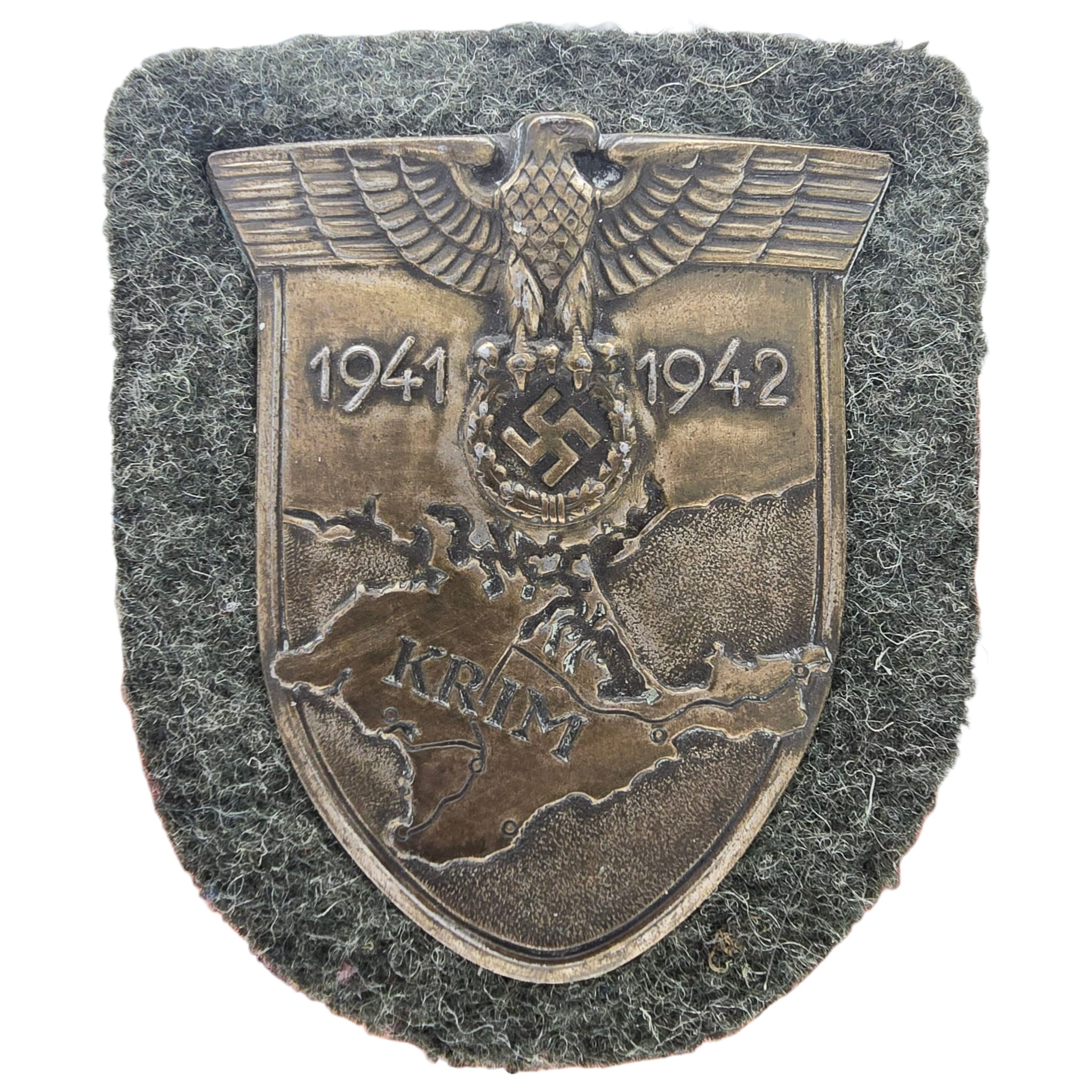Item: The Crimea Shield was a German military decoration in World War II, instituted on July 25, 1942. It was awarded to soldiers who took part in the campaign on the Crimean Peninsula (1941–1942). The shield features an eagle with a swastika above a map of Crimea and the word “KRIM” along with the years 1941–1942.