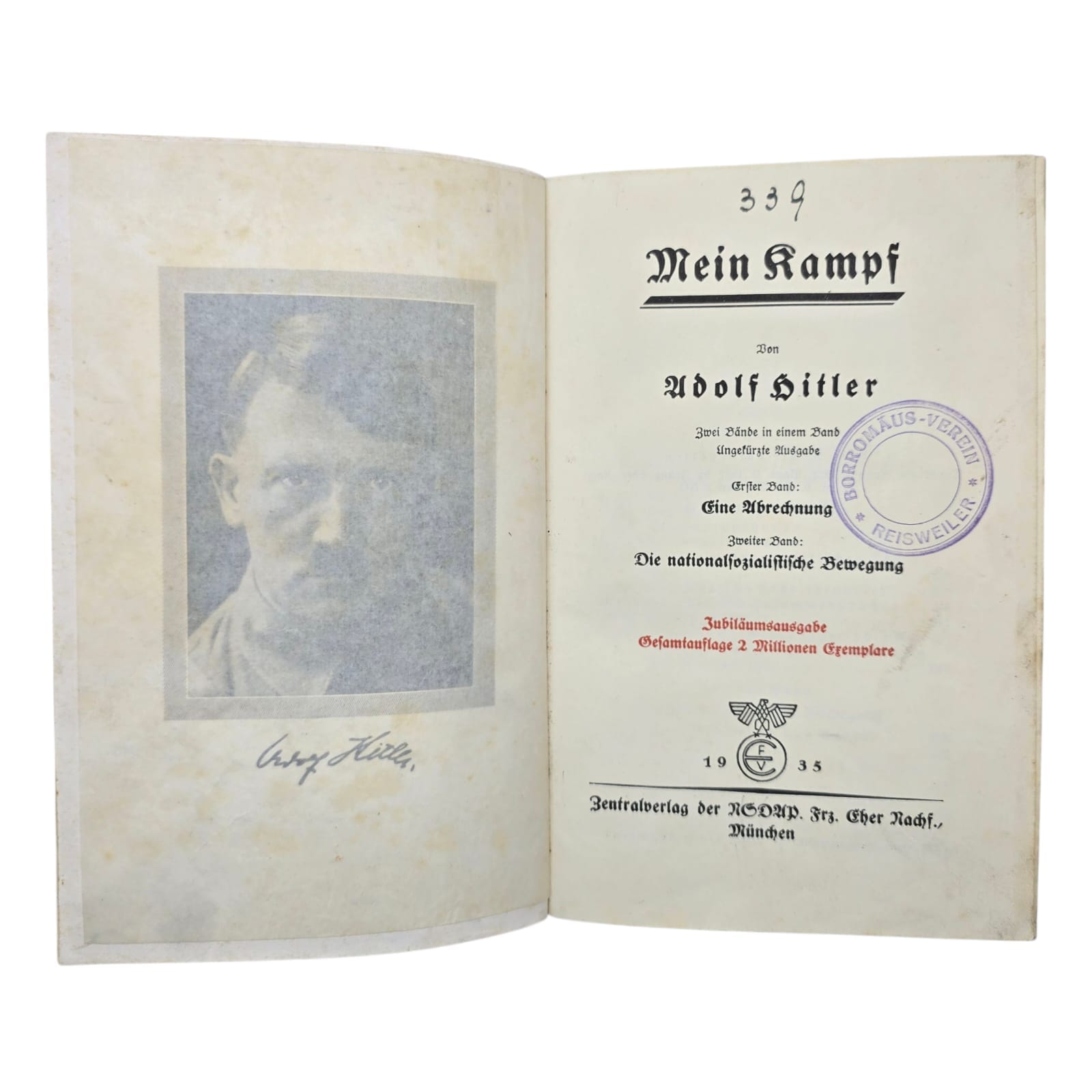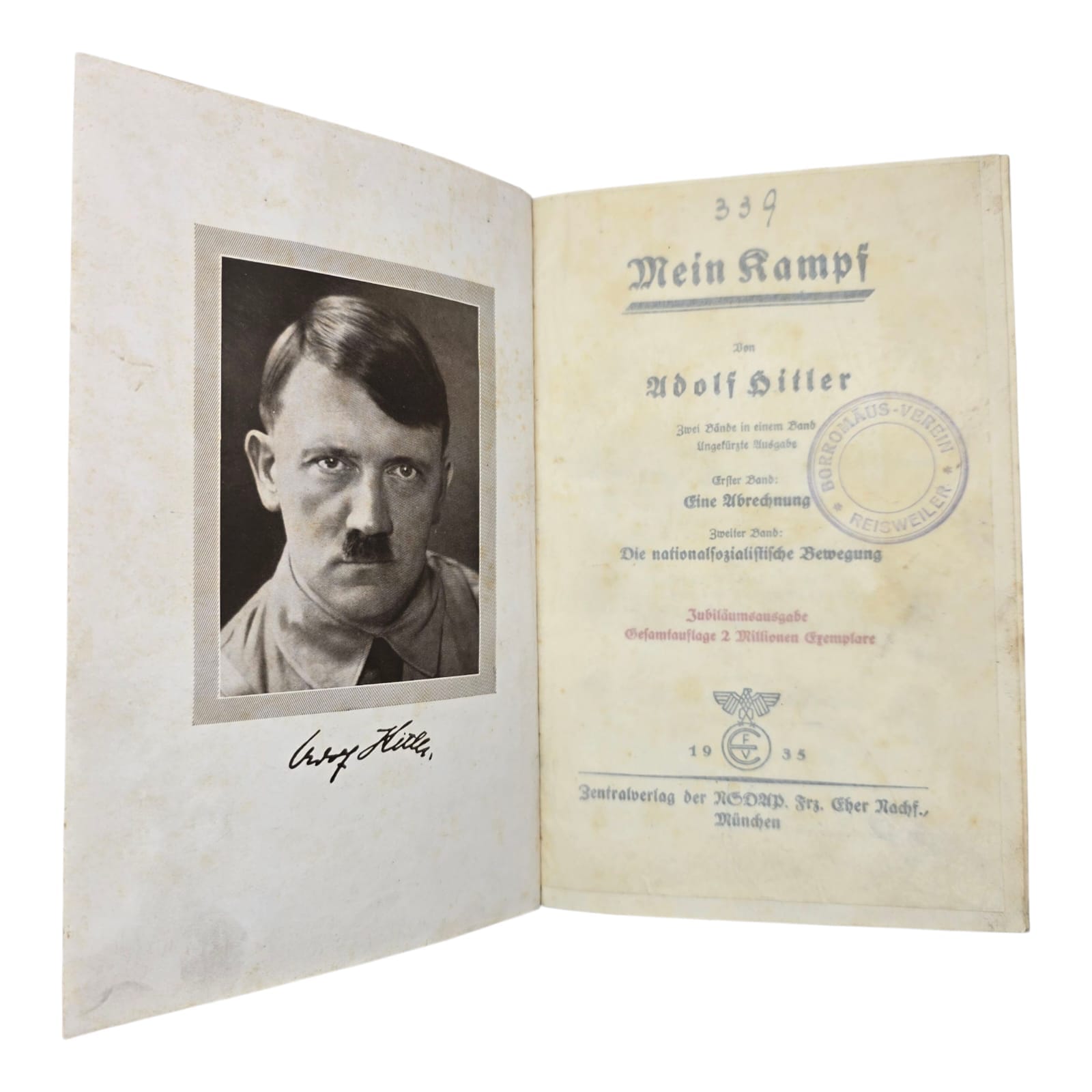 Item: Mein Kampf (“My Struggle”) is a book written by Adolf Hitler, first published in 1925. It is a mix of autobiography and political ideology, outlining Hitler’s anti-Semitic beliefs, German nationalism, and plans for expansion. The book gained significance after Hitler rose to power in 1933, becoming required reading in Nazi Germany. After World War II, it was banned in many countries. The copyright, held by Bavaria, expired in 2016, leading to new annotated editions that provide historical context to counter its propaganda.