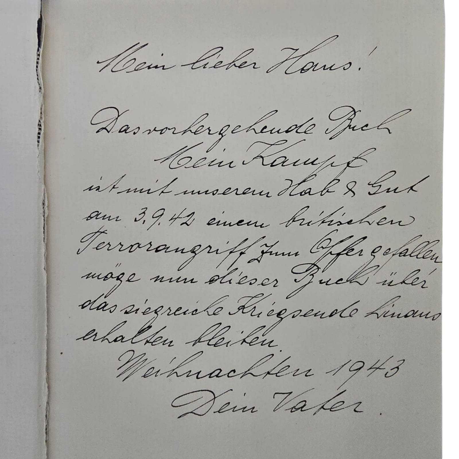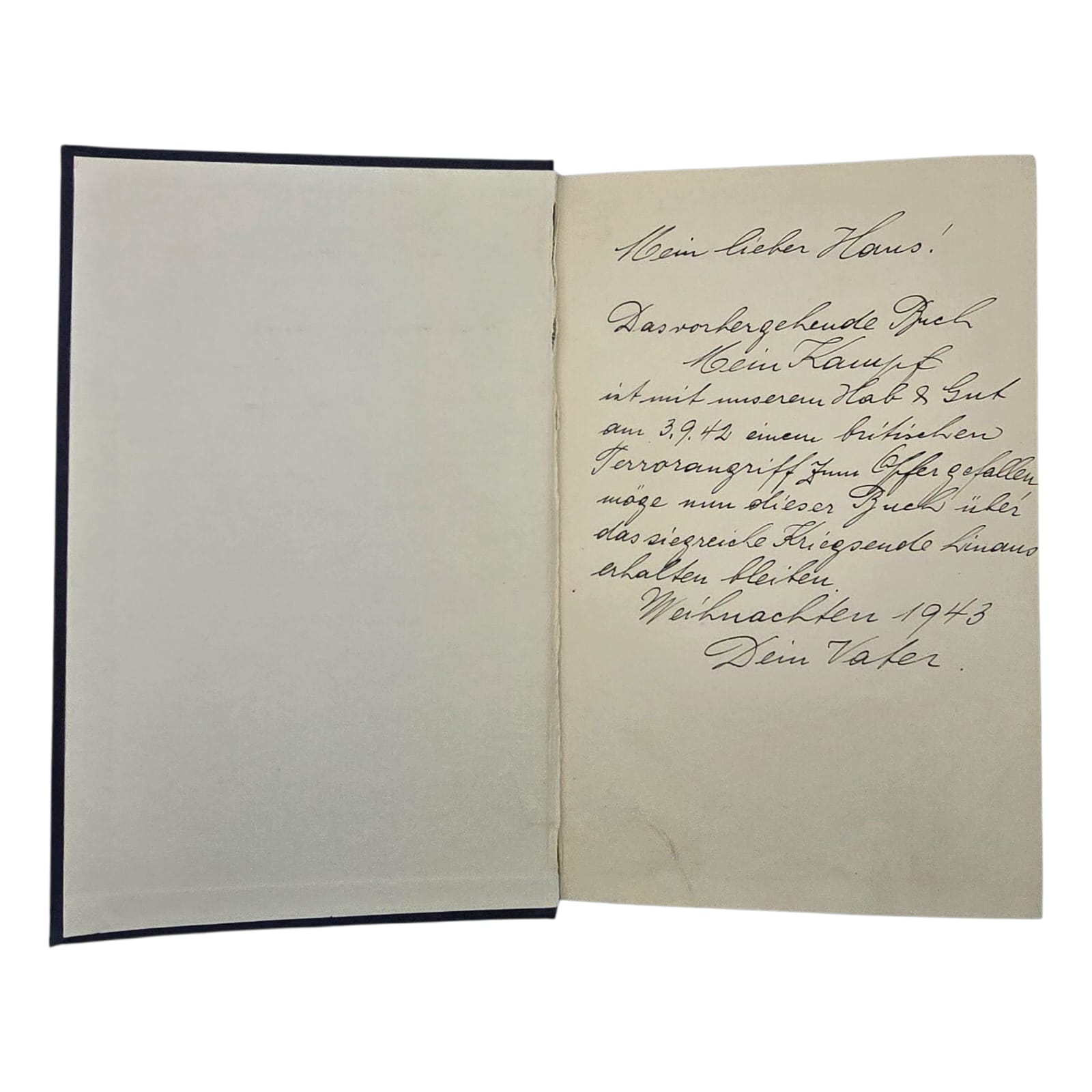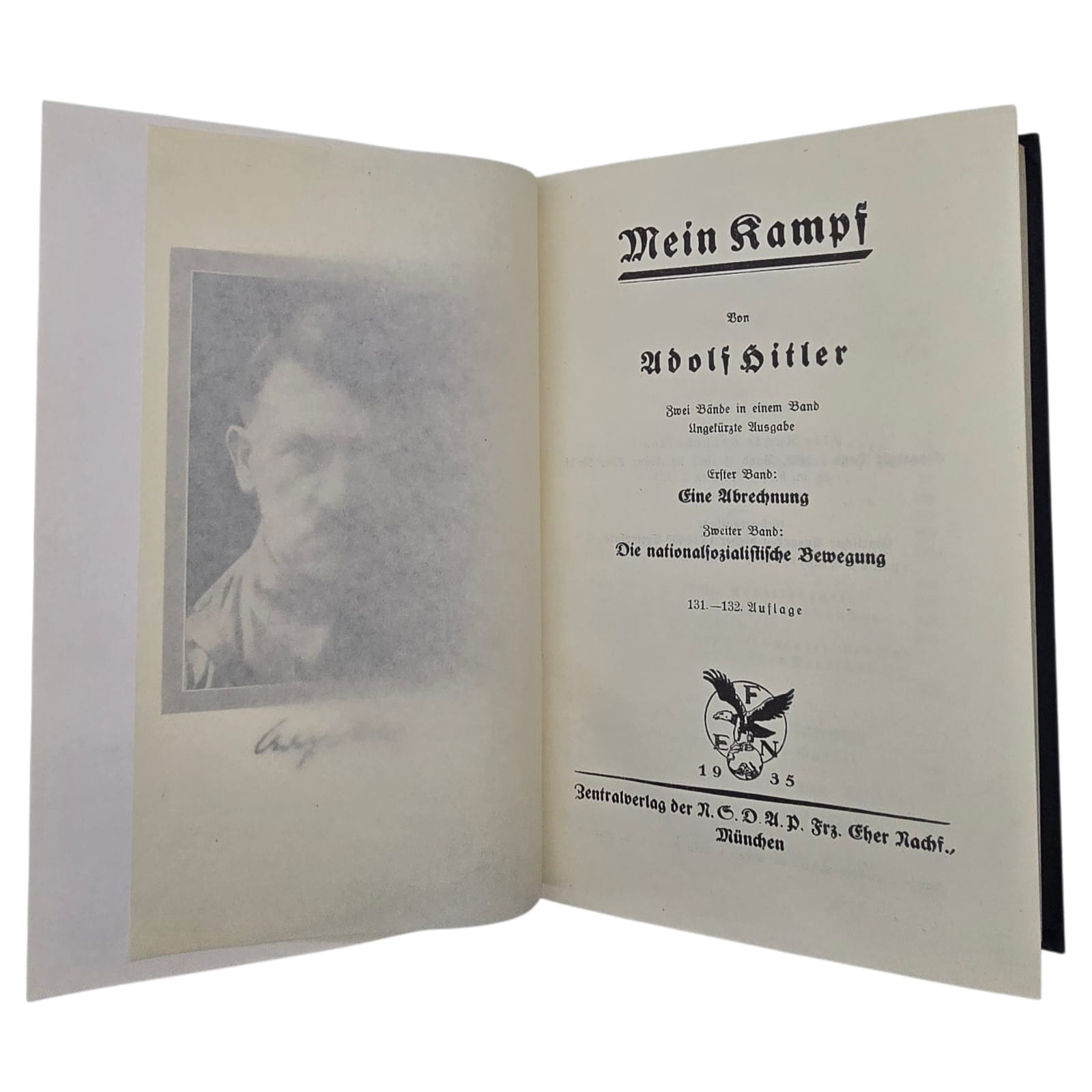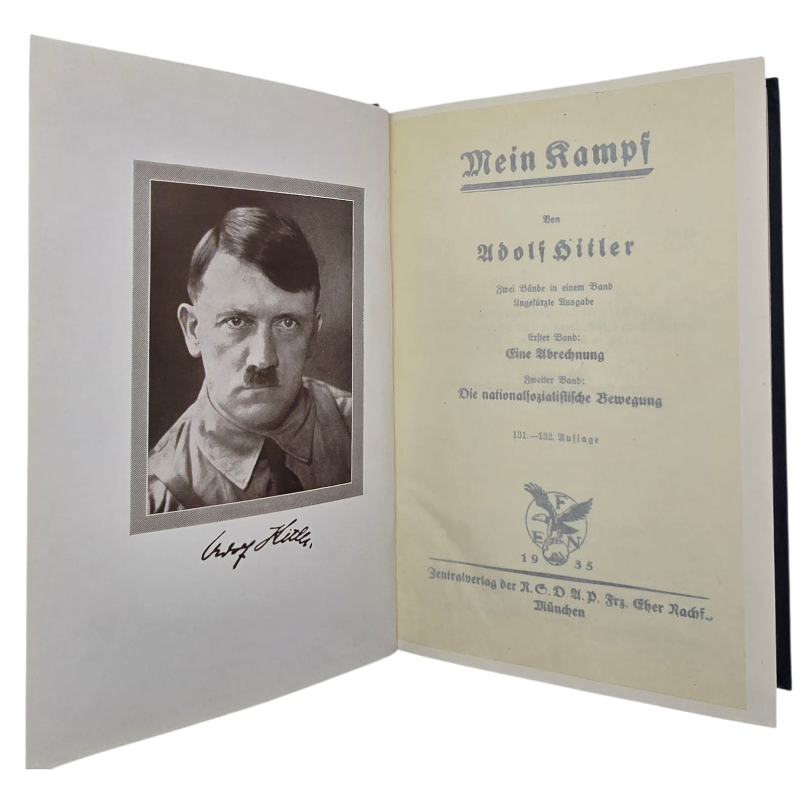 Item: Mein Kampf (“My Struggle”) is a book written by Adolf Hitler, first published in 1925. It is a mix of autobiography and political ideology, outlining Hitler’s anti-Semitic beliefs, German nationalism, and plans for expansion. The book gained significance after Hitler rose to power in 1933, becoming required reading in Nazi Germany. After World War II, it was banned in many countries. The copyright, held by Bavaria, expired in 2016, leading to new annotated editions that provide historical context to counter its propaganda.