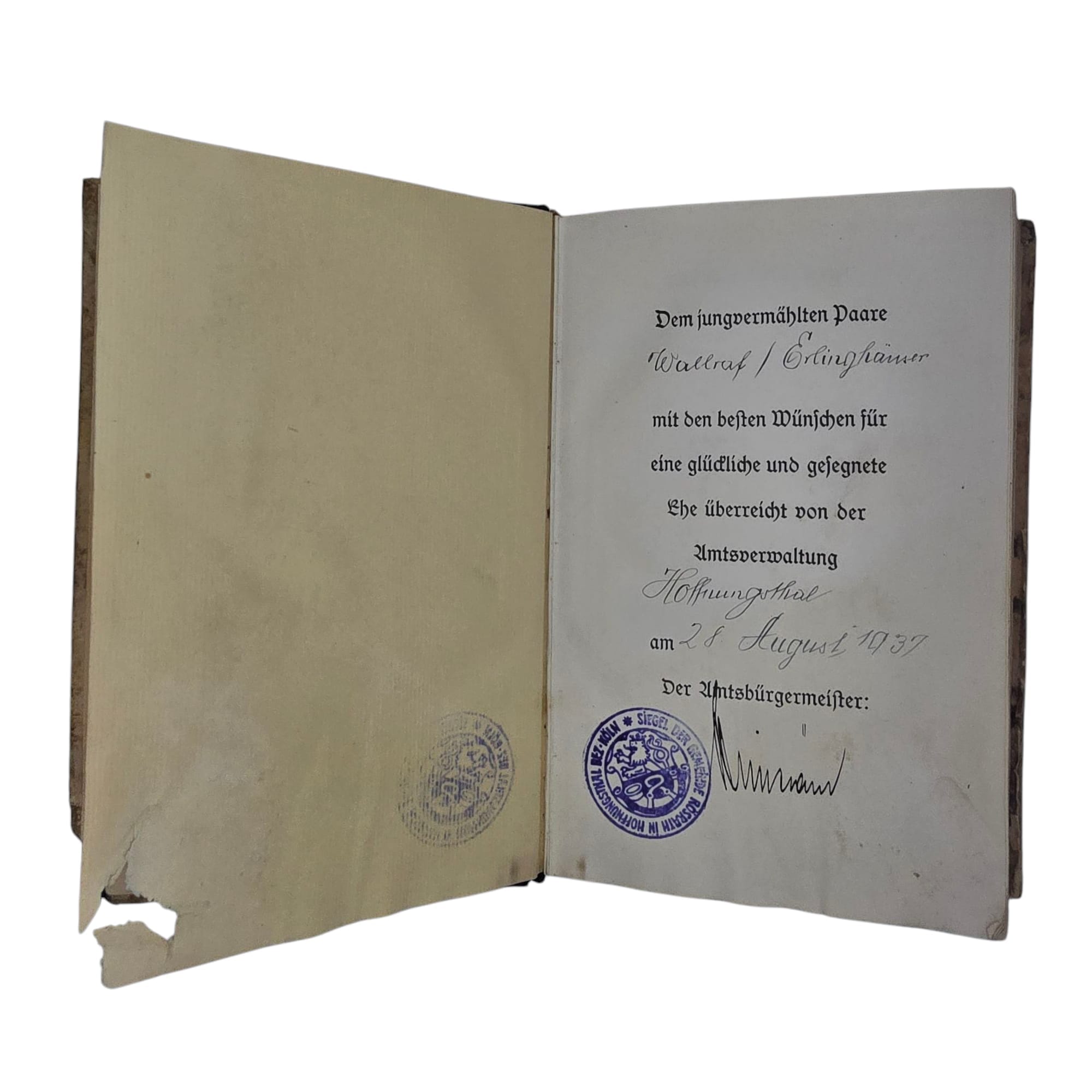 Conditie: Boek is in beschadigde conditie. Helaas is de onderkant van het boek door waterschade aangetast. De voor- en achterkant van het boek zijn daardoor wat vervallen, maar de pagina’s verkeren nog in redelijk goede staat. Gesigneerd door de burgemeester van Rösrath.