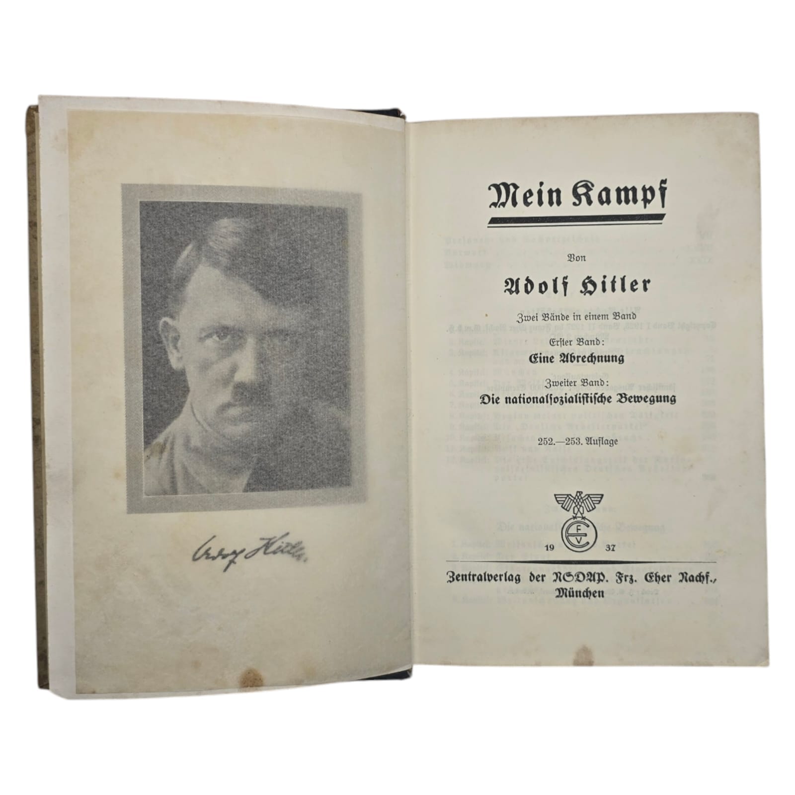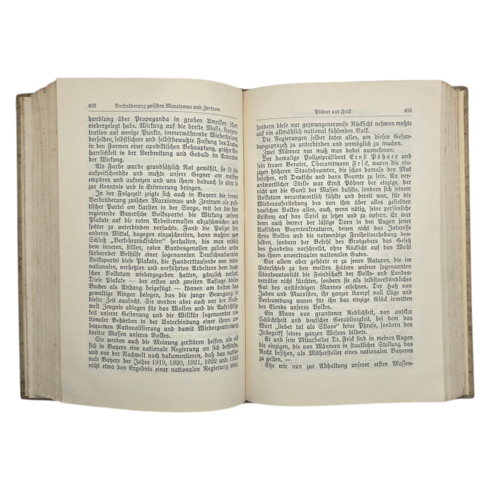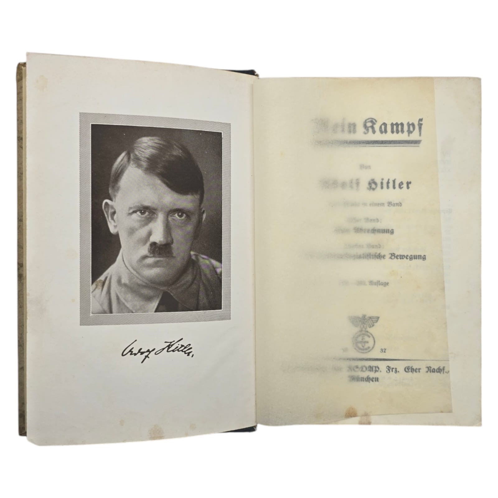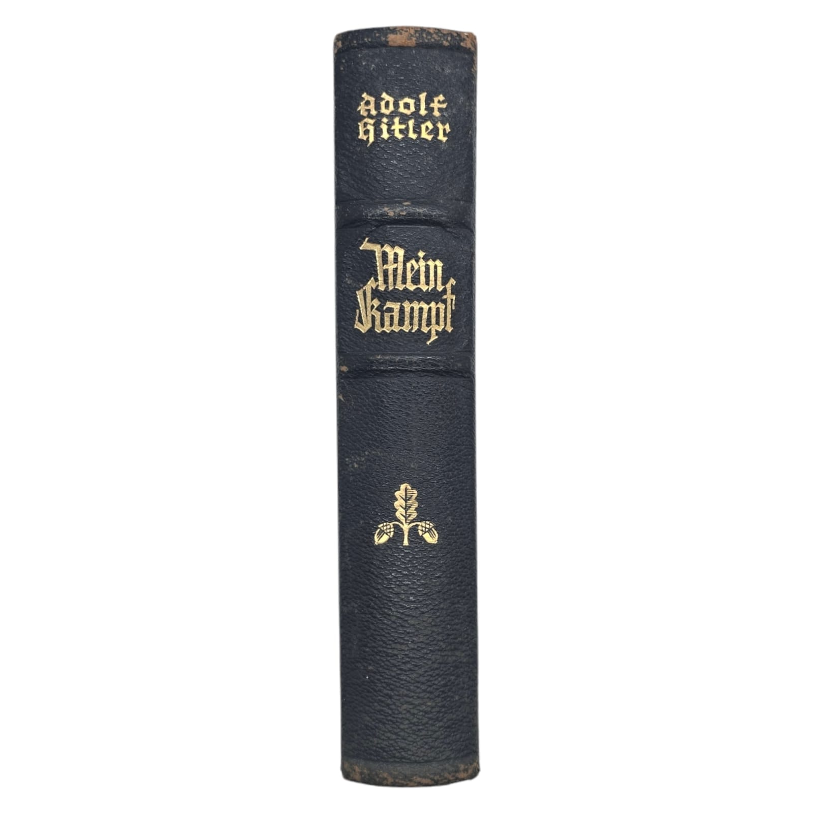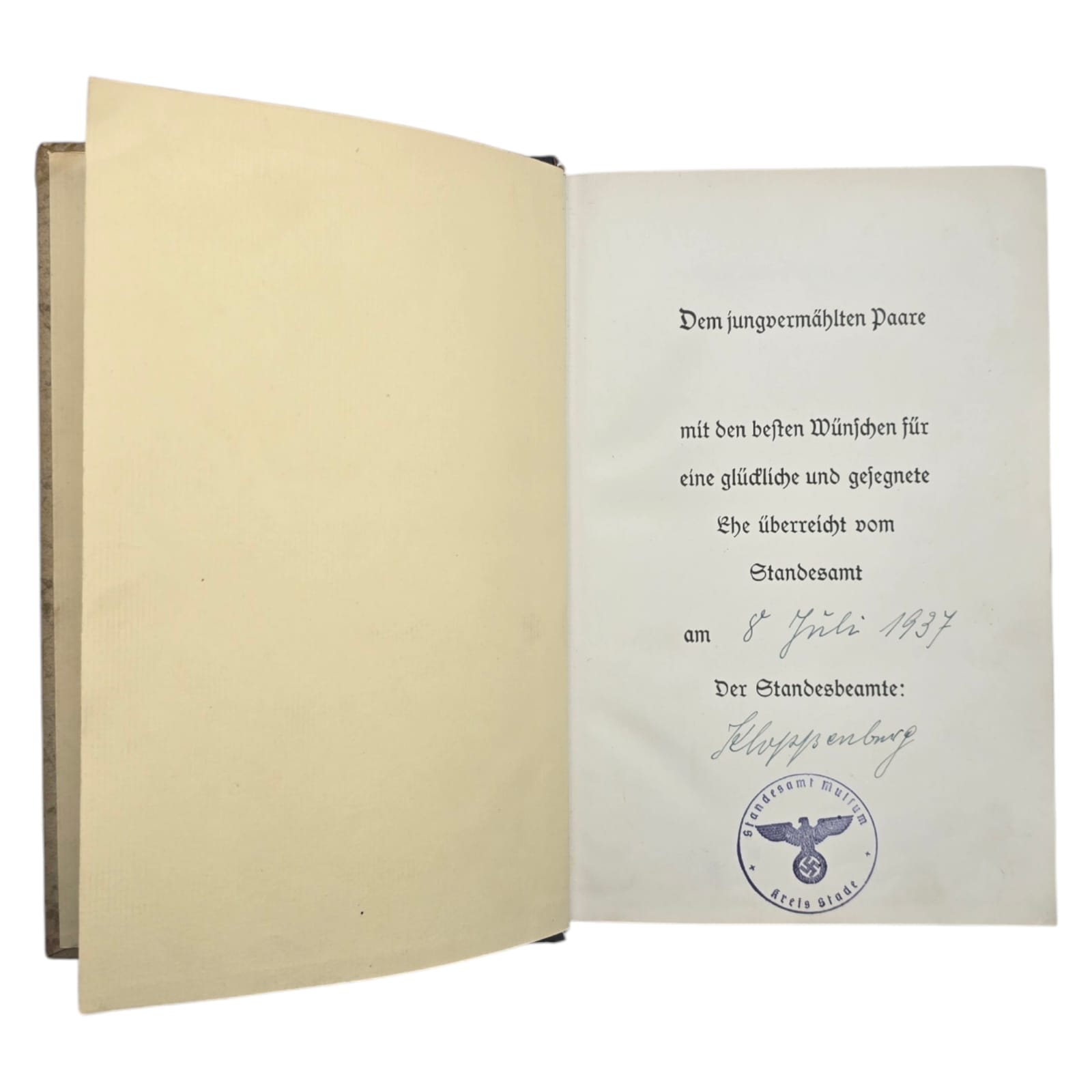 Item: Duitse Mein kampf Wedding-editie. Citaat staat voorin het boek met familienamen en een handtekening van de burgemeester van de stad. zeer speciale trouwuitgave die in de jaren van het Derde Rijk aan pasgetrouwde stellen is gegeven. Dit boek komt uit Boek komt uit 1937