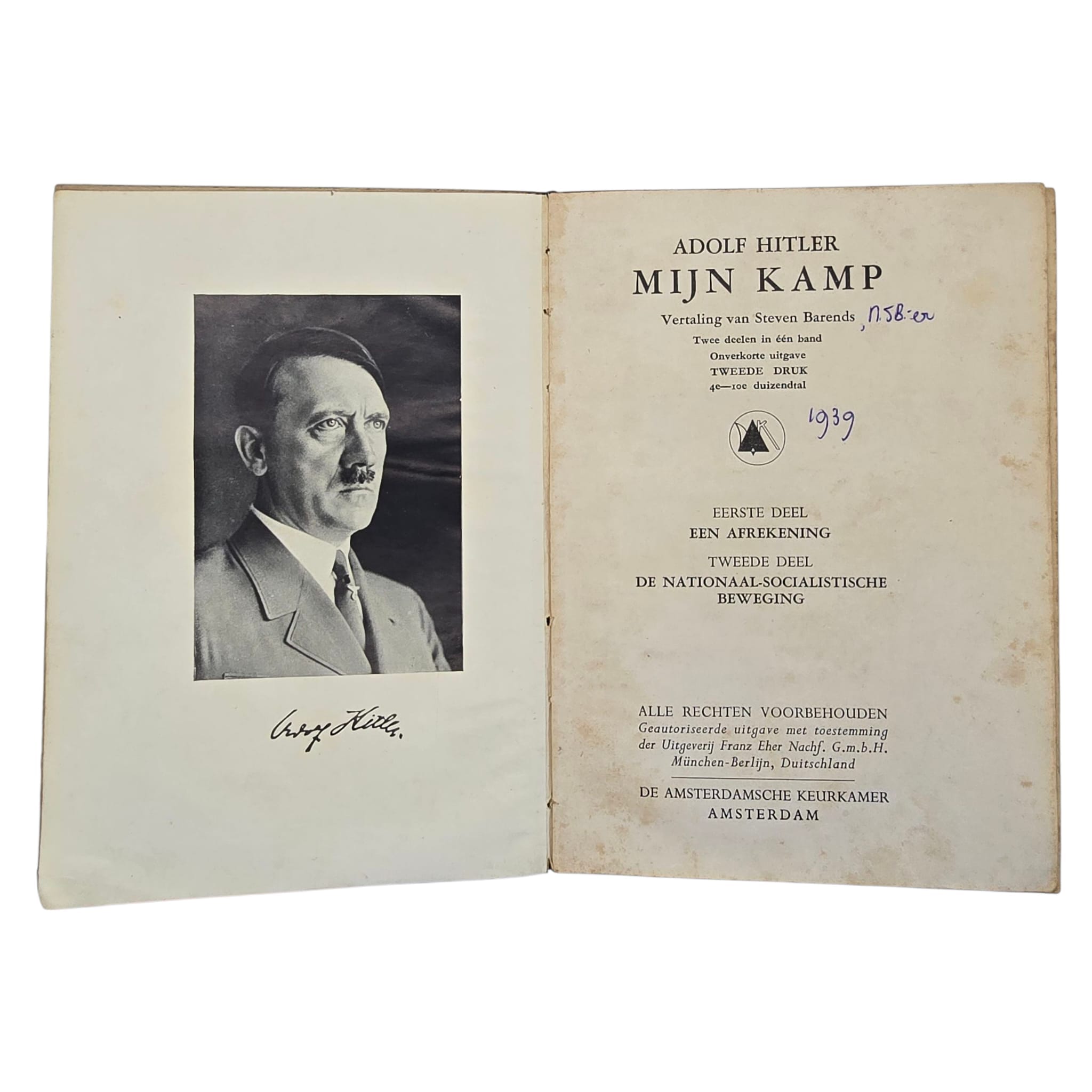 This is the second Dutch edition of Mein Kampf, published by De Amsterdamsche Keurkamer. A notable detail is that next to the name of Steven Barends, the word “NSB’er” (a term often used to label someone as a traitor or collaborator) has been handwritten in pen.
