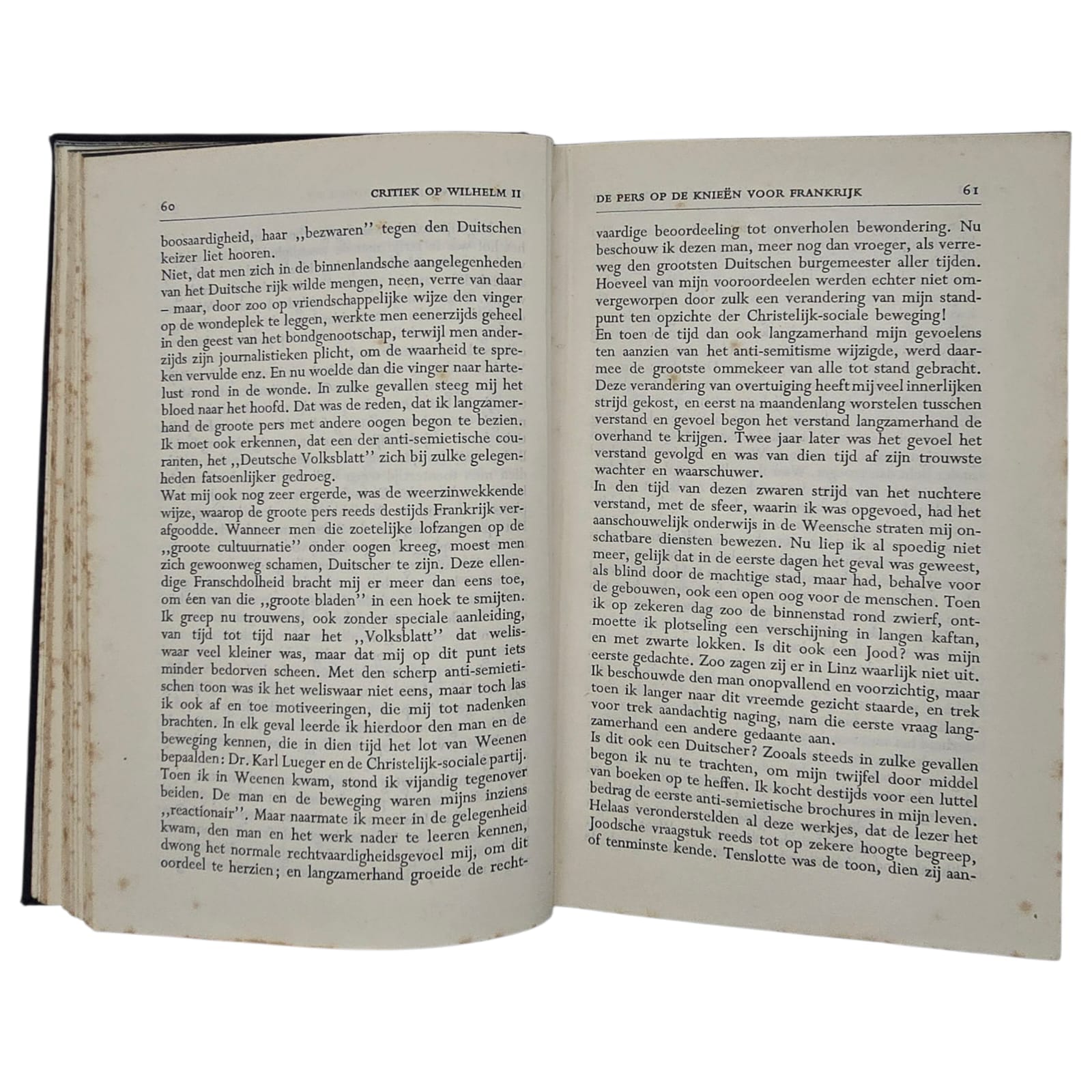Mein Kampf, geschreven door Adolf Hitler in de jaren 1920, werd in de jaren dertig ook in Nederland uitgegeven, ondanks de groeiende maatschappelijke en politieke controverse rond het werk.