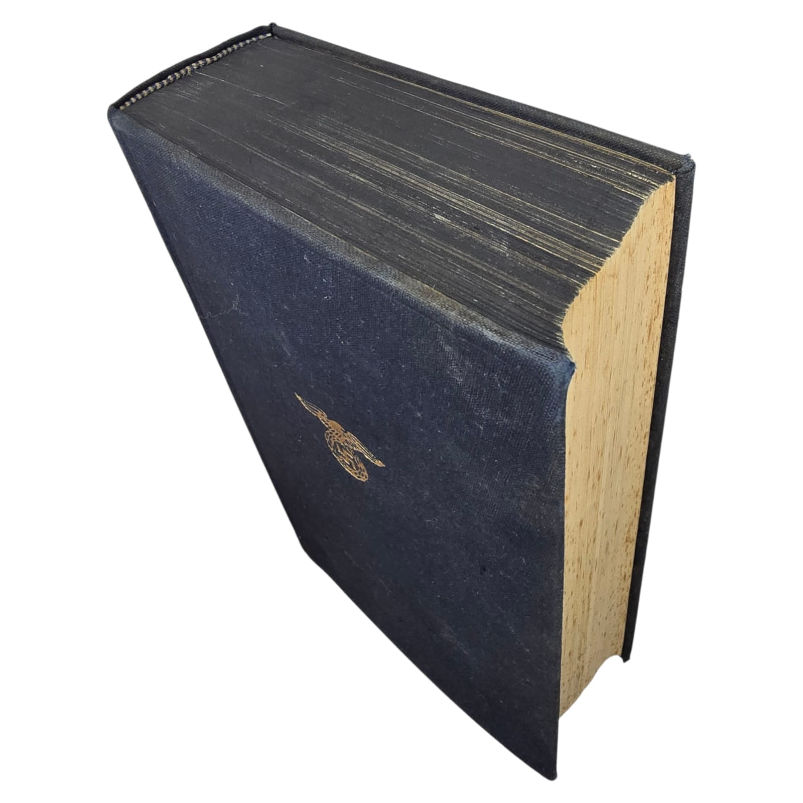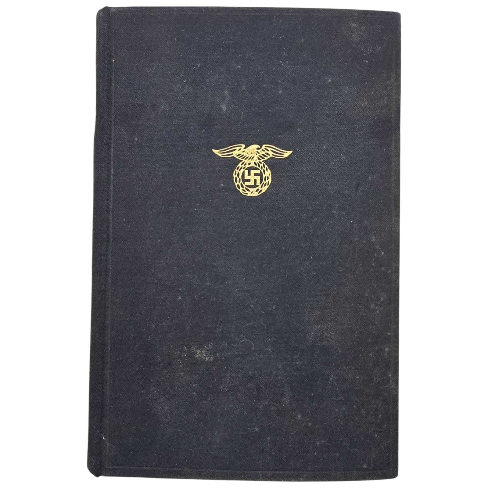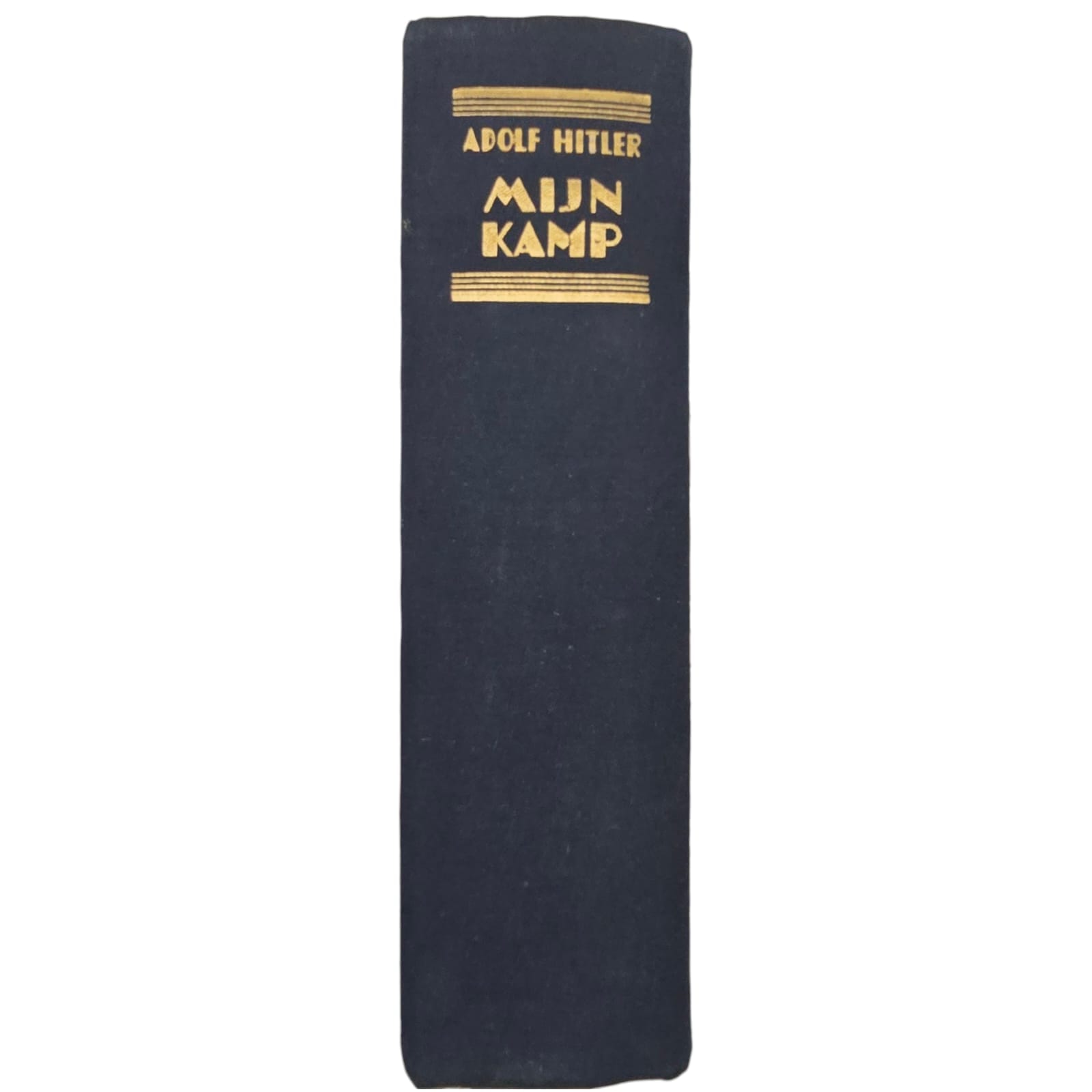 The original cover is present and in good condition. Some signs of use are visible, which is to be expected for a book of this age. The golden eagle on the front is well preserved and still features all the original gold detailing. The same applies to the spine, where the original gold lettering with Adolf Hitler – Mijn Kamp is still fully intact.