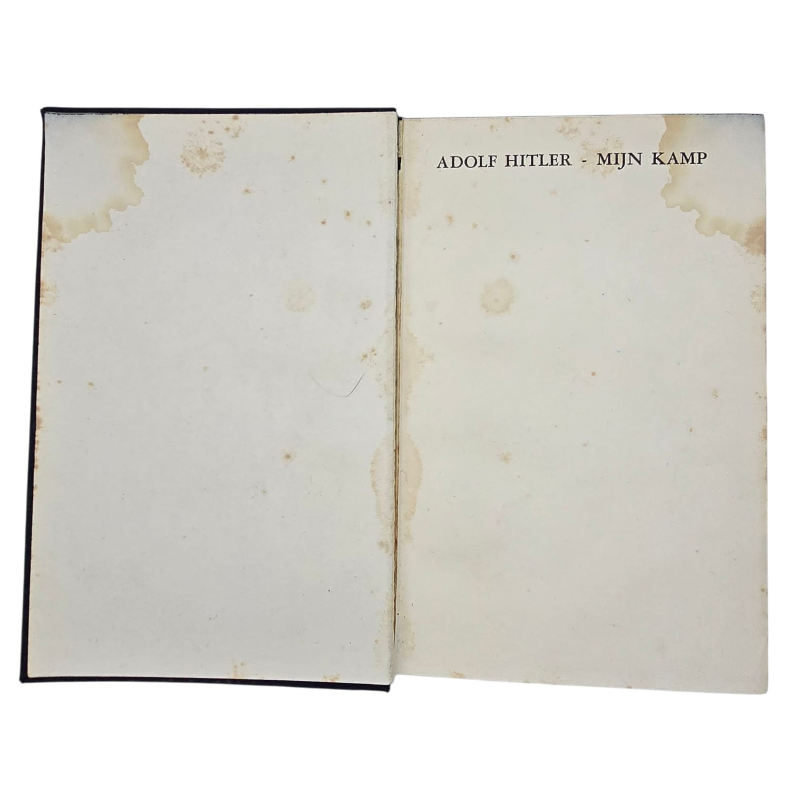 De originele kaft is aanwezig en verkeert in goede staat. Er zijn wat gebruikssporen zichtbaar, maar dit is gebruikelijk voor een boek van deze leeftijd. De gouden adelaar op de voorkant is nog goed bewaard gebleven en bevat nog alle goudkleurige bedrukking. Dit geldt ook voor de rug van het boek, waar de originele gouden lettering met Adolf Hitler – Mijn Kamp nog volledig aanwezig is.