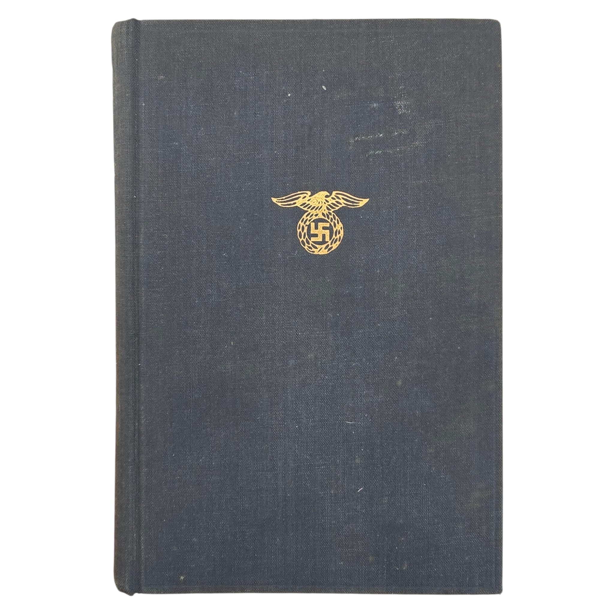 The original cover is present and in good condition. Some signs of use are visible, which is to be expected for a book of this age. The golden eagle on the front is well preserved and still features all the original gold detailing. The same applies to the spine, where the original gold lettering with Adolf Hitler – Mijn Kamp is still fully intact.