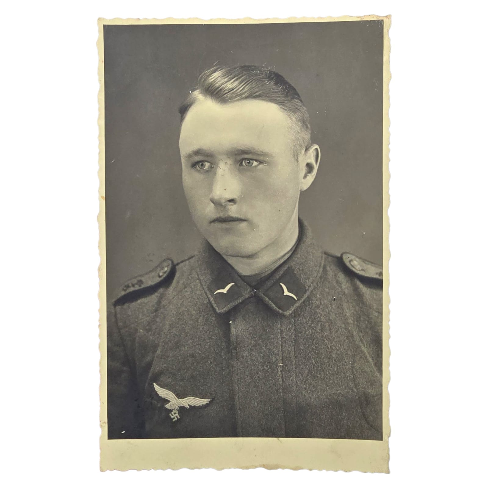 Item: German portrait photos from the Second World War were professional studio portraits taken by soldiers in uniform to send home to their families as a keepsake. They often show clearly recognizable insignia of the Wehrmacht, Kriegsmarine, Luftwaffe or Waffen-SS and provide a personal and historical view of the servicemen of that era. Today, these photos are valuable collectible and research items within military history.