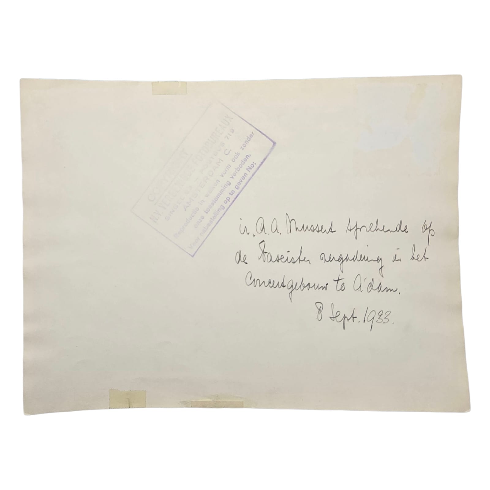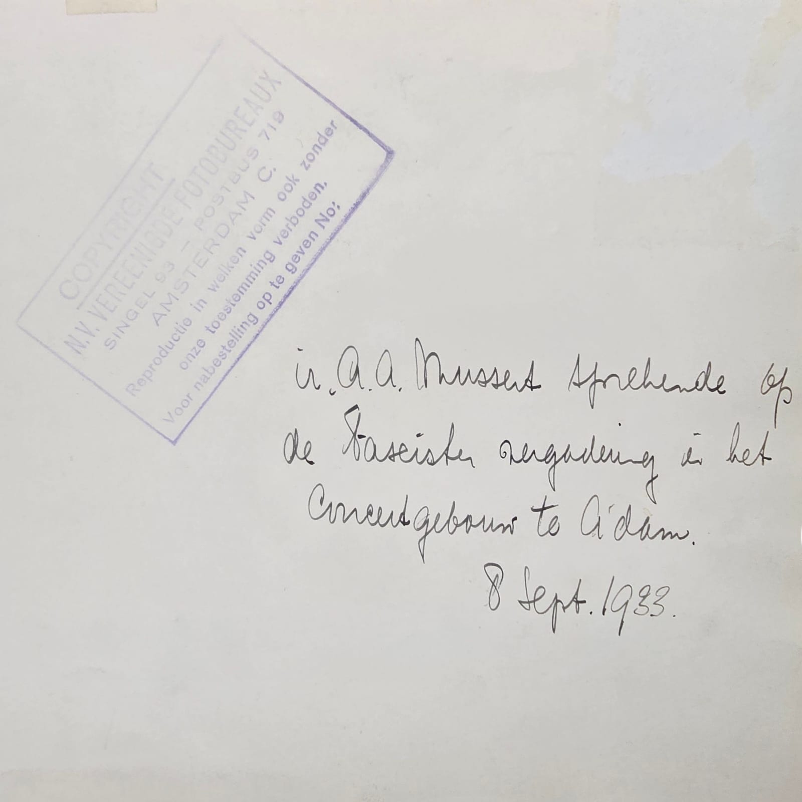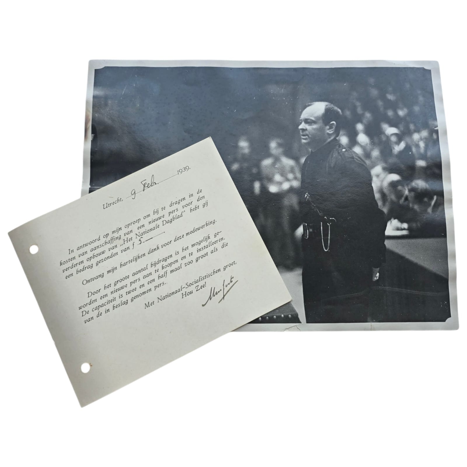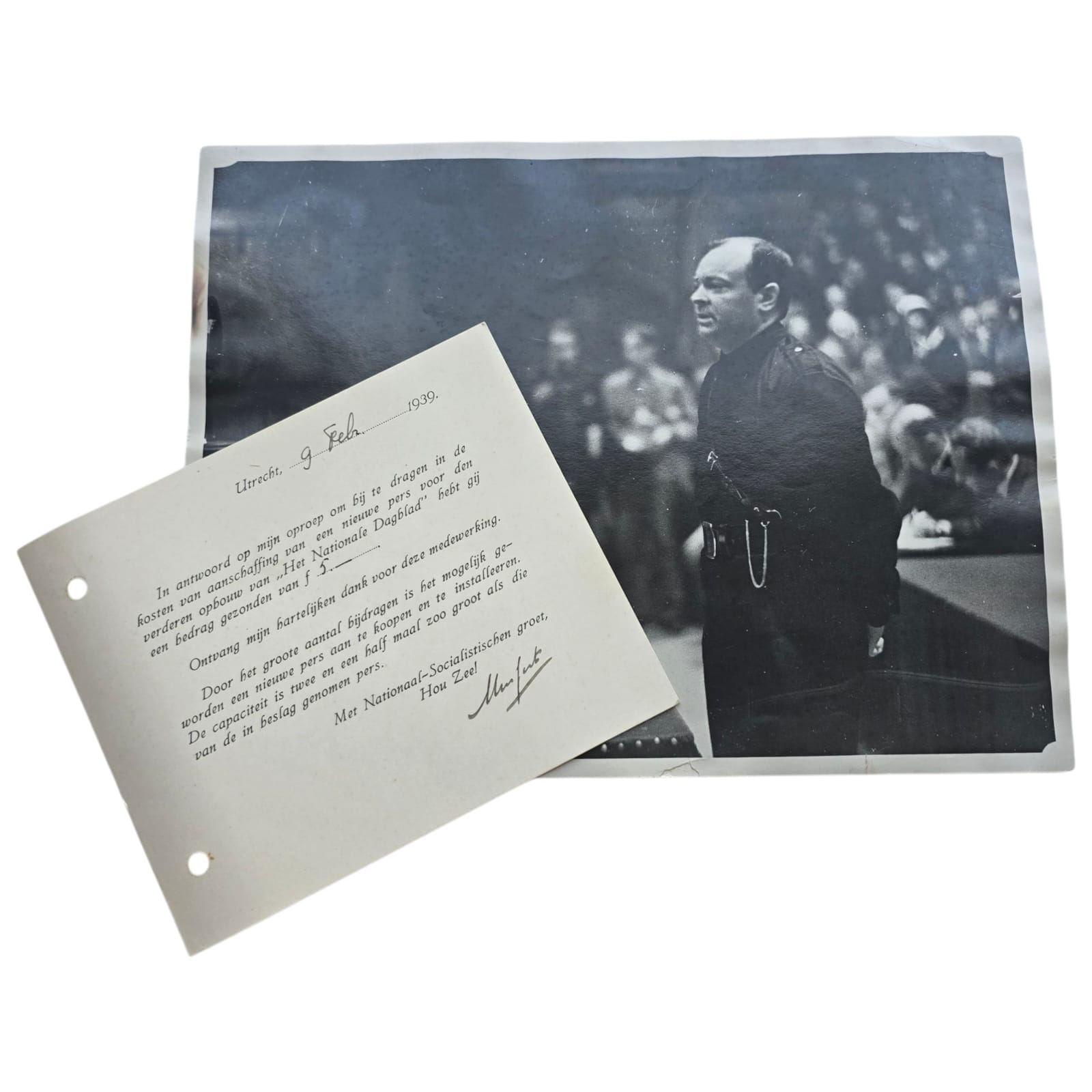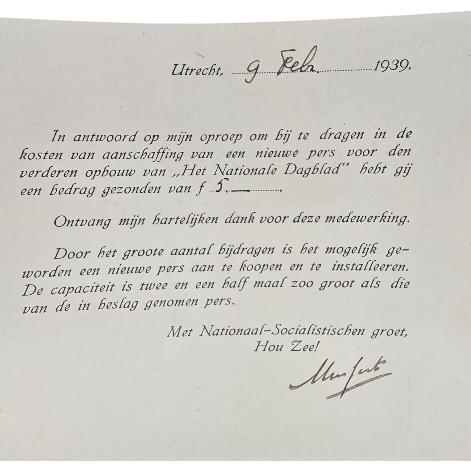 In the 1930s and 1940s, Anton Mussert, leader of the NSB, issued signed thank-you notes to individuals who donated money toward the purchase of a new printing press for the Nationaal Dagblad, the official newspaper of the NSB. This newspaper served as a key propaganda tool for the movement and played an important role in spreading National Socialist ideology in the Netherlands.