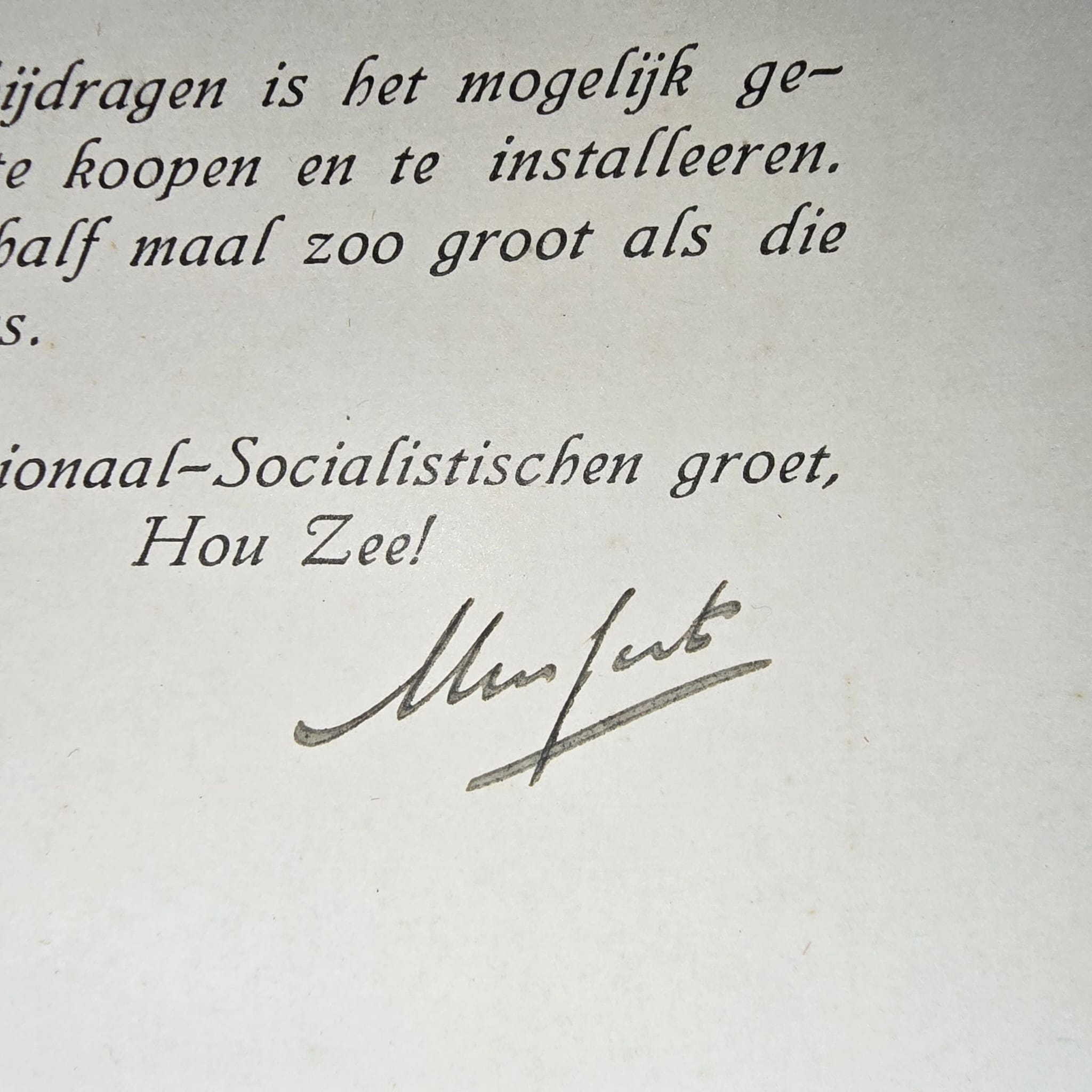 When the original press was confiscated by the Dutch government, the NSB launched a fundraising campaign among its members and supporters. Donors would often receive a signed card, letter, or certificate bearing Mussert’s signature, sometimes accompanied by a portrait photo or press photo.