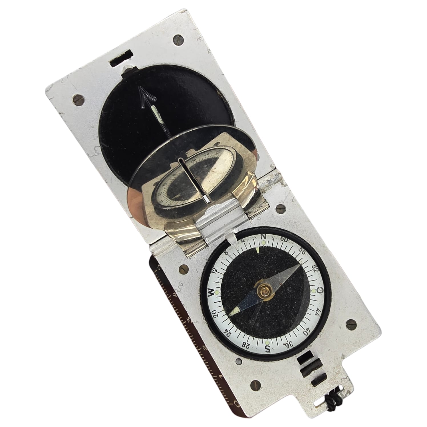 Item: The German Marching Compass (Marsch Kompass) was a standard navigation tool used by German soldiers during World War II. It served to help troops orient themselves and navigate in unfamiliar terrain, both during battles and reconnaissance missions.