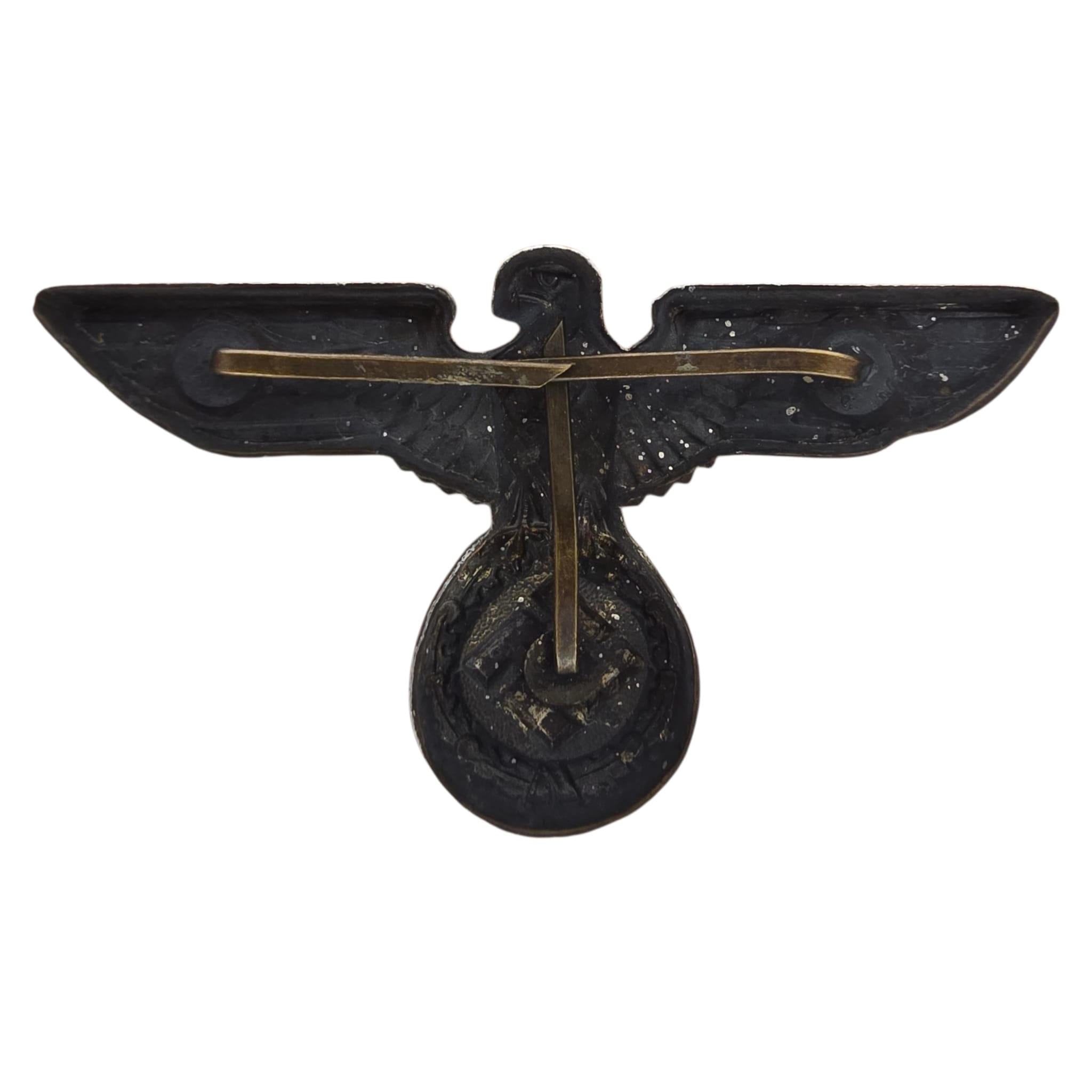 Item: The Wehrmacht Heer visor eagle was the cap insignia worn on German Army peaked caps (Schirmmützen) from 1935–1945. It featured the national eagle clutching a swastika, usually made of aluminum or zinc, and was placed above the wreath and cockade on the visor cap.