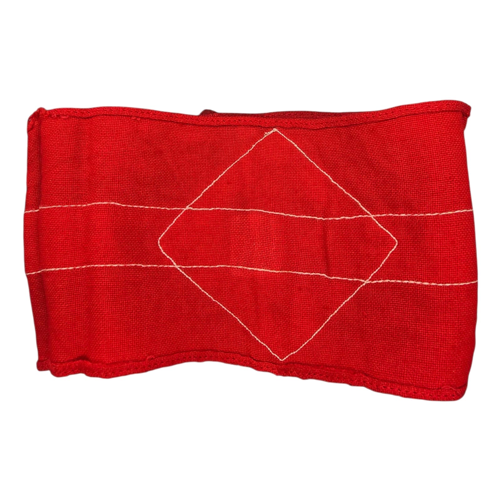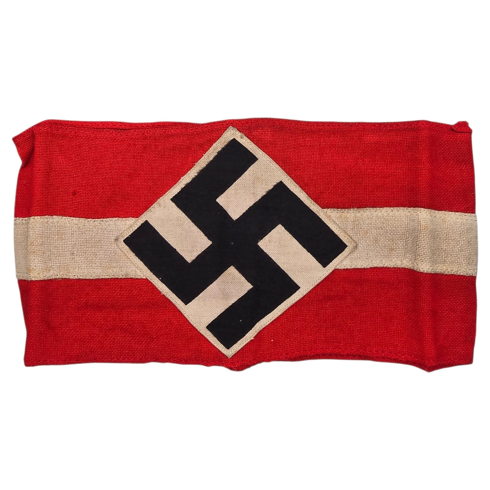 Item: Hitler-Jugend Member’s Armband (Armbinde) as worn by HJ members on the upper left sleeve on almost all HJ uniforms. Red coloured armband shows an white stripe in the middle and has a white diamond, with a black swastika. Nice original armband!