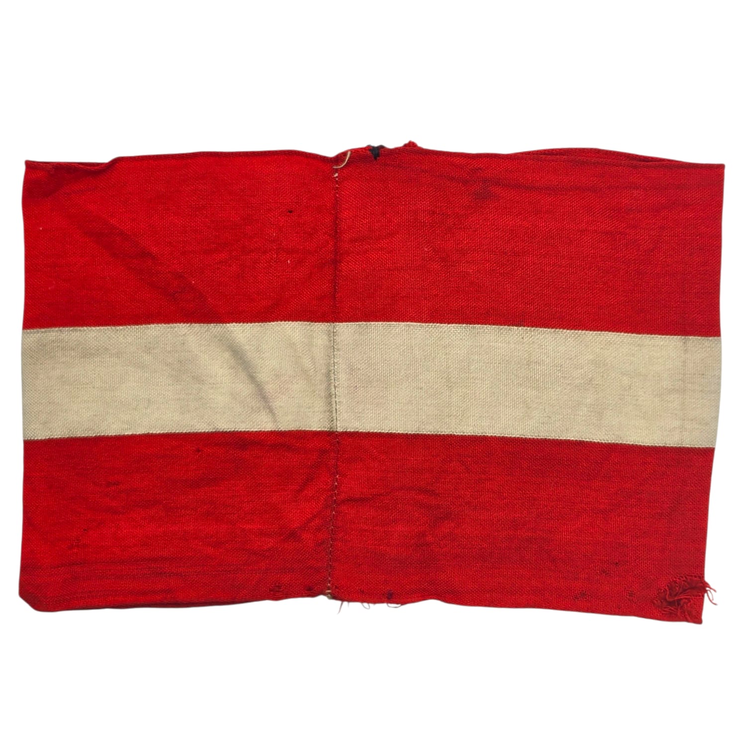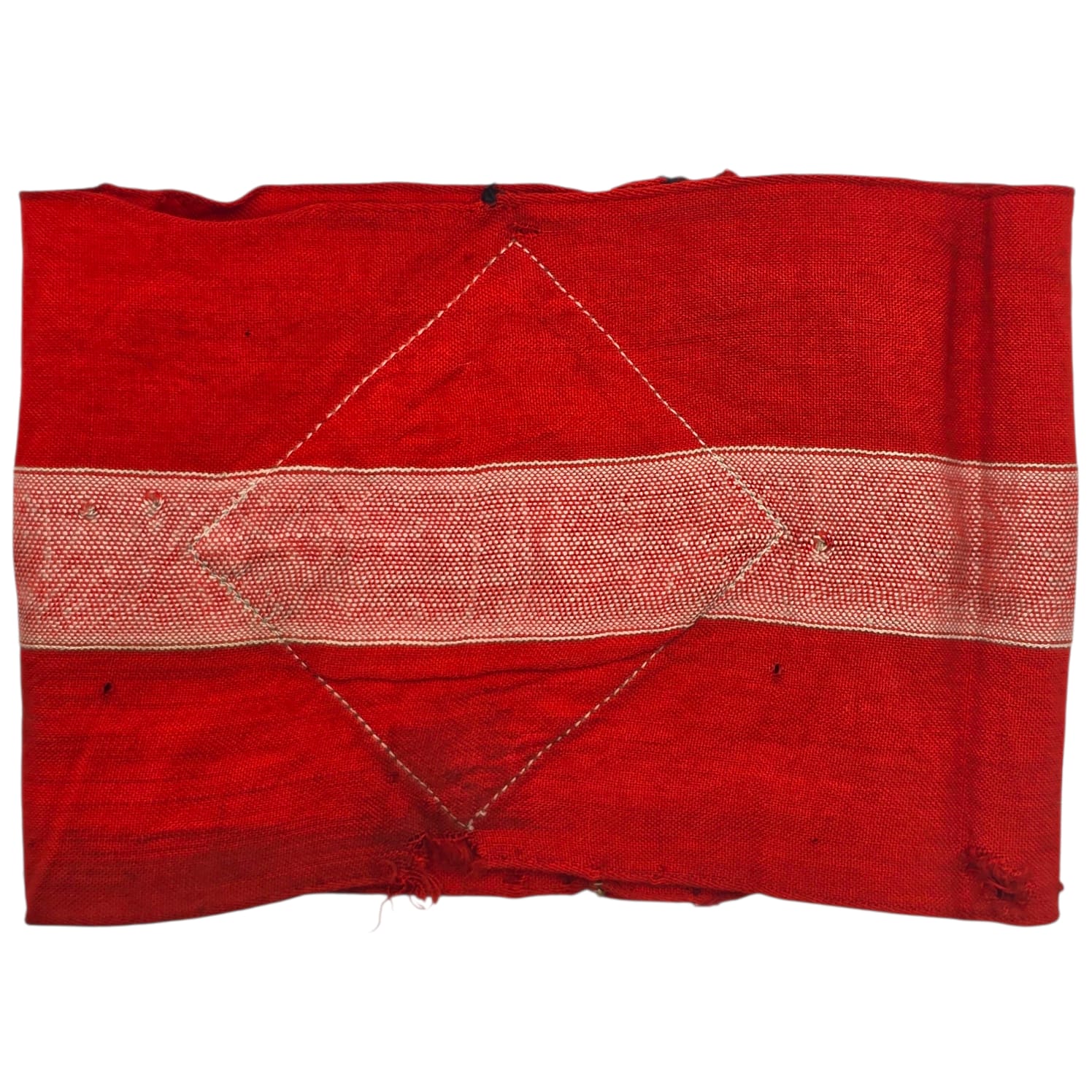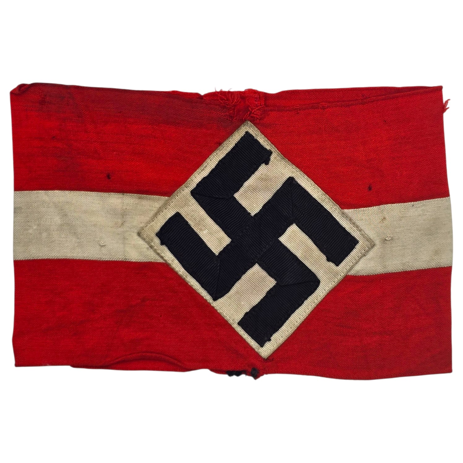 Item: Hitler-Jugend Member’s Armband (Armbinde) as worn by HJ members on the upper left sleeve on almost all HJ uniforms. Red coloured armband shows an white stripe in the middle and has a white diamond, with a black swastika. Nice original armband!