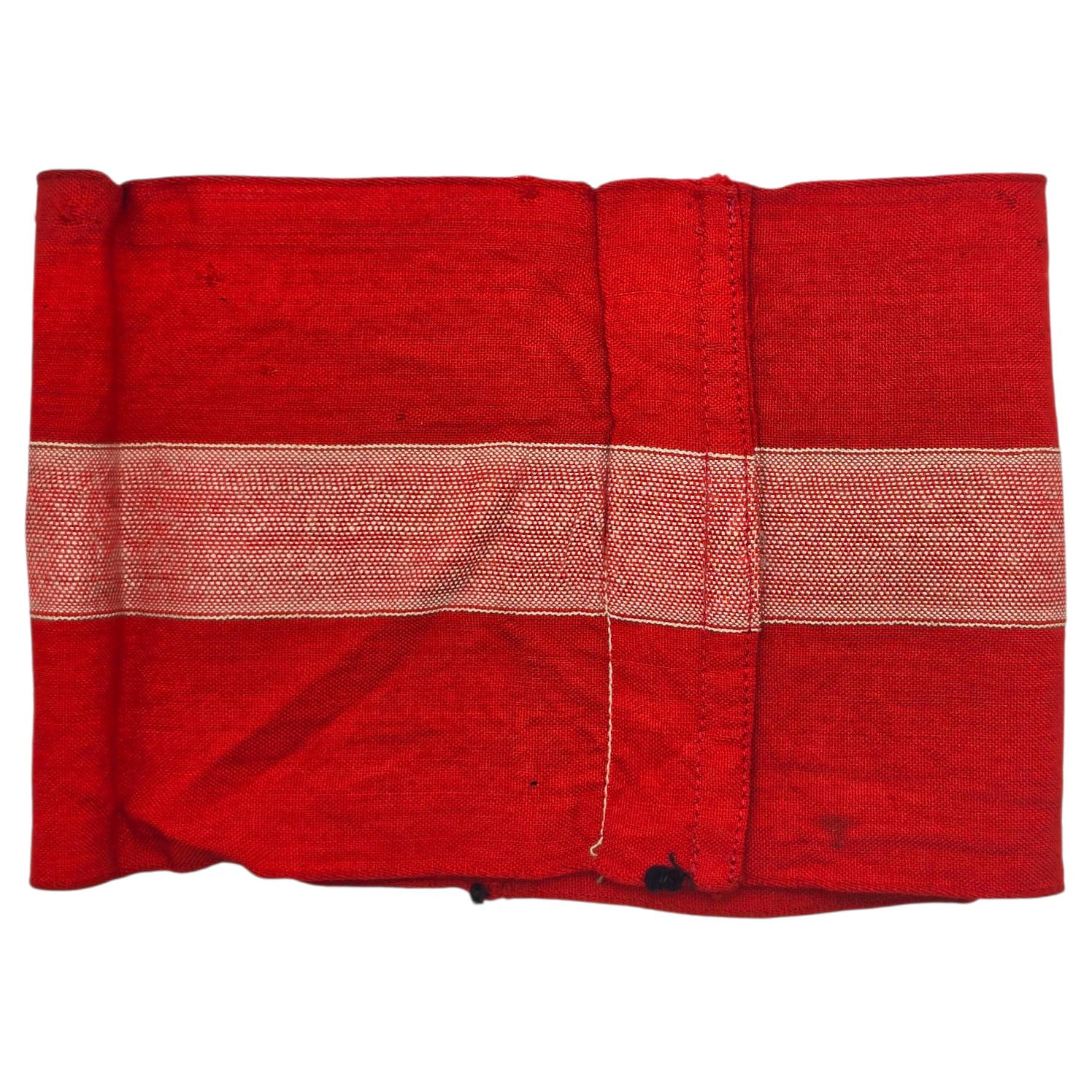 Item: Hitler-Jugend Ledenarmband (Armbinde) zoals gedragen door HJ-leden op de linkerbovenmouw van bijna alle HJ-uniformen. De roodgekleurde armband toont een witte streep in het midden en heeft een witte ruit, met een zwarte swastika. Leuke originele armband!
