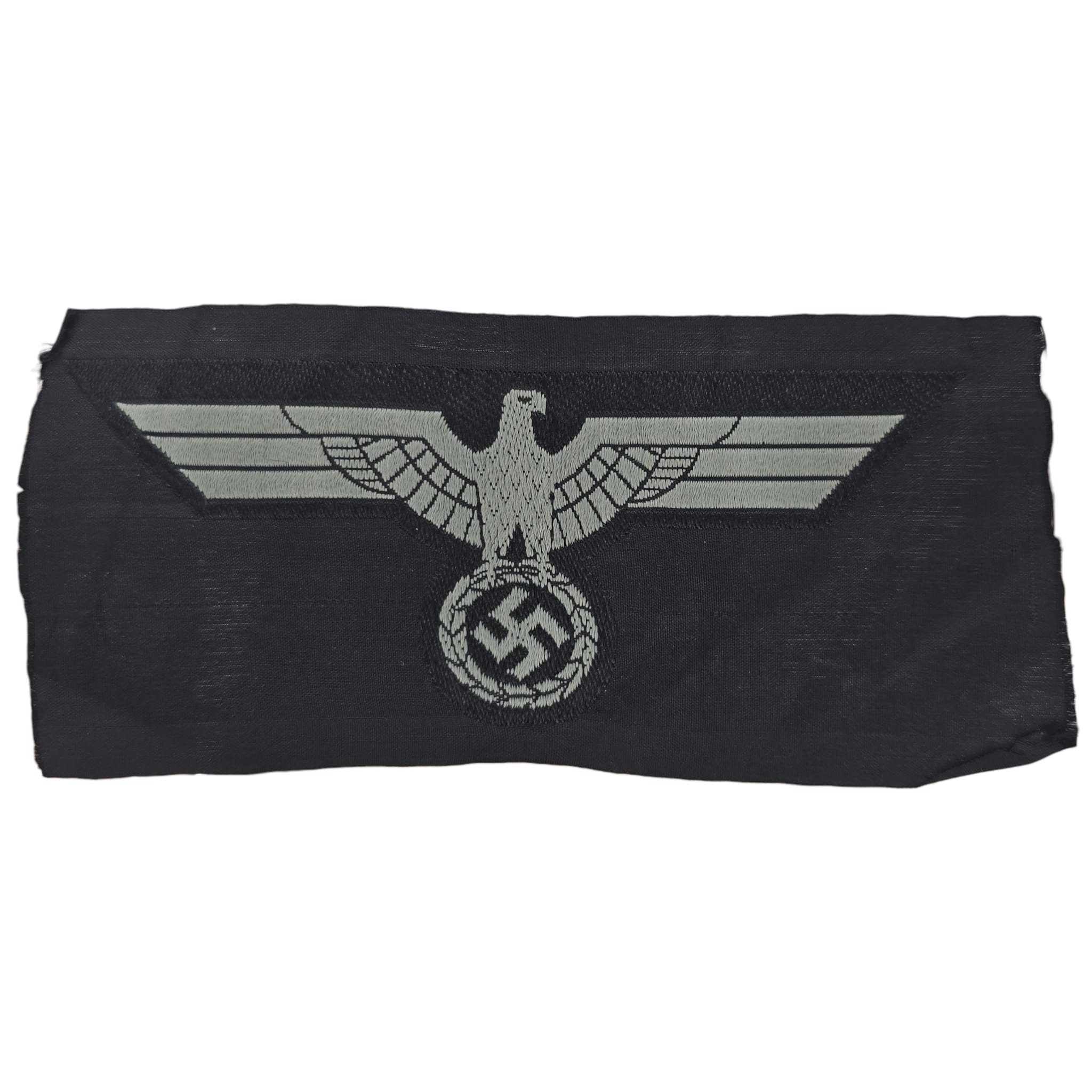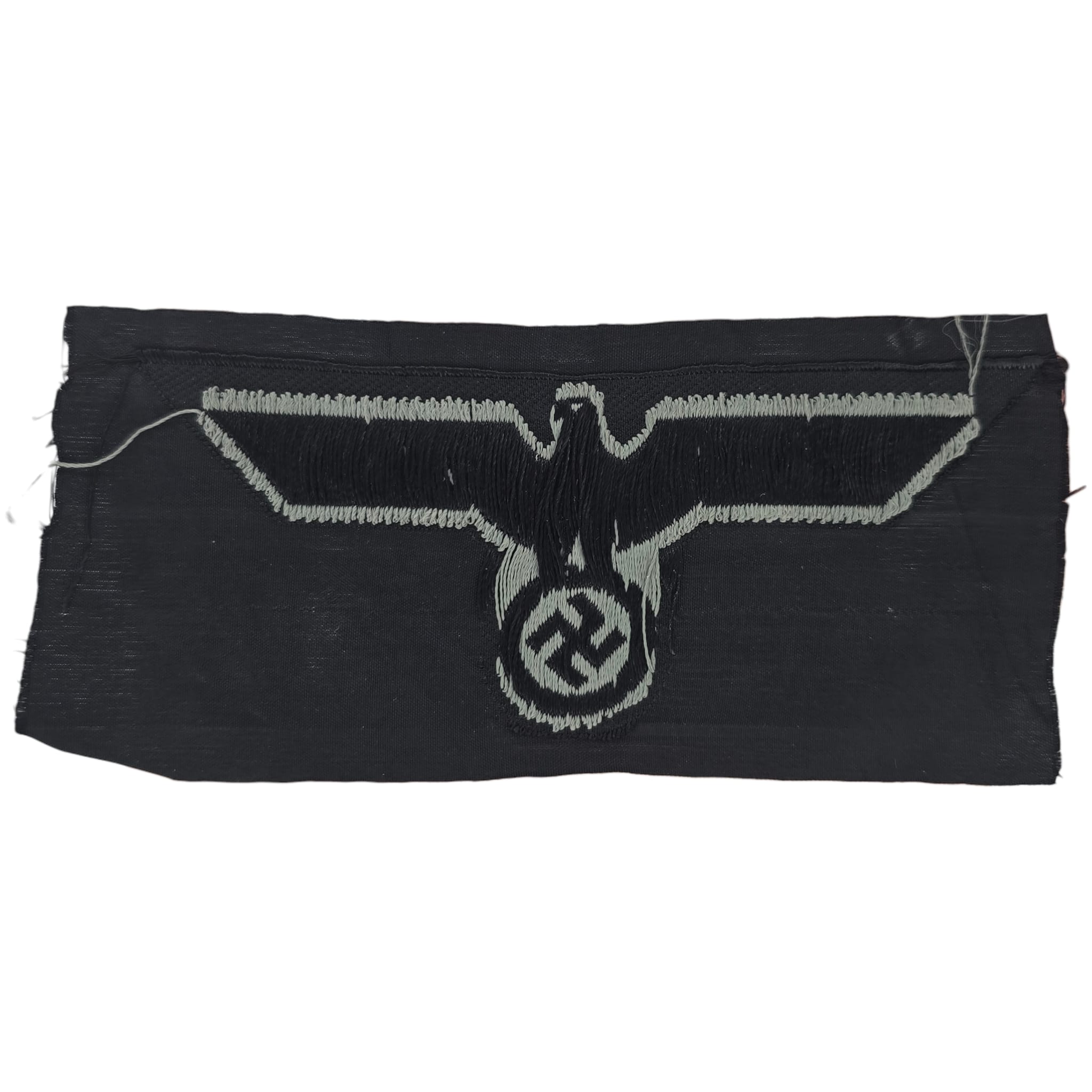 Item: Panzer Breast Eagle / This unissued 2nd Pattern Bevo Panzer Breast Eagle is a textbook original. This style of machine woven breast eagle, with a white German Army eagle and swastika emblem on a black background, was a style that was factory applied on the black wool Panzer wrappers worn by enlisted men and NCOs