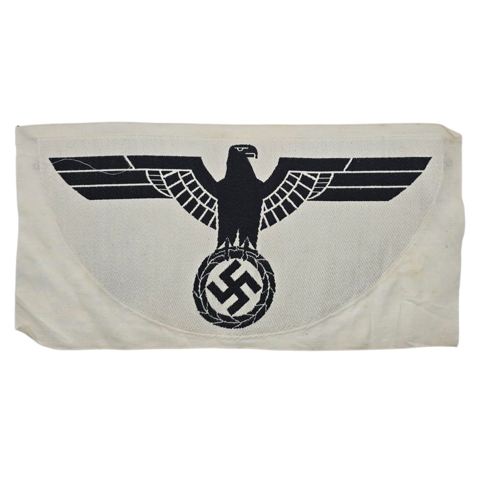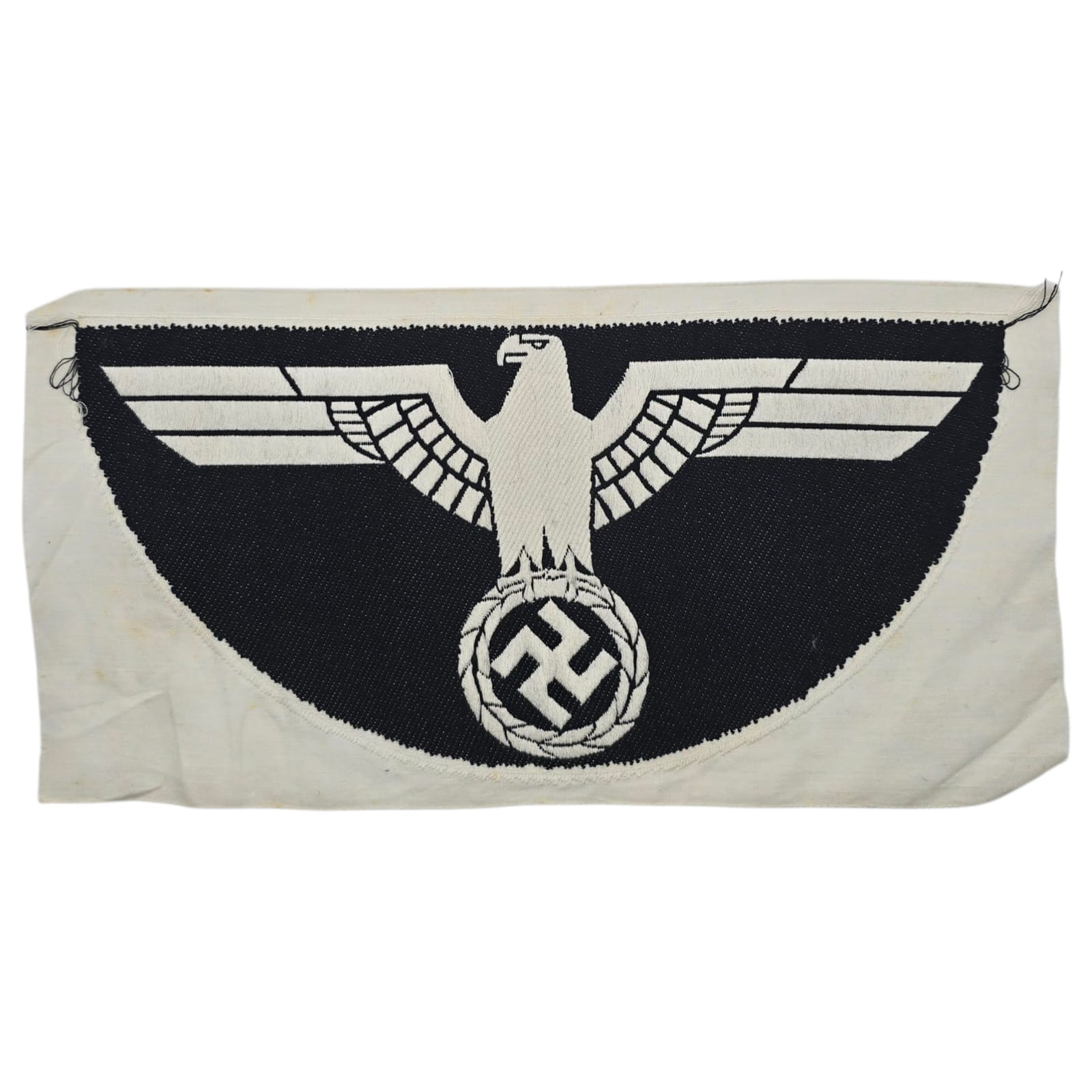 Item: A Wehrmacht (Heer) BeVo sports shirt breast eagle is a woven (BeVo) insignia that was worn on sports shirts by soldiers of the German Army during the Second World War. It served as a simple identification emblem during sports and training activities. These eagles are popular among collectors due to their characteristic fine BeVo weaving technique, lightweight construction, and the fact that they are often less well-preserved because they were used on sports clothing.