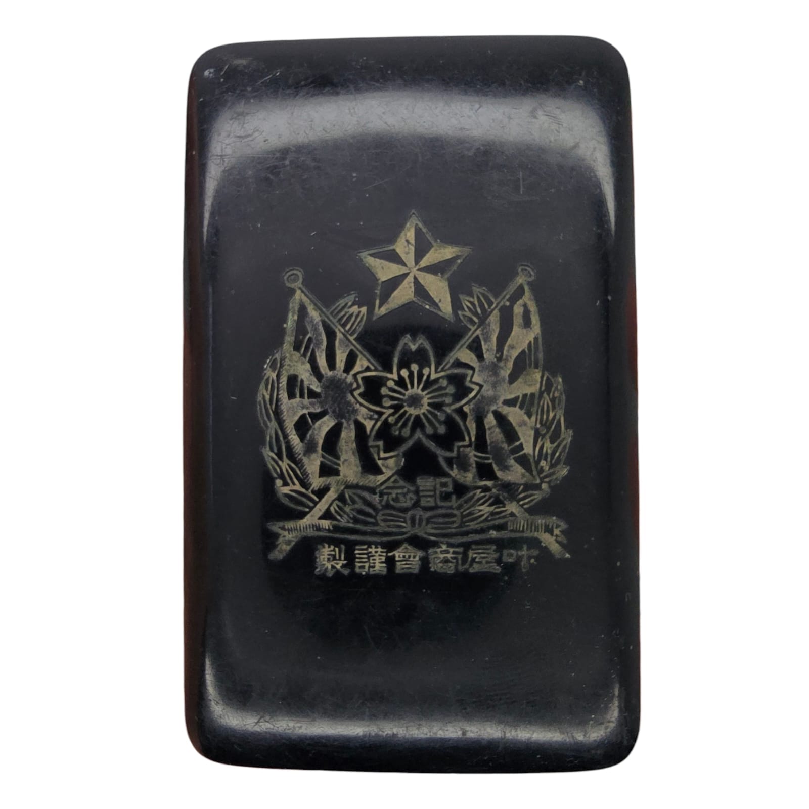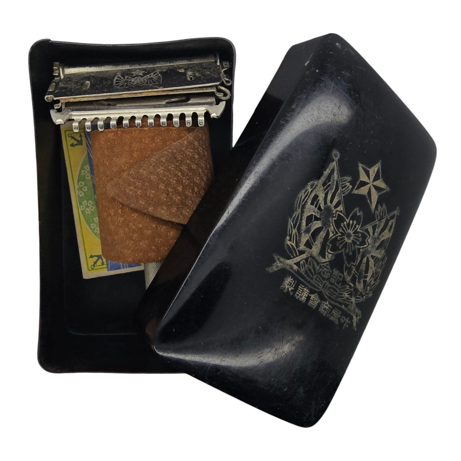 Item: This Japanese shaving set consists of a metal safety razor and a piece of shaving soap in a decorative box. The packaging features two “Rising Sun” flags and a cherry blossom – symbols of the Imperial Japanese Army. The set was used by Japanese soldiers for personal grooming and is a typical example of equipment from that period.