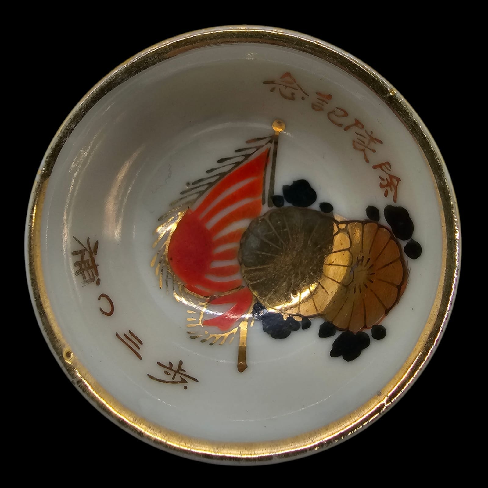 Item: Military sake cups are Japanese ceremonial drinking vessels, often made of ceramic, glass, or metal, and were presented to soldiers during the Imperial Japan era (Meiji, Taisho, and early Showa periods). These cups were often richly decorated with military symbols such as flags, weapons, regiment numbers, and inscriptions honoring service, victories, or retirement. They served as personal souvenirs and mementos of military service