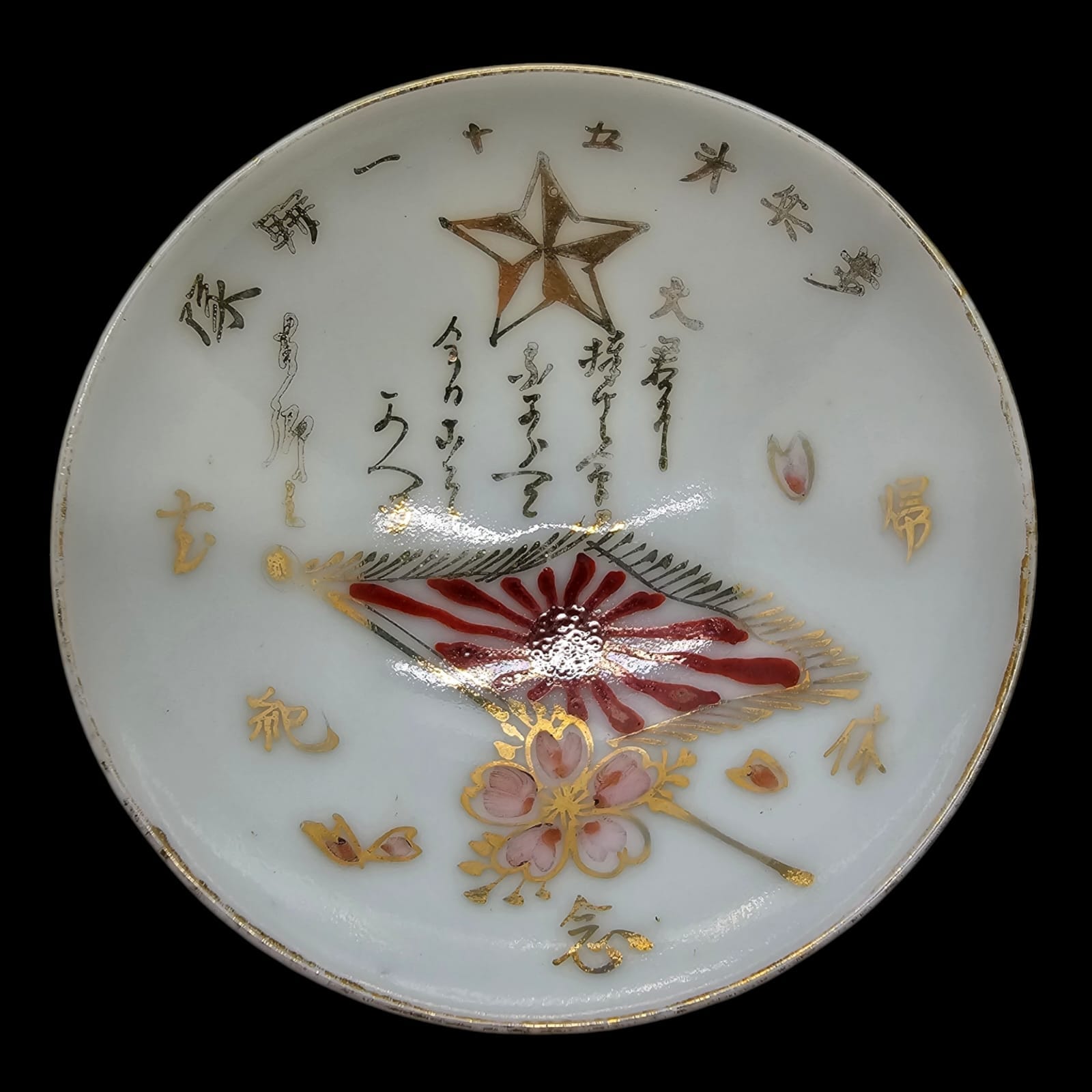 Item: Military sake cups are Japanese ceremonial drinking vessels, often made of ceramic, glass, or metal, and were presented to soldiers during the Imperial Japan era (Meiji, Taisho, and early Showa periods). These cups were often richly decorated with military symbols such as flags, weapons, regiment numbers, and inscriptions honoring service, victories, or retirement. They served as personal souvenirs and mementos of military service
