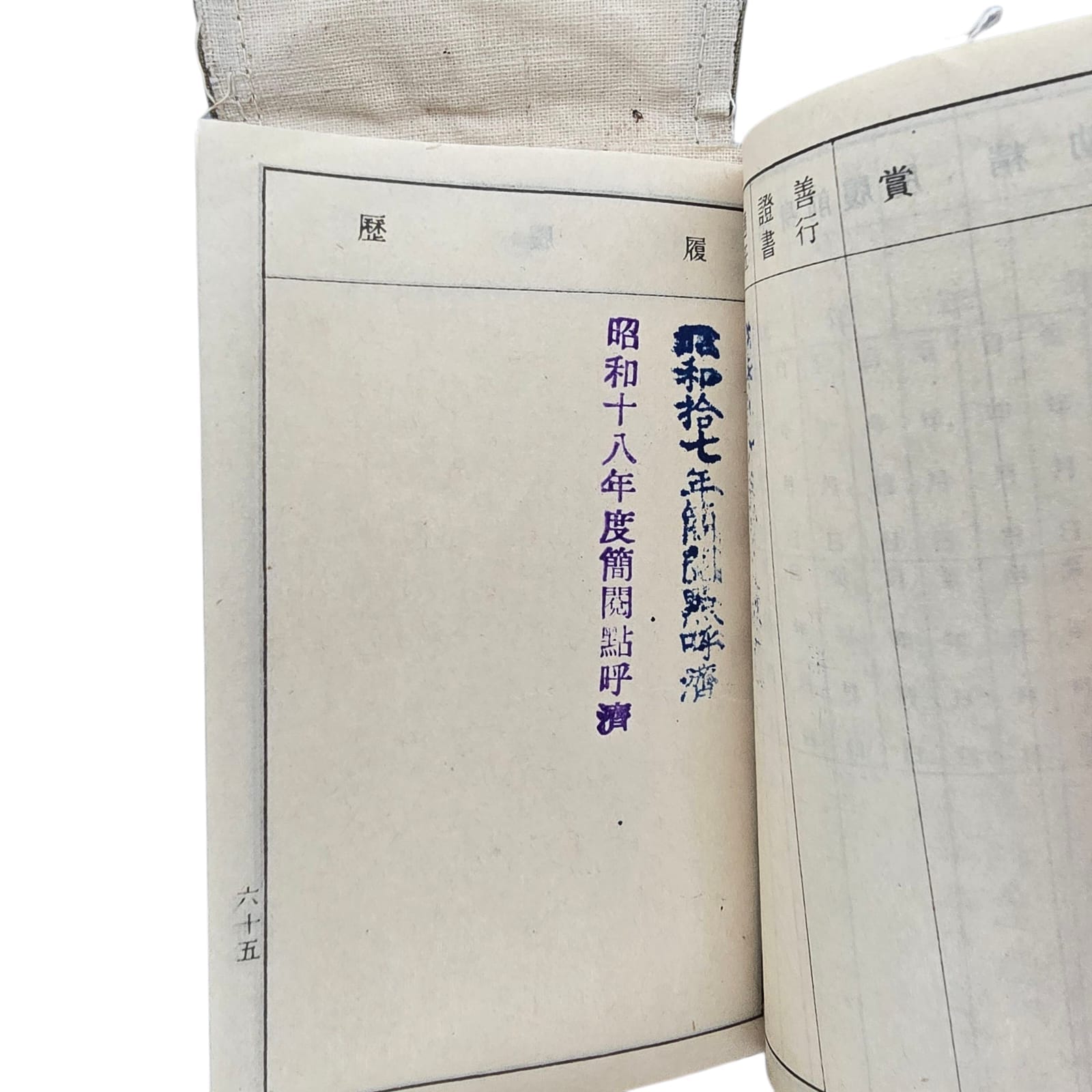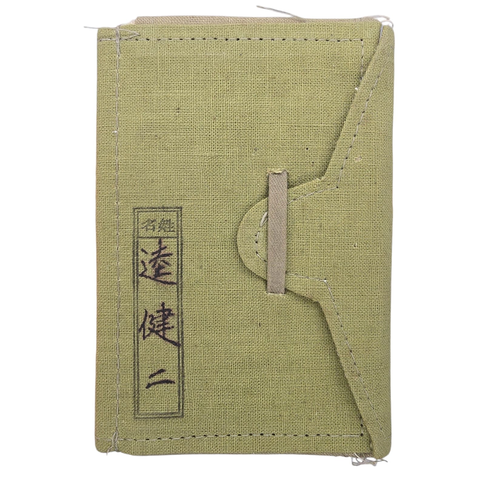Kenichi En, born in 1919 in Asahi Village, Mie Prefecture, was officially called up or examined for military service in 1943 during the Second World War. His soldier’s handbook (Guntai Techō) records his basic personal information and his confirmed presence for military duty. This type of booklet was carried by all Japanese soldiers as their official identity and service record.