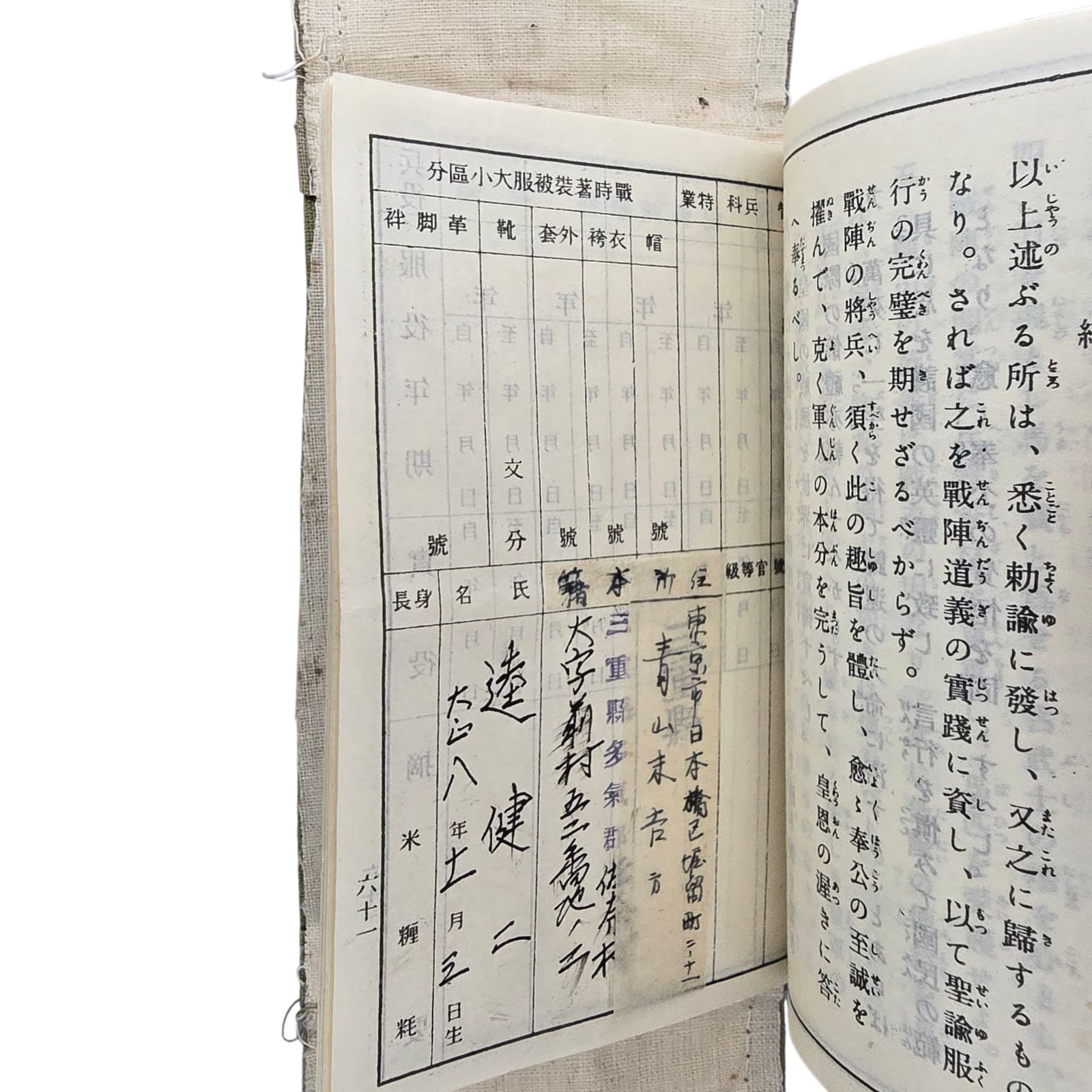 Kenichi En, geboren in 1919 in Asahi-dorp, Mie-prefectuur, werd in 1943 officieel opgeroepen of gecontroleerd voor militaire dienst in het Keizerlijke Japanse Leger. Zijn soldatenboekje (“Guntai Techō”) toont de standaard persoonlijke gegevens en een registratie van zijn militaire aanwezigheid. Dit type boekje werd gedragen door alle Japanse soldaten als hun officiële identiteits- en dienstregistratie.