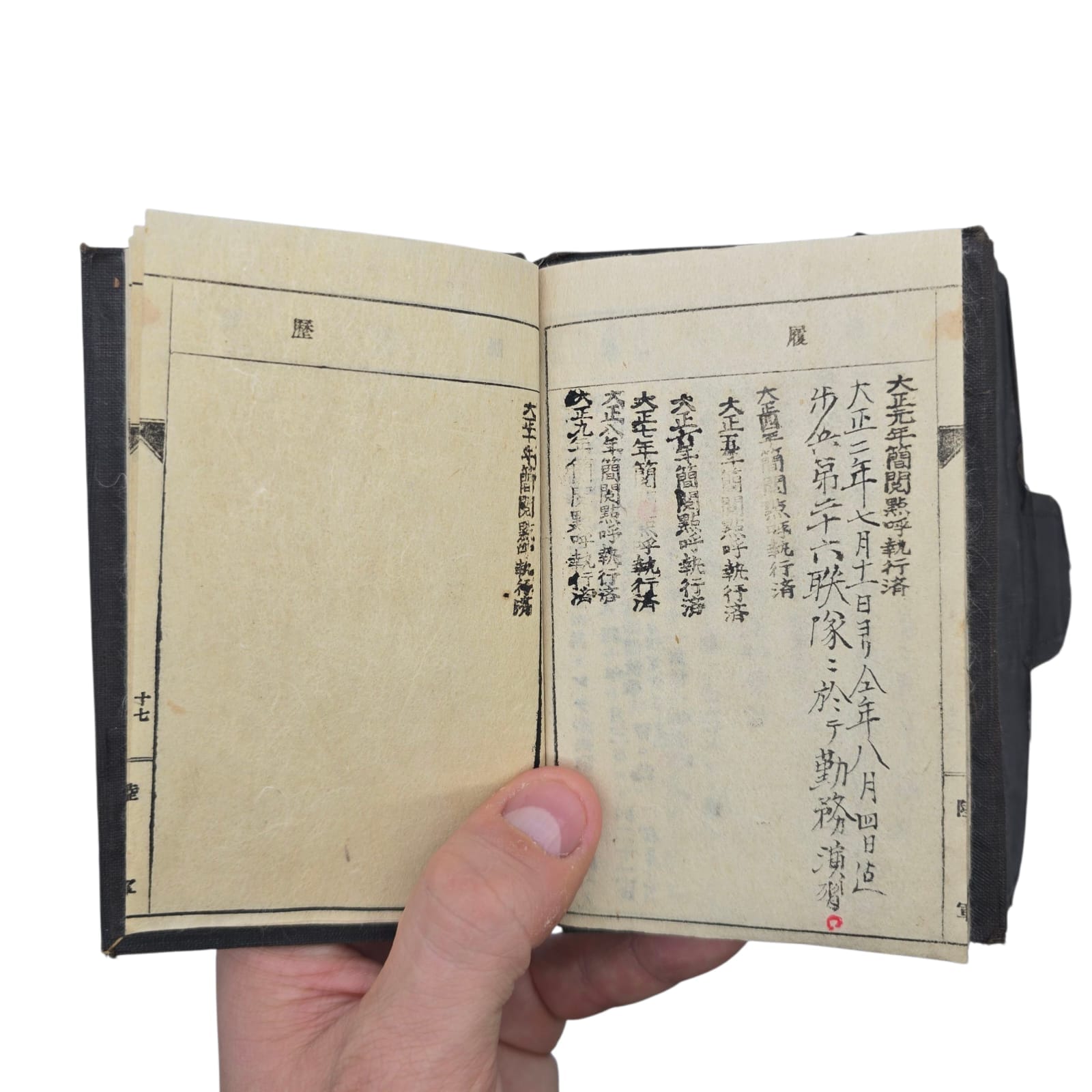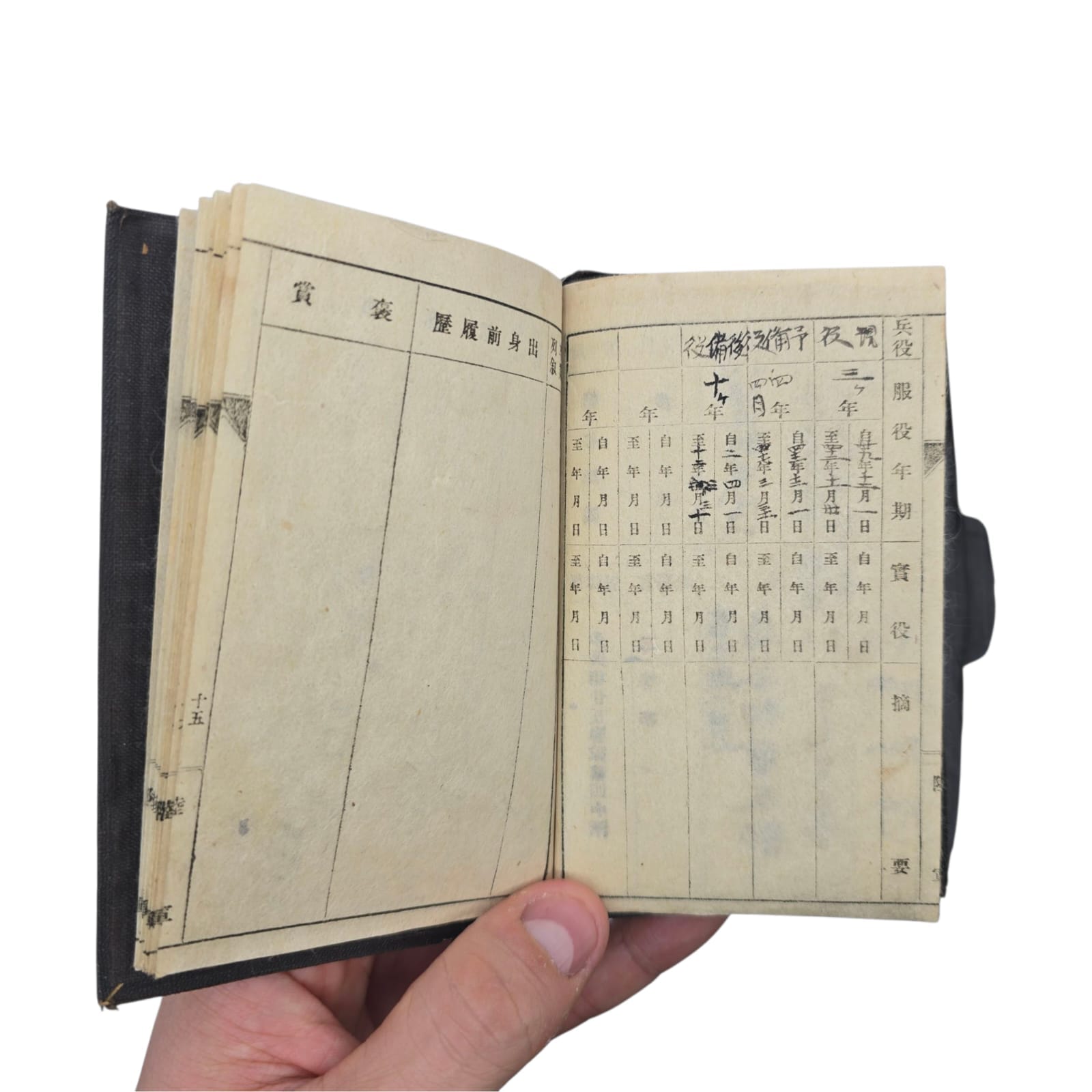 Item: Japanese soldiers received a military service booklet (軍隊手帳 – Guntai Techō) during their time in the Imperial Japanese Army. This booklet served as their official identity, service, and mobilization record. It contains personal information, unit assignment, military training, campaigns, and reserve records. These booklets are significant historical documents and comparable to the German Soldbuch.