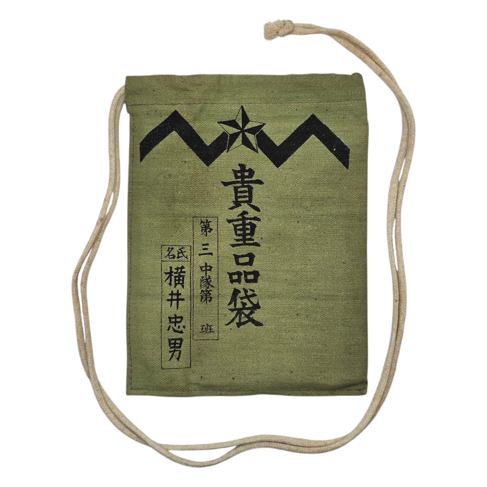 Item: Een Japanse persoonlijke bezittingenzak uit de Tweede Wereldoorlog was een kleine zak van stof of canvas, gebruikt door soldaten om essentiële spullen zoals documenten, toiletartikelen of persoonlijke bezittingen in te bewaren. Deze tassen hadden vaak Japanse markeringen of stempels van een eenheid en weerspiegelden het dagelijkse leven en de organisatie van het Japanse Keizerlijke Leger tijdens de oorlog. Tegenwoordig zijn ze waardevolle verzamelobjecten die een inkijk geven in de persoonlijke kant van de militaire geschiedenis.
