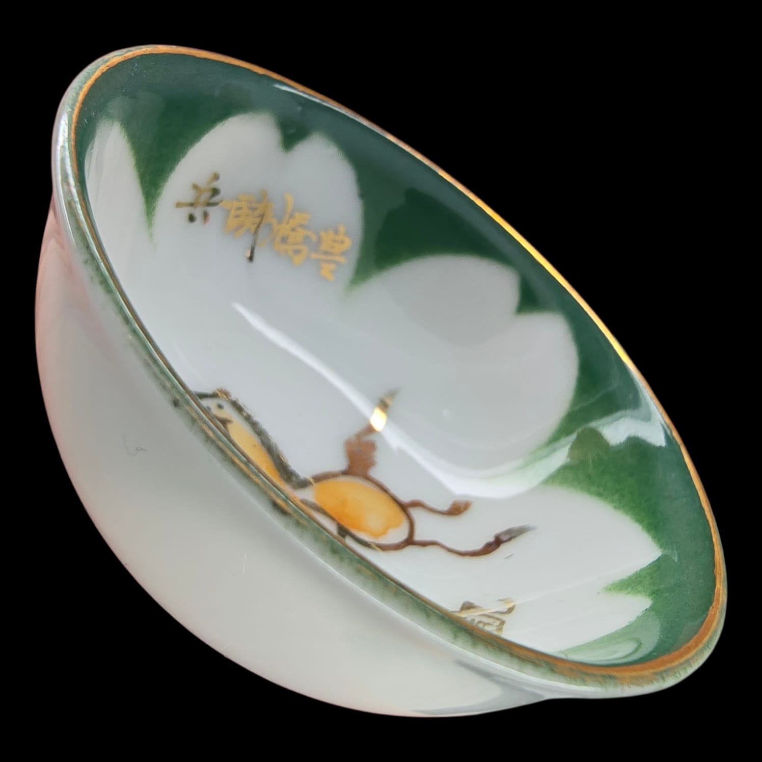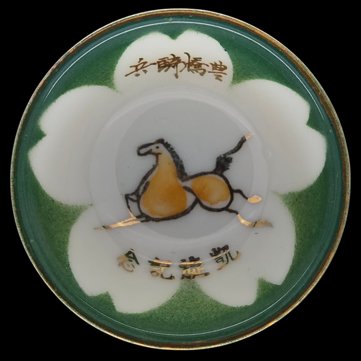 Item: Military sake cups are Japanese ceremonial drinking vessels, often made of ceramic, glass, or metal, and were presented to soldiers during the Imperial Japan era (Meiji, Taisho, and early Showa periods). These cups were often richly decorated with military symbols such as flags, weapons, regiment numbers, and inscriptions honoring service, victories, or retirement. They served as personal souvenirs and mementos of military service