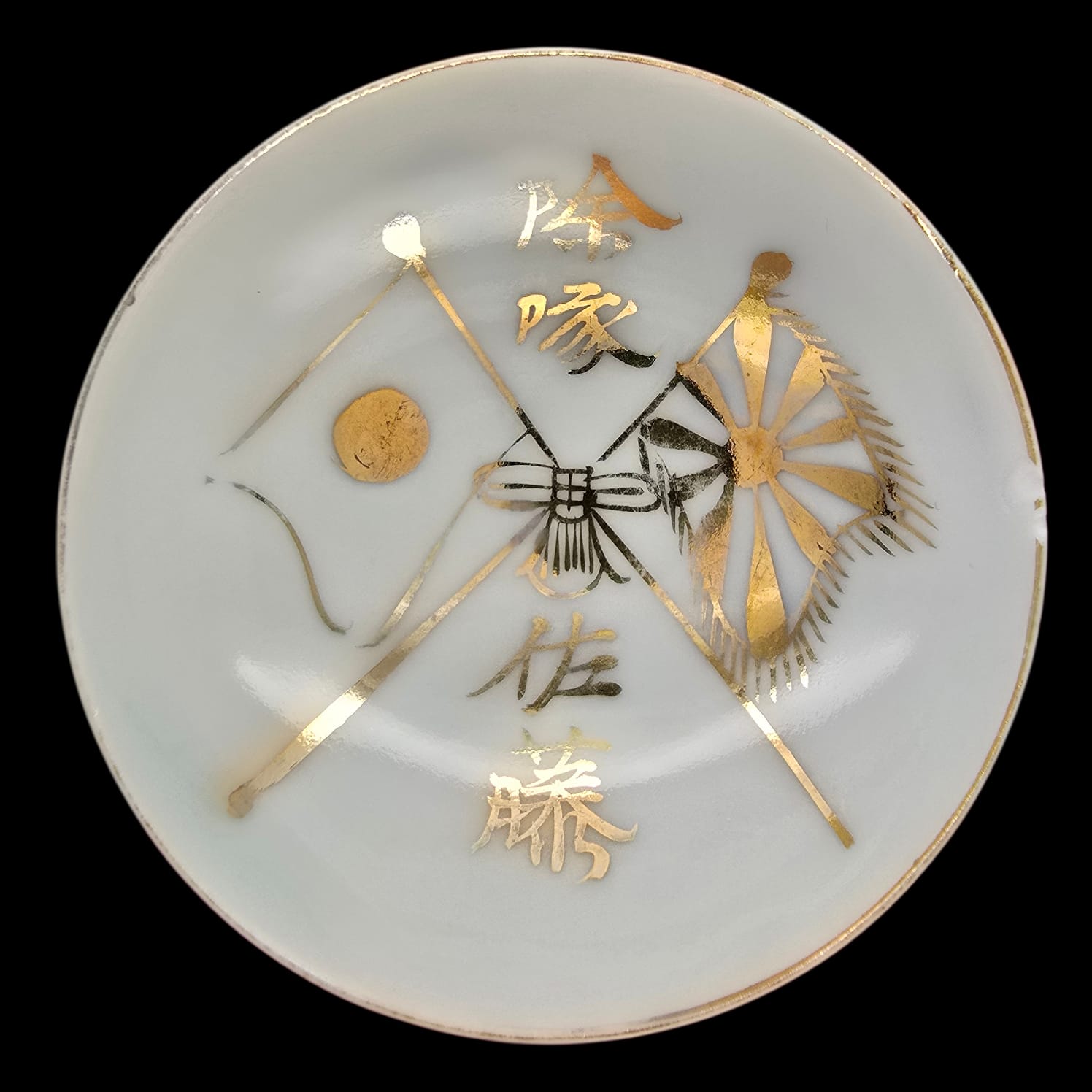 Item: Military sake cups are Japanese ceremonial drinking vessels, often made of ceramic, glass, or metal, and were presented to soldiers during the Imperial Japan era (Meiji, Taisho, and early Showa periods). These cups were often richly decorated with military symbols such as flags, weapons, regiment numbers, and inscriptions honoring service, victories, or retirement. They served as personal souvenirs and mementos of military service