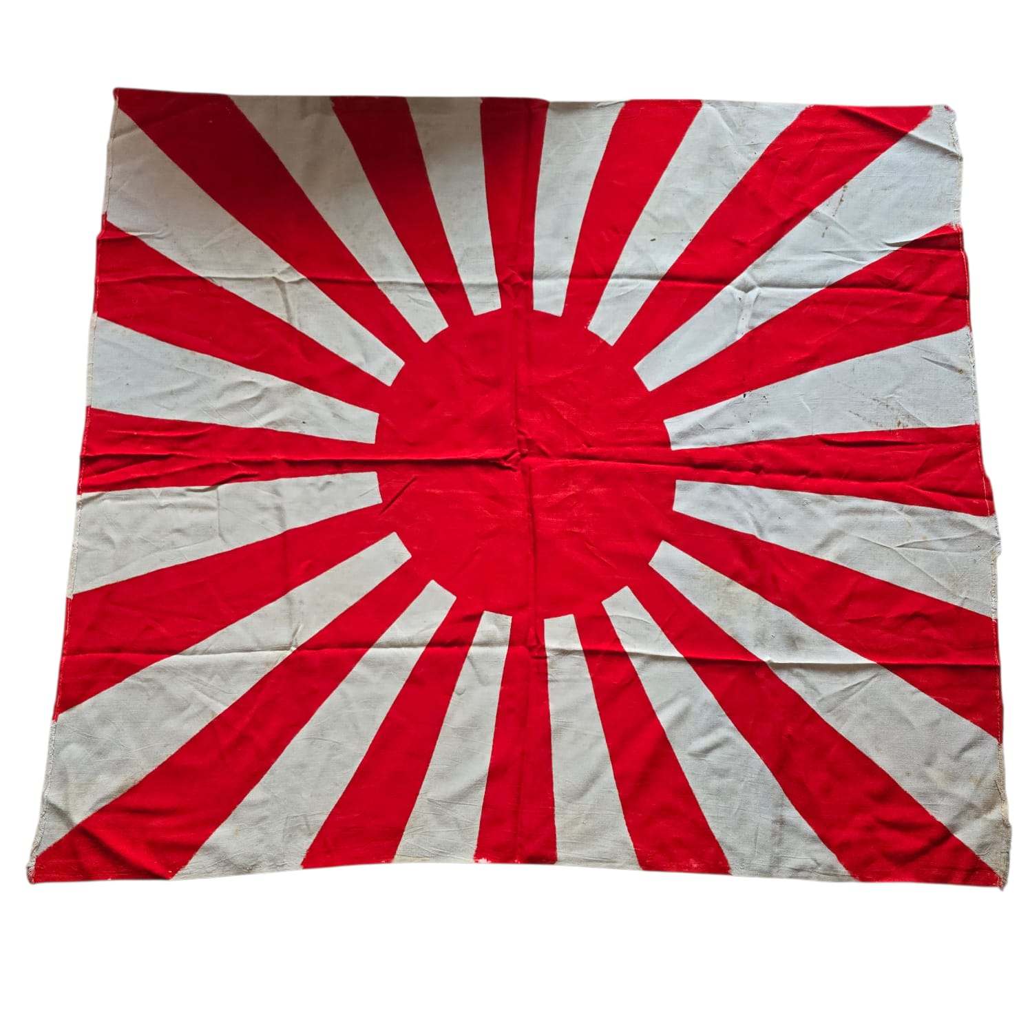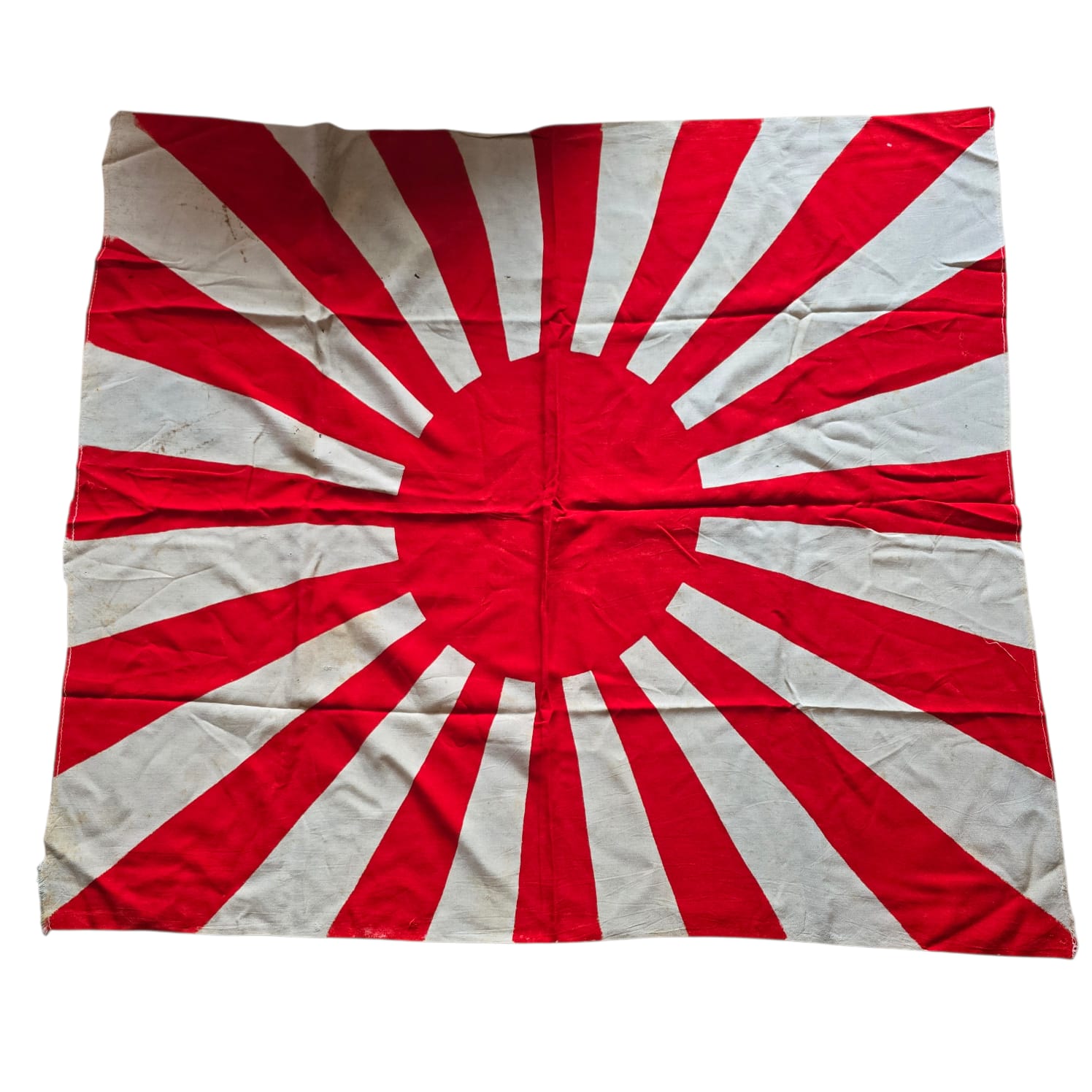 Item: The Japanese Rising Sun flag (Kyokujitsu-ki) was a military symbol of the Imperial Japanese Army and Navy during the Second World War. The flag features a red sun with radiating rays and symbolizes honor, loyalty, and Japan as the “Land of the Rising Sun.” During WWII, these flags were used at ceremonies, on ships and vehicles, and were often personally taken onto the battlefield by soldiers.