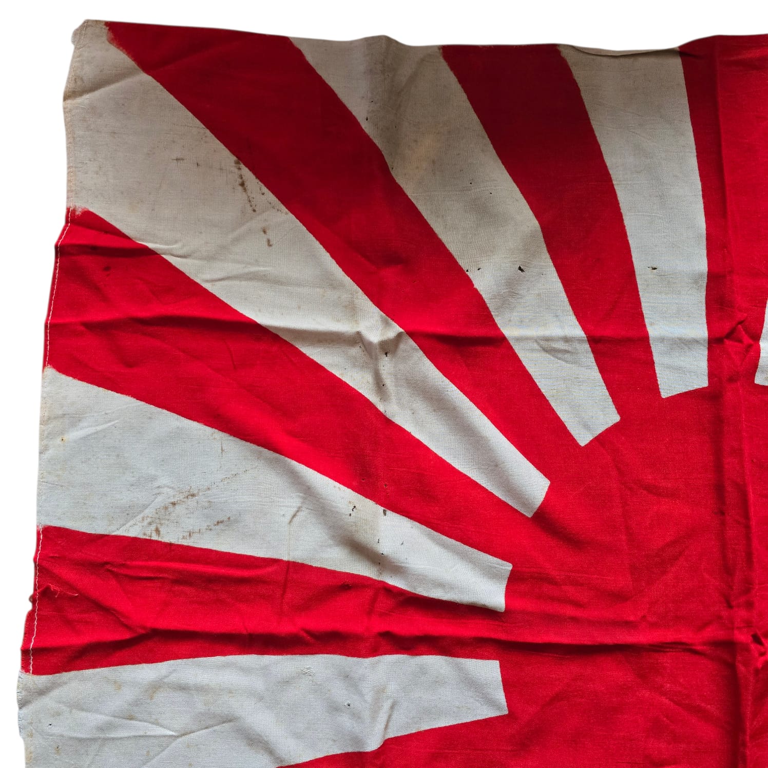 De vlag vertoont diverse gebruikssporen, passend bij de leeftijd en het oorspronkelijke gebruik. Deze sporen dragen juist bij aan de mooie, authentieke verouderde uitstraling van het object. Rising Sun-vlaggen werden tijdens de Tweede Wereldoorlog veelvuldig gebruikt als oorlogsvlag van Japan en werden vaak door groepen soldaten meegenomen naar het strijdtoneel.