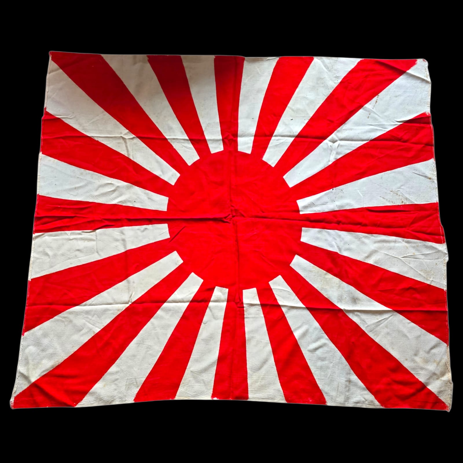 Item: De Japanse Rising Sun-vlag (Kyokujitsu-ki) was een militair symbool van het Japanse Keizerlijke Leger en de Marine tijdens de Tweede Wereldoorlog. De vlag toont een rode zon met uitstralende zonnestralen en staat symbool voor eer, loyaliteit en Japan als “land van de rijzende zon”. Tijdens WOII werden deze vlaggen gebruikt bij ceremonies, op schepen en voertuigen, en vaak persoonlijk door soldaten meegenomen het strijd toneel op!
