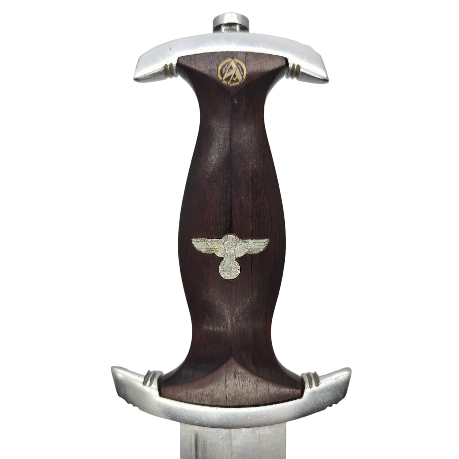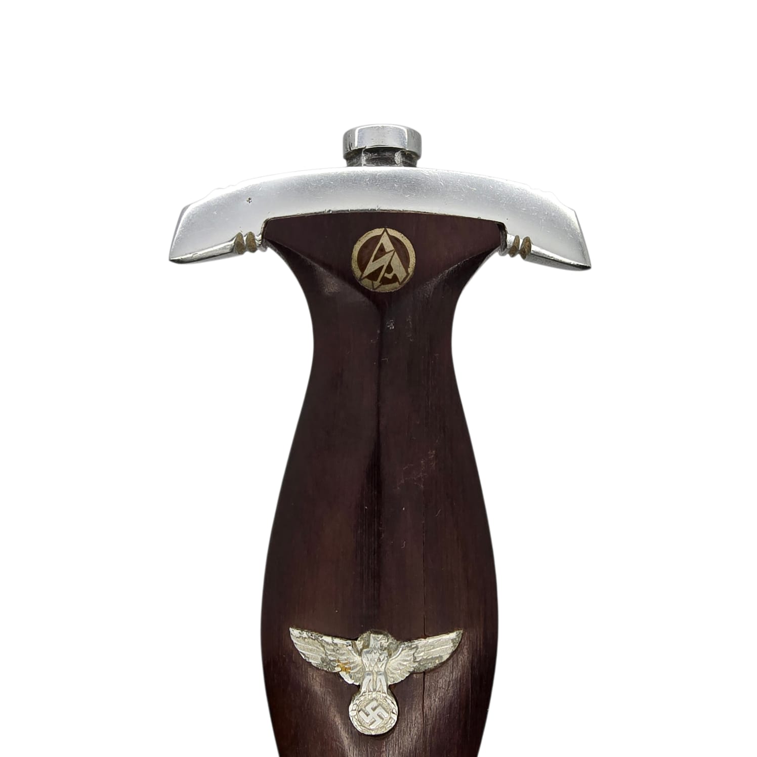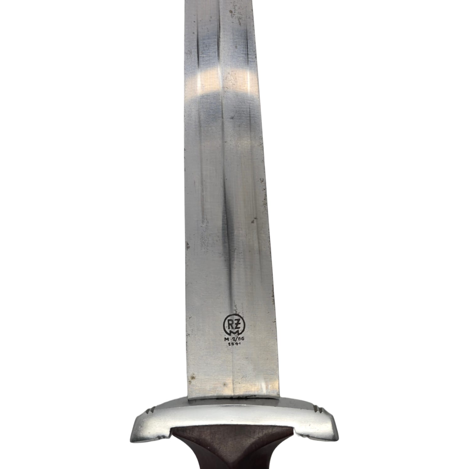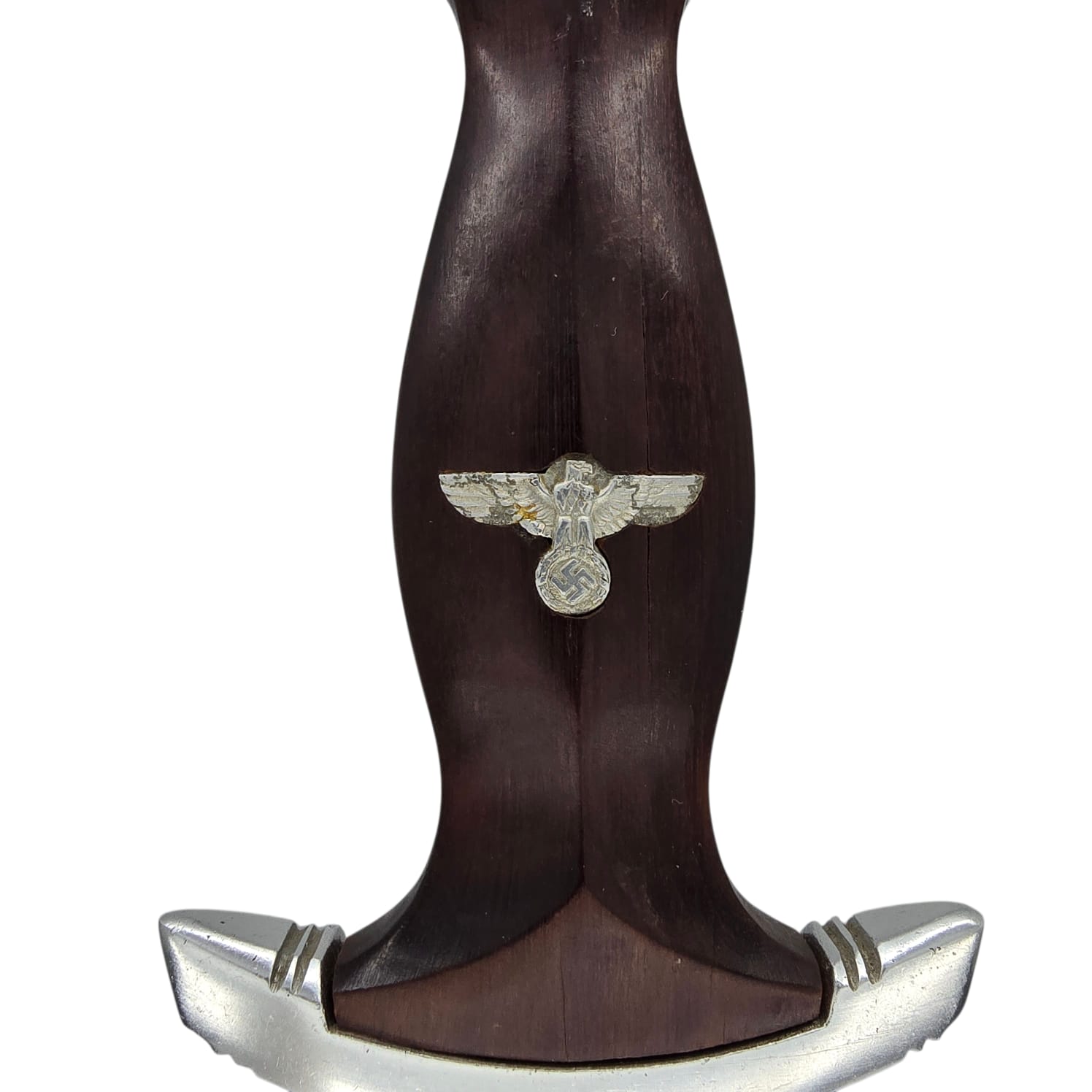 The crossguards are made of aluminum, which is very rare and is also documented in the reference book by Ralph Siegert. The eagle emblem and the wooden grip are also in good condition, appropriate for their age. The dagger is offered complete with its original RZM hanger.