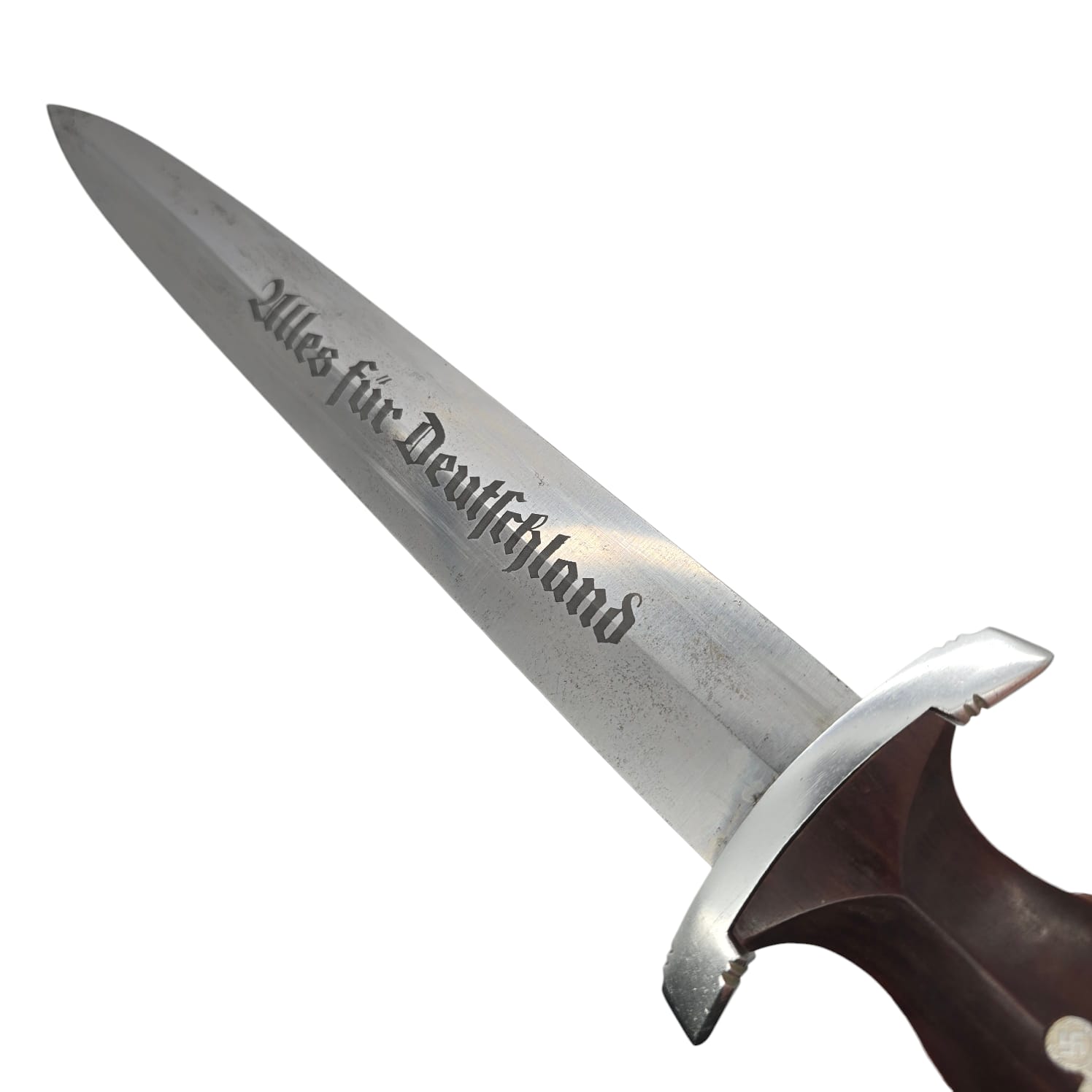 Item: The NSKK service dagger is a ceremonial dagger from the Second World War, worn by members of the NSKK (National Socialist Motor Corps). The design is almost identical to the SA service dagger and it was worn as part of the uniform, not intended as a combat weapon. Characteristic features include the straight blade (often etched with the motto “Alles für Deutschland”), the brown wooden grip, and the metal scabbard.