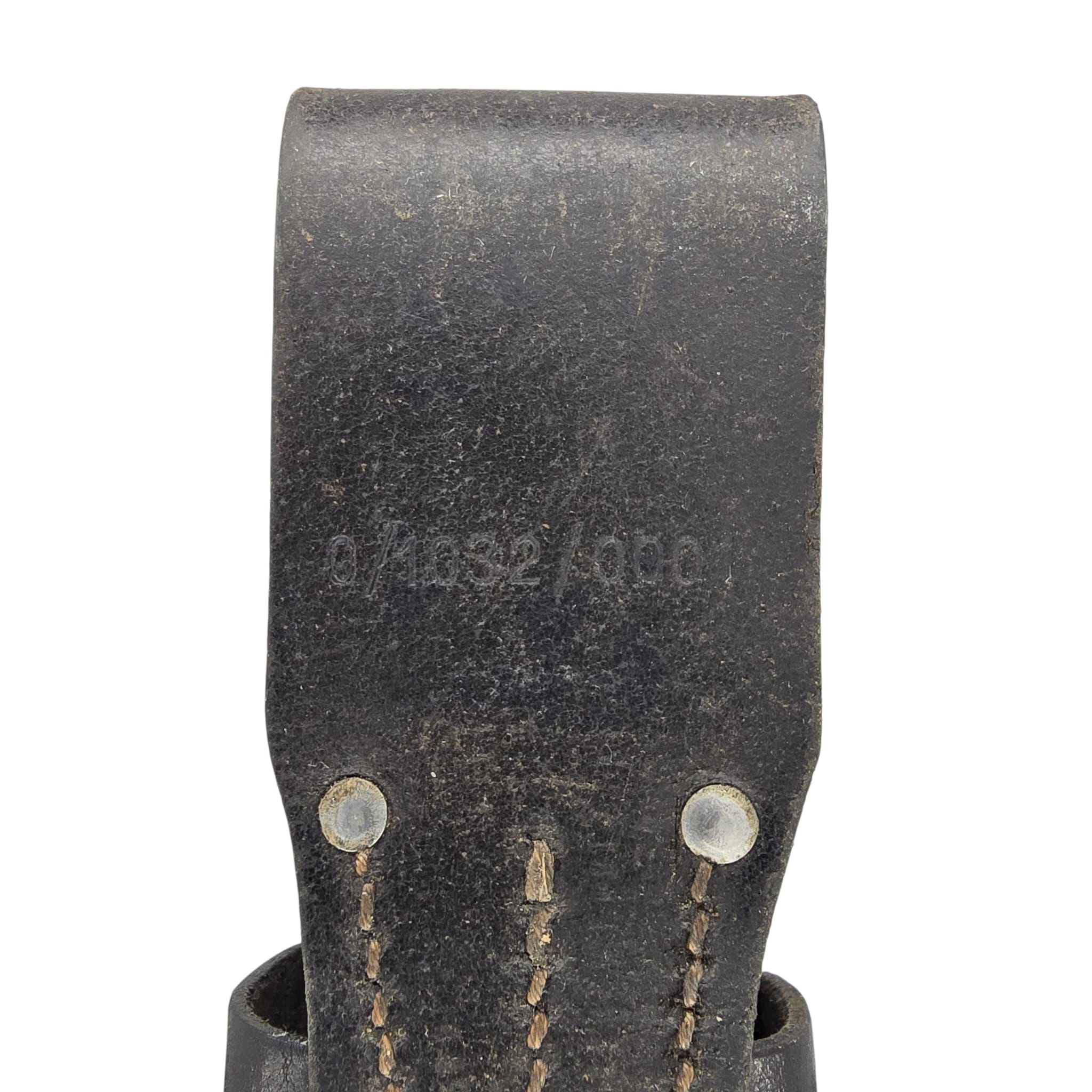 The K98 bayonet was typically carried in a leather frog (Seitengewehrtragetasche) attached to the soldier’s equipment belt. It was often worn in combination with the field shovel and its carrier, forming part of the standard gear issued to German infantry during World War II.